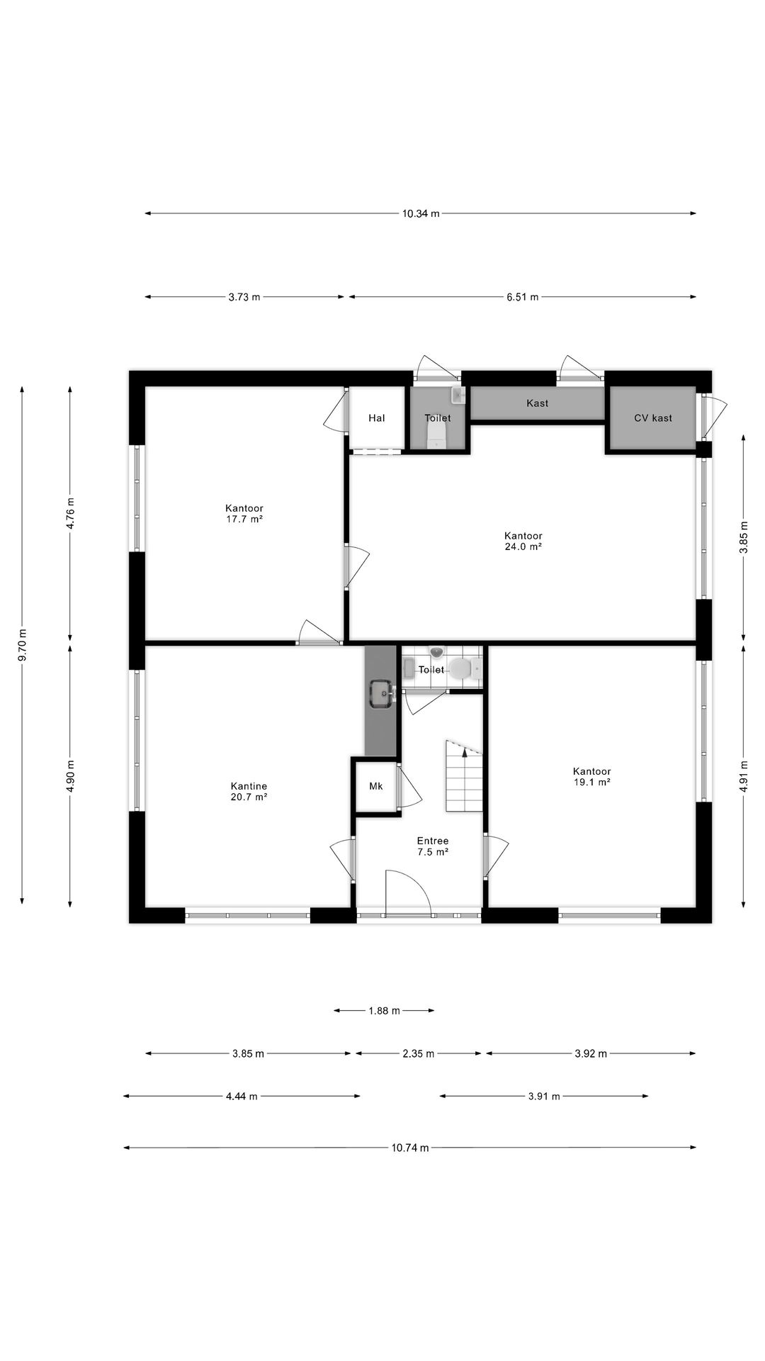 Independent central front entrance, hallway with utility cupboard and a separate toilet area, various office, storage, and canteen/pantry spaces.