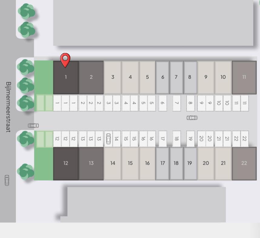 Voor het pand liggen drie privéparkeerplaatsen. Vanaf de straatzijde is dit de eerste unit van het gebouw, waardoor het gemakkelijk bereikbaar is.
