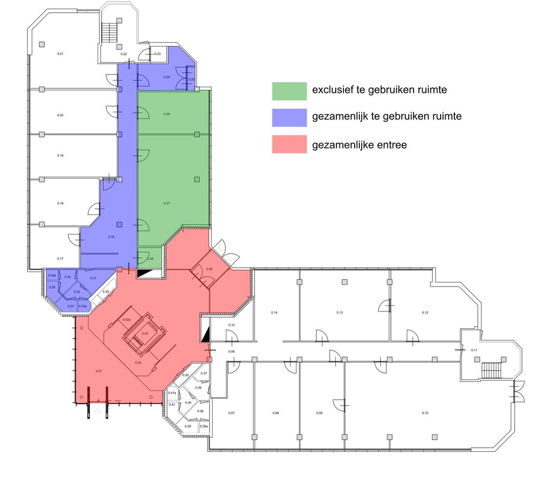 Gezamenlijke entree met de andere gebruikers in het gebouw, exclusief te gebruiken vleugel waarin diverse kantoren van uiteenlopende grootte, pantry en toiletruimte.