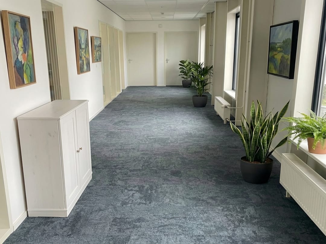 Entree met trap naar de verdieping, 3 kantoren, open werkruimte, toilet en keuken