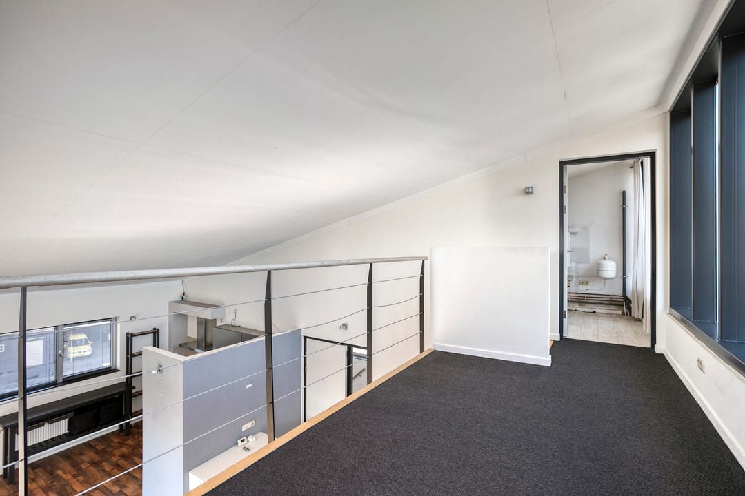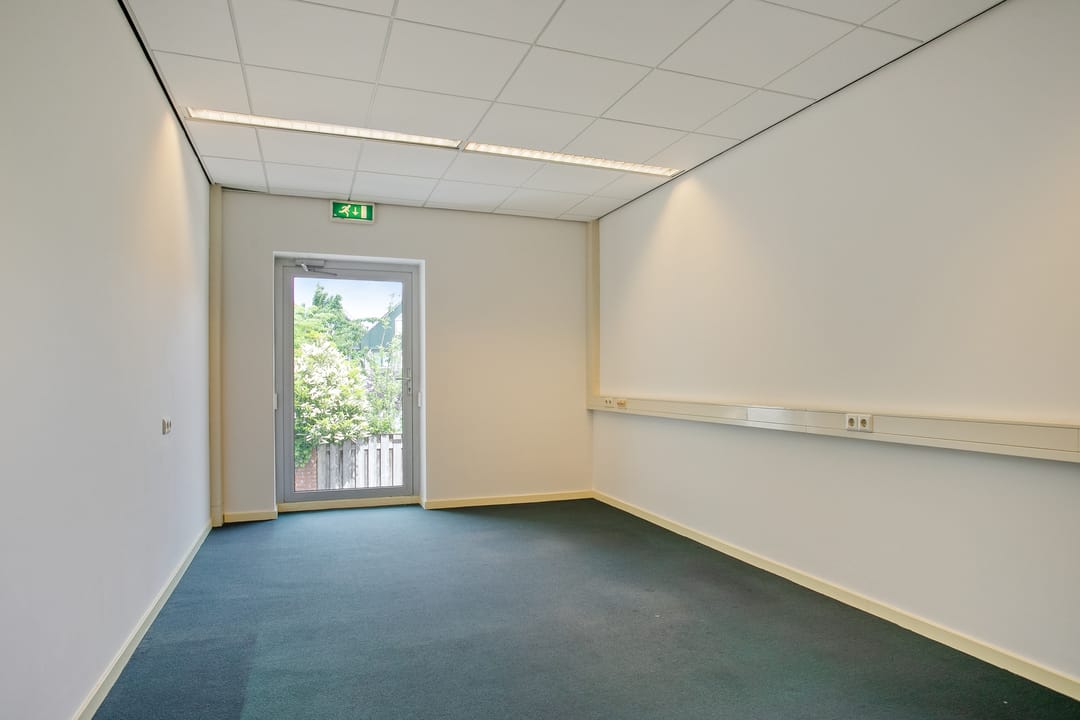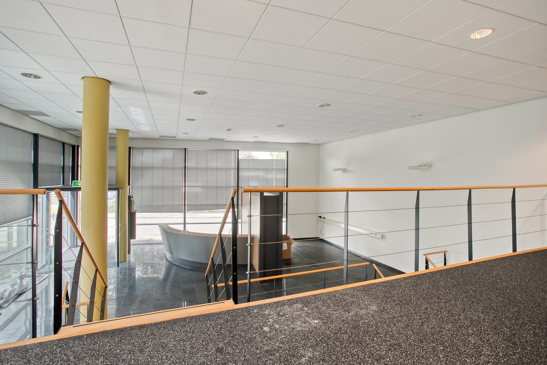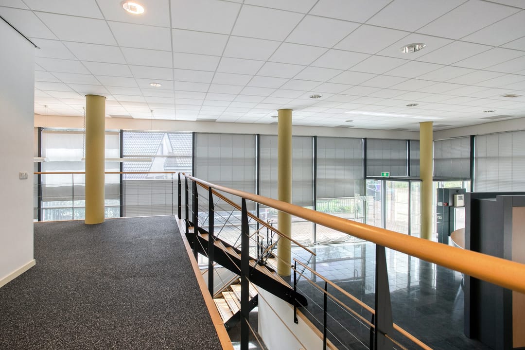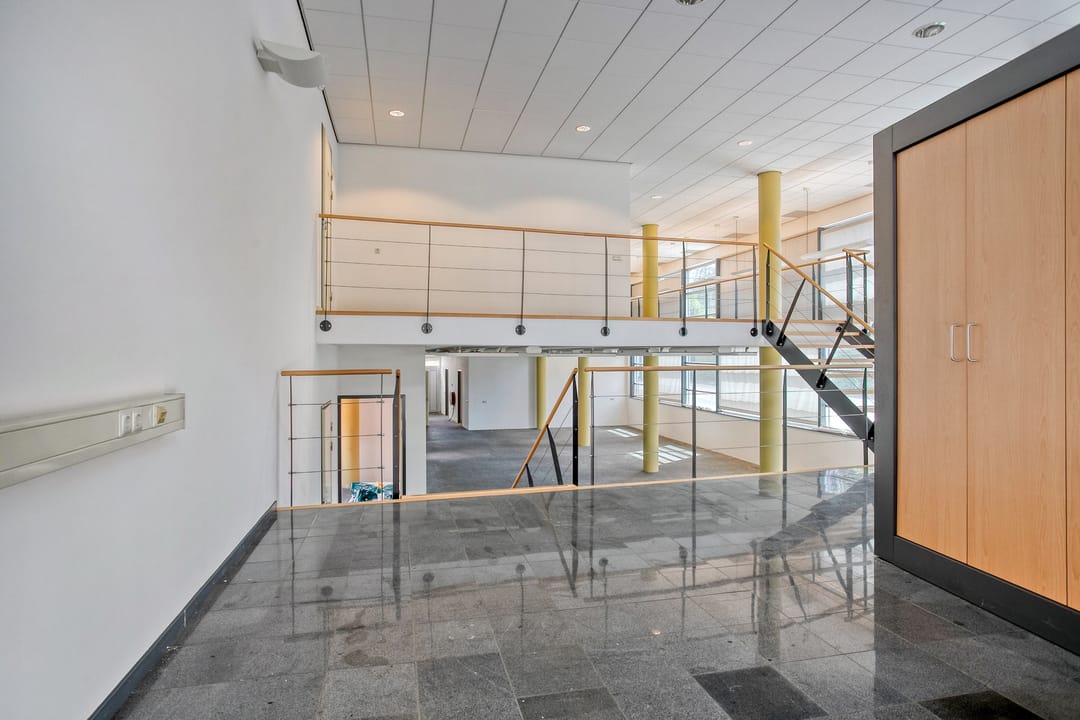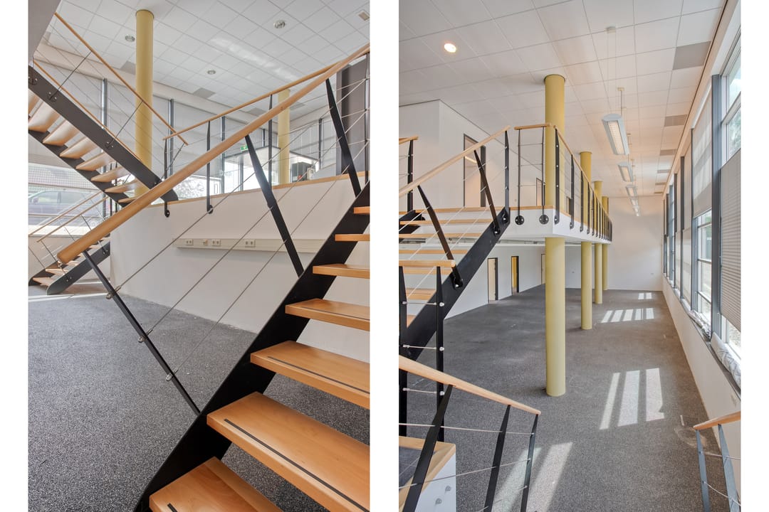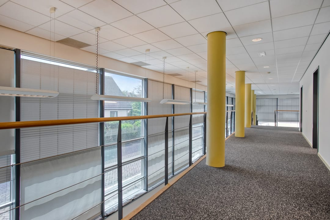 1e verdieping: zes royale kantoor-/spreekkamers, sanitaire voorzieningen en een fraaie vide/gang met zicht op de onderliggende kantoortuin. De grote raampartijen zorgen voor veel daglicht en geven het pand een open, moderne uitstraling.