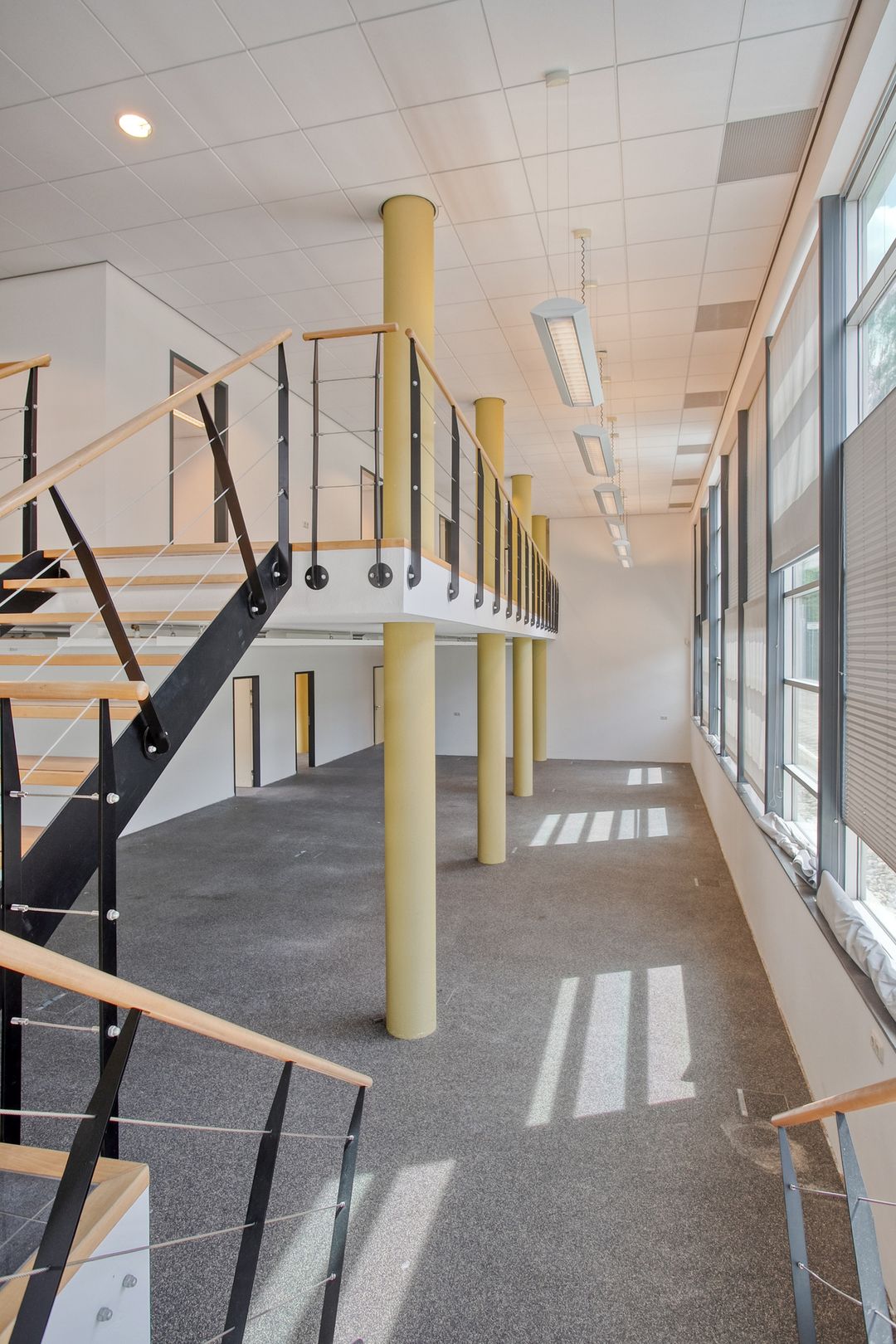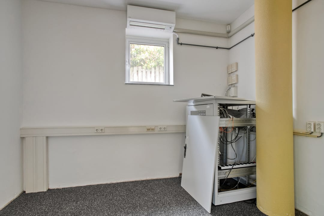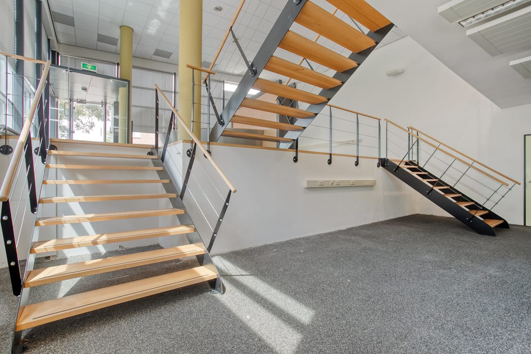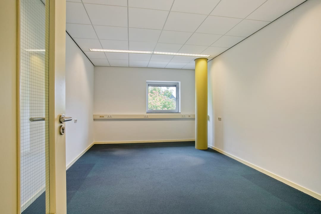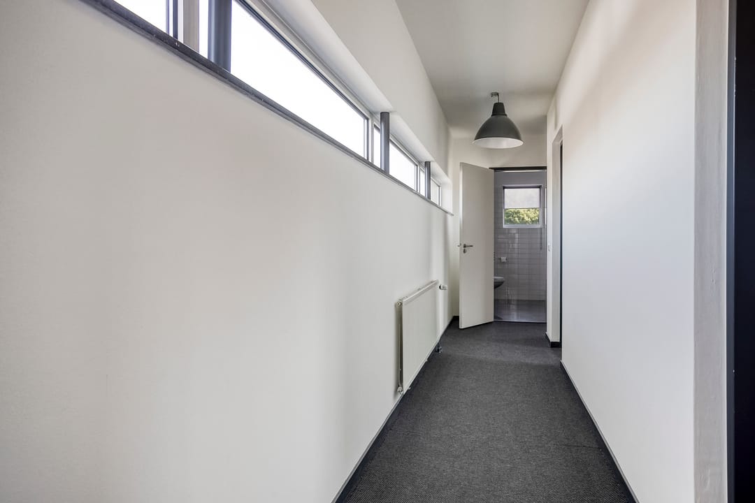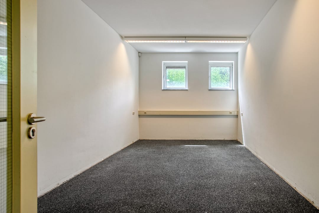 1e verdieping: zes royale kantoor-/spreekkamers, sanitaire voorzieningen en een fraaie vide/gang met zicht op de onderliggende kantoortuin. De grote raampartijen zorgen voor veel daglicht en geven het pand een open, moderne uitstraling.