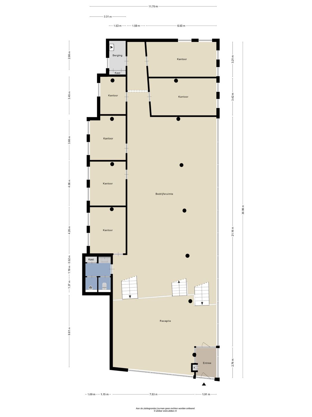 Begane grond (deels verdiept): entree via tochtportaal, receptie, kantoortuin, diverse afzonderlijke spreek- en kantoorruimtes, sanitaire voorzieningen en een technische ruimte.