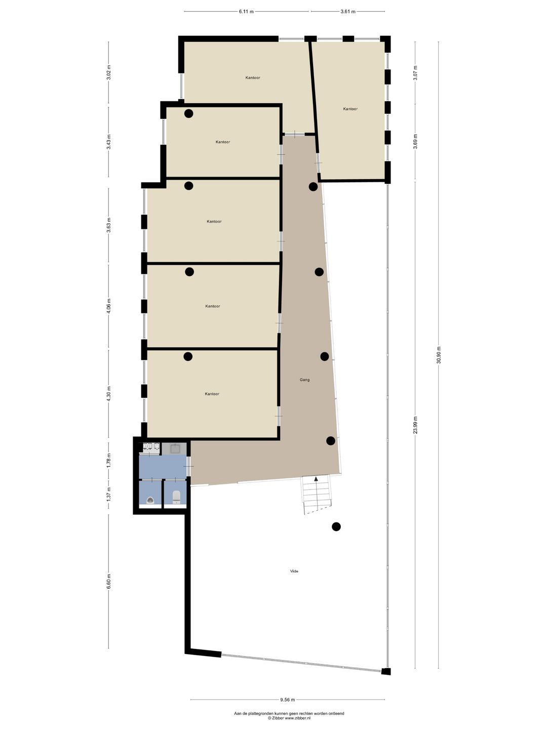 - Kantoorpand: 584 m² BVO / 534 m² VVO, verdeeld over 2 verdiepingen