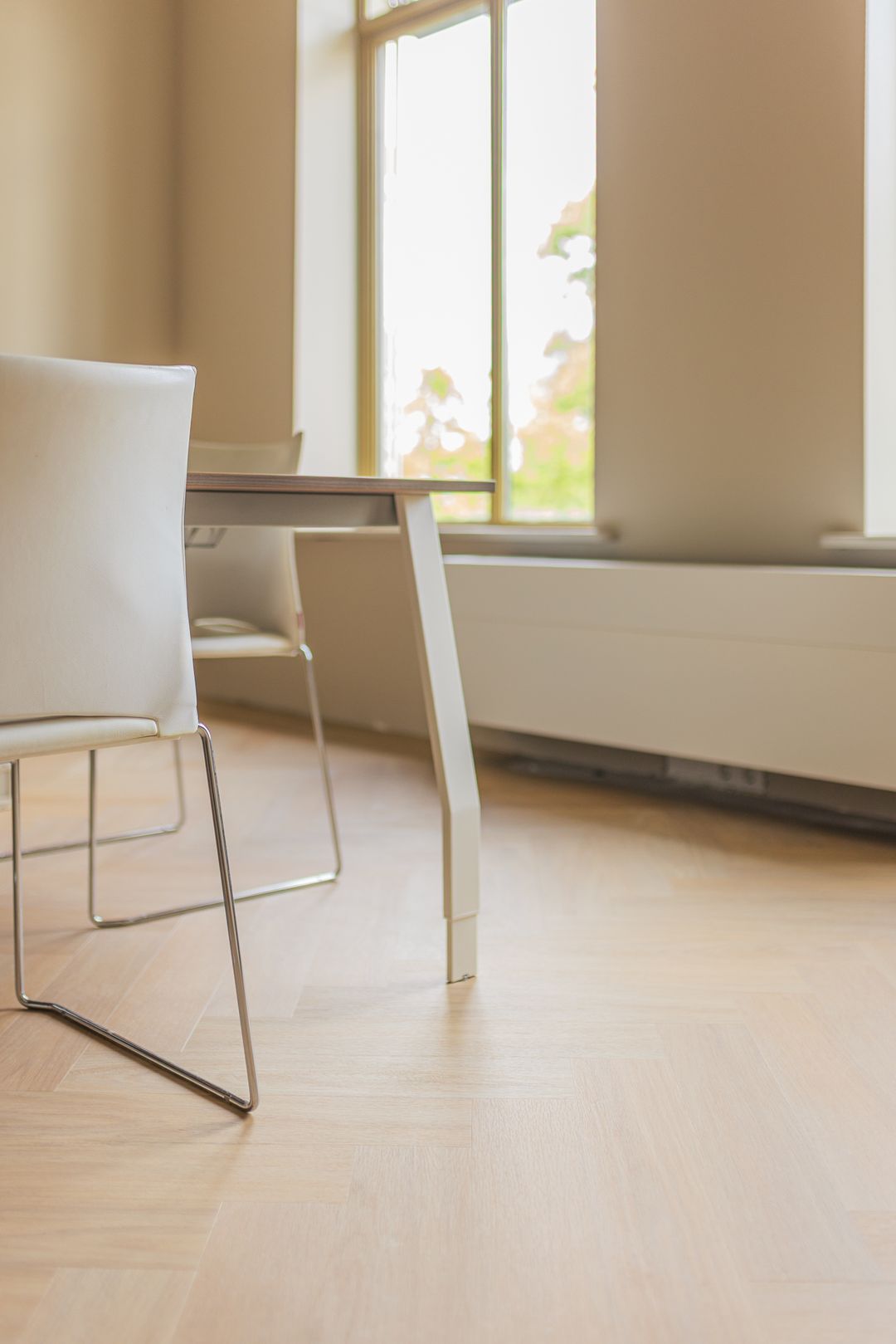 De villa ondergaat een stijlvolle transformatie waarbij het authentieke karakter behouden blijft. Denk aan luxe visgraat PVC-vloeren, strak gestucte plafonds en moderne airconditioning. De knipoog naar het hotelverleden maakt dit pand tot een unieke en inspirerende werkplek.