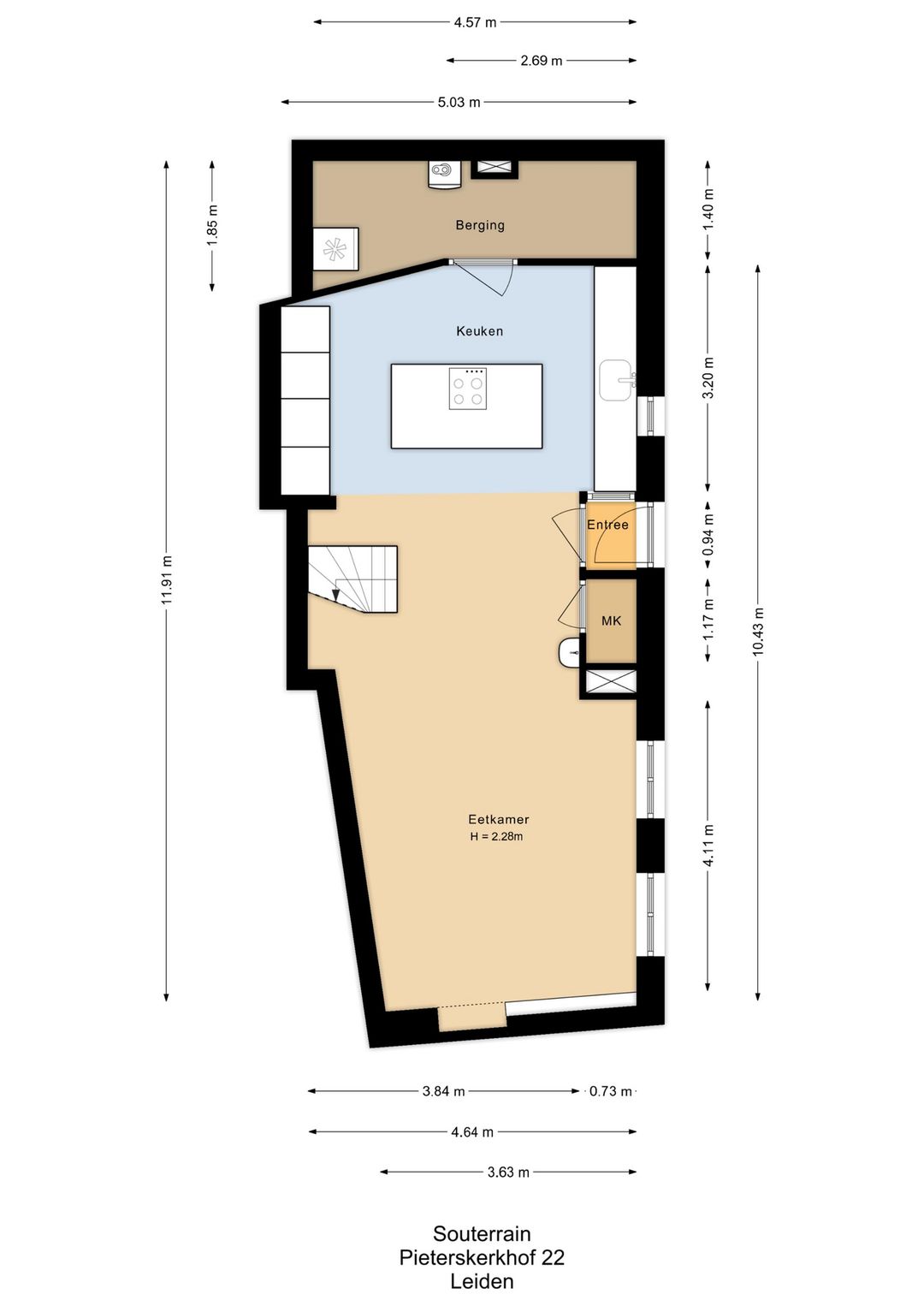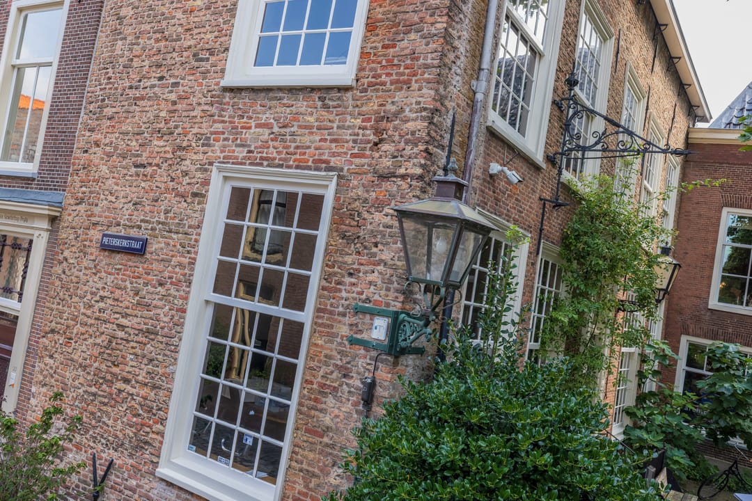 Al bij de aanblik wordt duidelijk dat dit pand een bijzondere ervaring biedt. Het ademt historie door de bakstenen gevel, het natuurstenen bordes en de roede verdeelde ruiten. De centrale entree heeft zichtbare oude houtenplafonds en details die herinneren aan de bouwtijd rond 1500. De hoogte en karakteristieke balken creëren een indrukwekkend gevoel van ruimte en authenticiteit terwijl de glazen scheidingswanden met stalen profielen zorgen voor een mooi modern contrast. Aan de linkerzijde ligt een royale kamer die dankzij de hoge ramen een prachtige lichtinval heeft met uitzicht op de rustige straat met de Pieterskerk om de hoek. Het is een ruimte die zich leent voor een representatieve ontvangst, een royale woonkamer of zelfs een combinatie van wonen en werken. De rechterzijde van de begane grond biedt toegang tot een leefruimte waar dezelfde sfeer voelbaar is. Hier zijn eveneens de monumentale elementen op stijlvolle wijze samengebracht met modernere voorzieningen. Er is een ruim toilet met fonteintje en een berging.