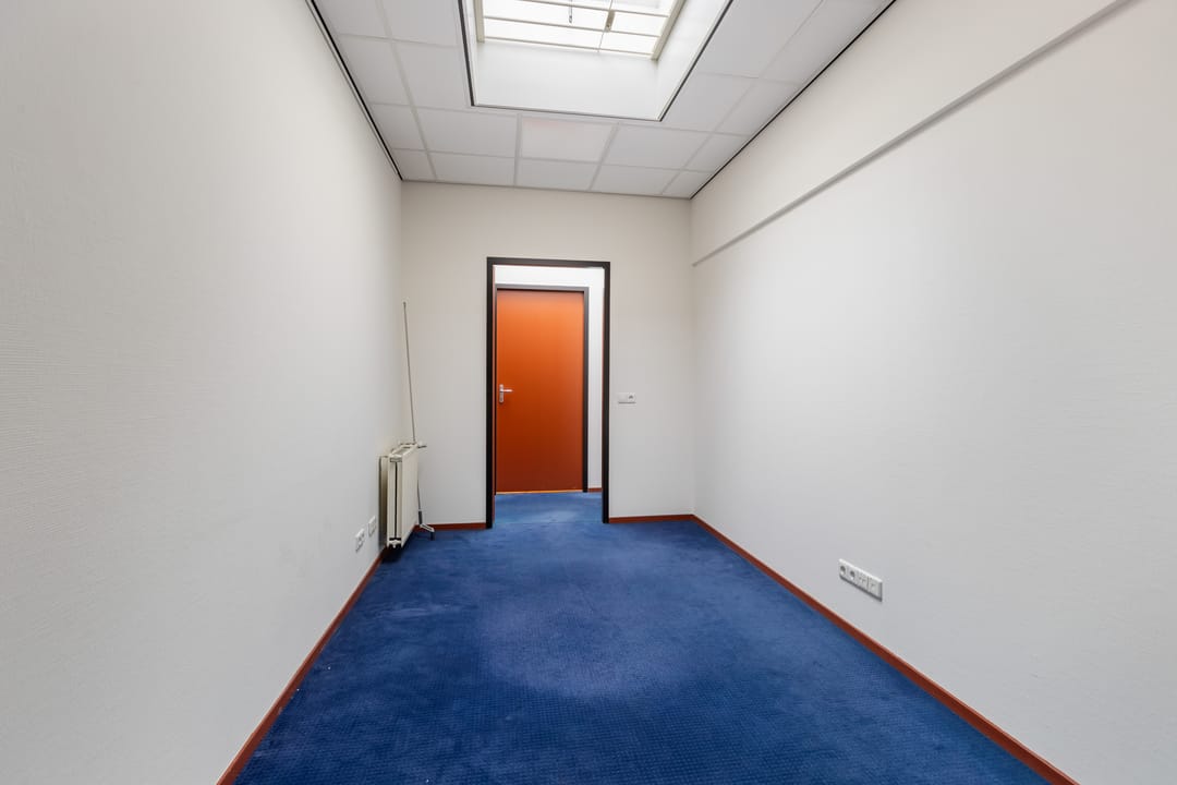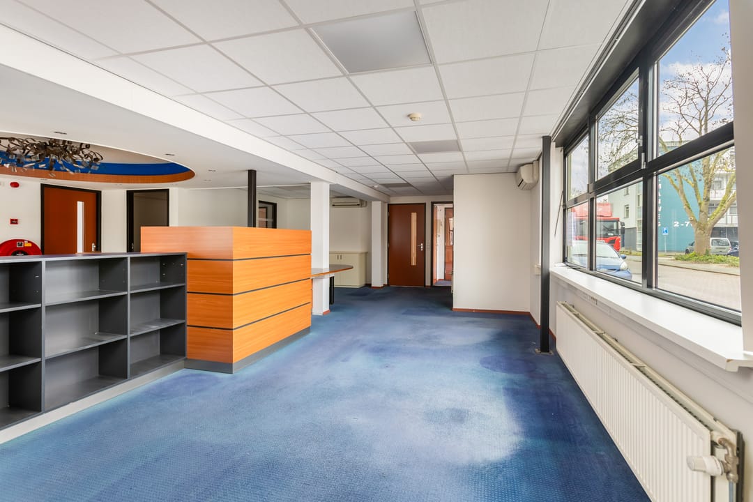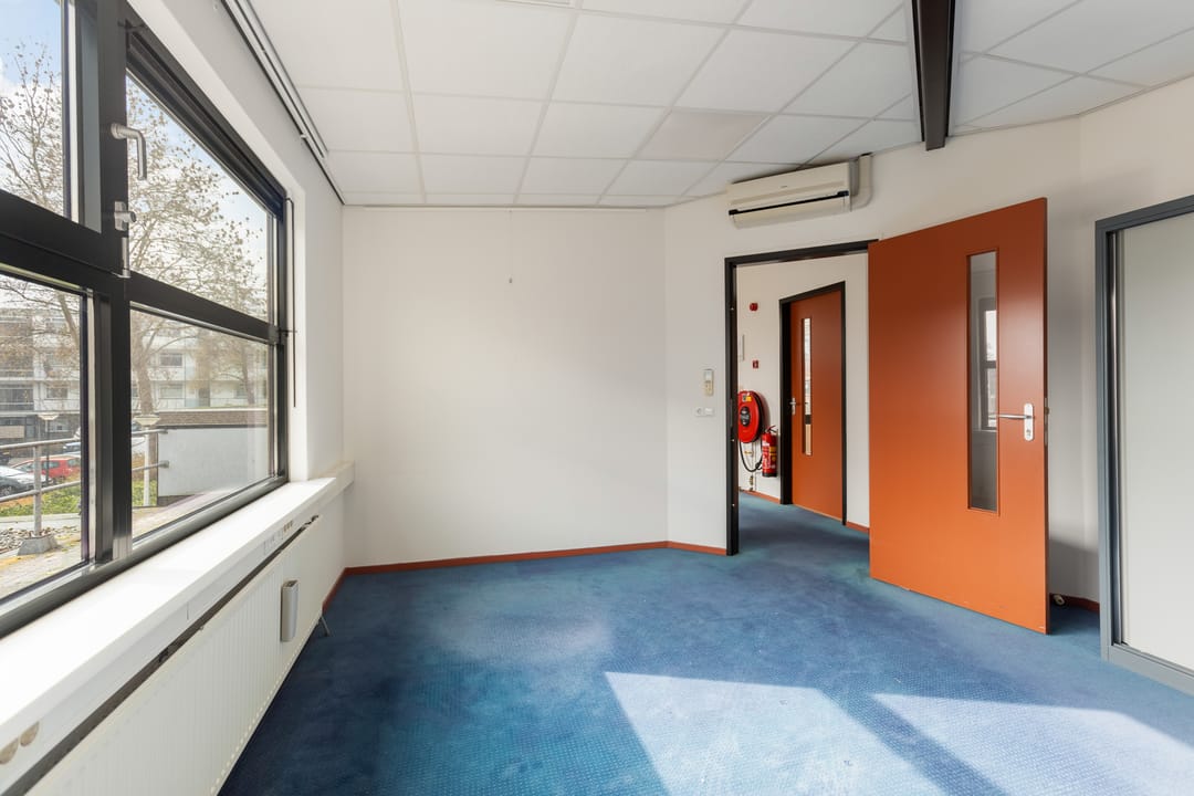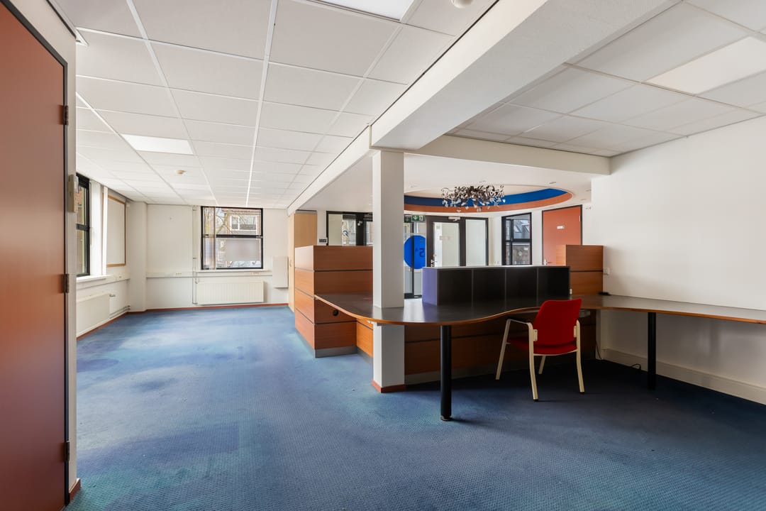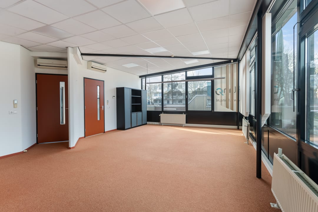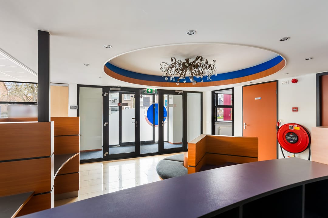 Via de schuifdeuren aan de voorzijde komt u binnen in het tochtportaal. Vanuit hier bereikt u de ontvangst- en balieruimte die direct grenst aan een ruime open kantoorruimte. Deze kantoortuin biedt plaats aan meerdere werkplekken en vormt het centrale hart van het pand.