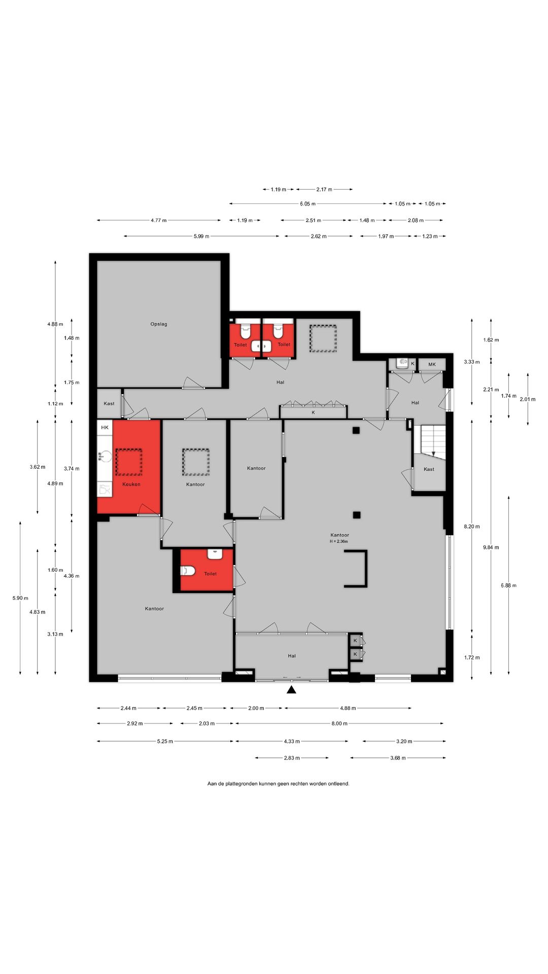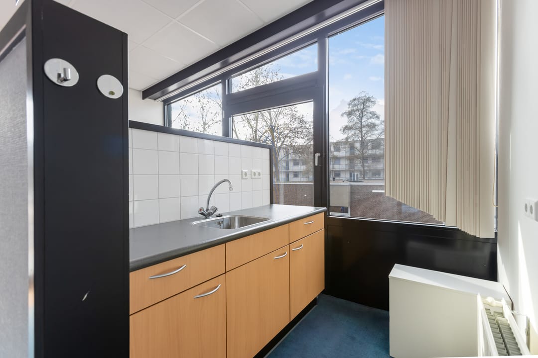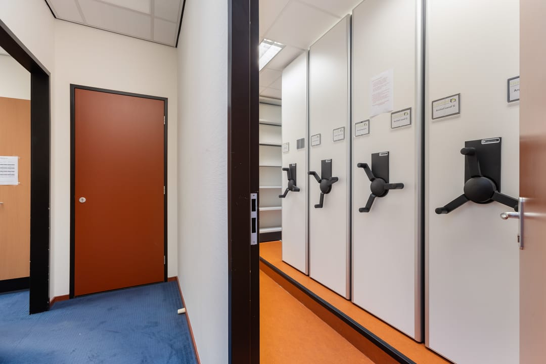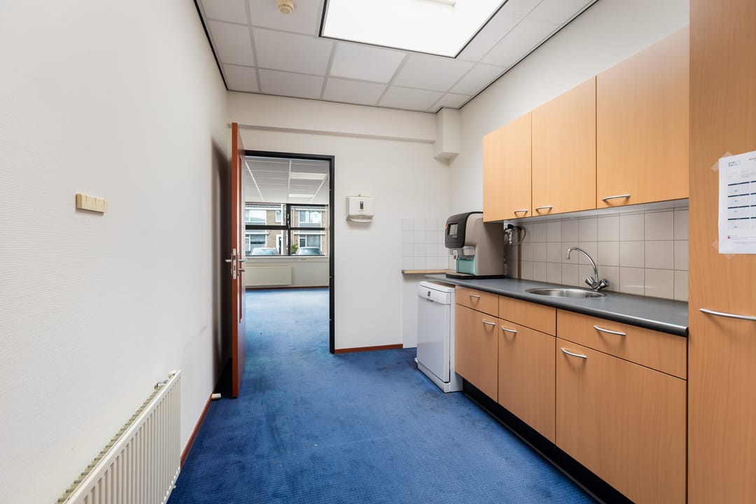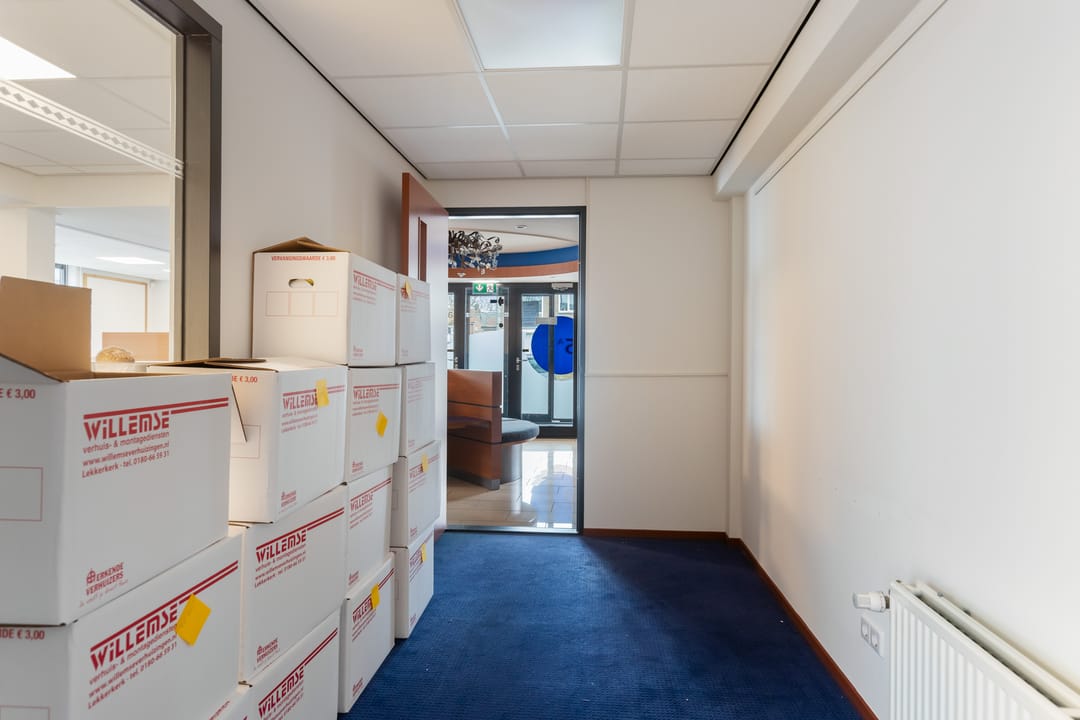 Via de schuifdeuren aan de voorzijde komt u binnen in het tochtportaal. Vanuit hier bereikt u de ontvangst- en balieruimte die direct grenst aan een ruime open kantoorruimte. Deze kantoortuin biedt plaats aan meerdere werkplekken en vormt het centrale hart van het pand.