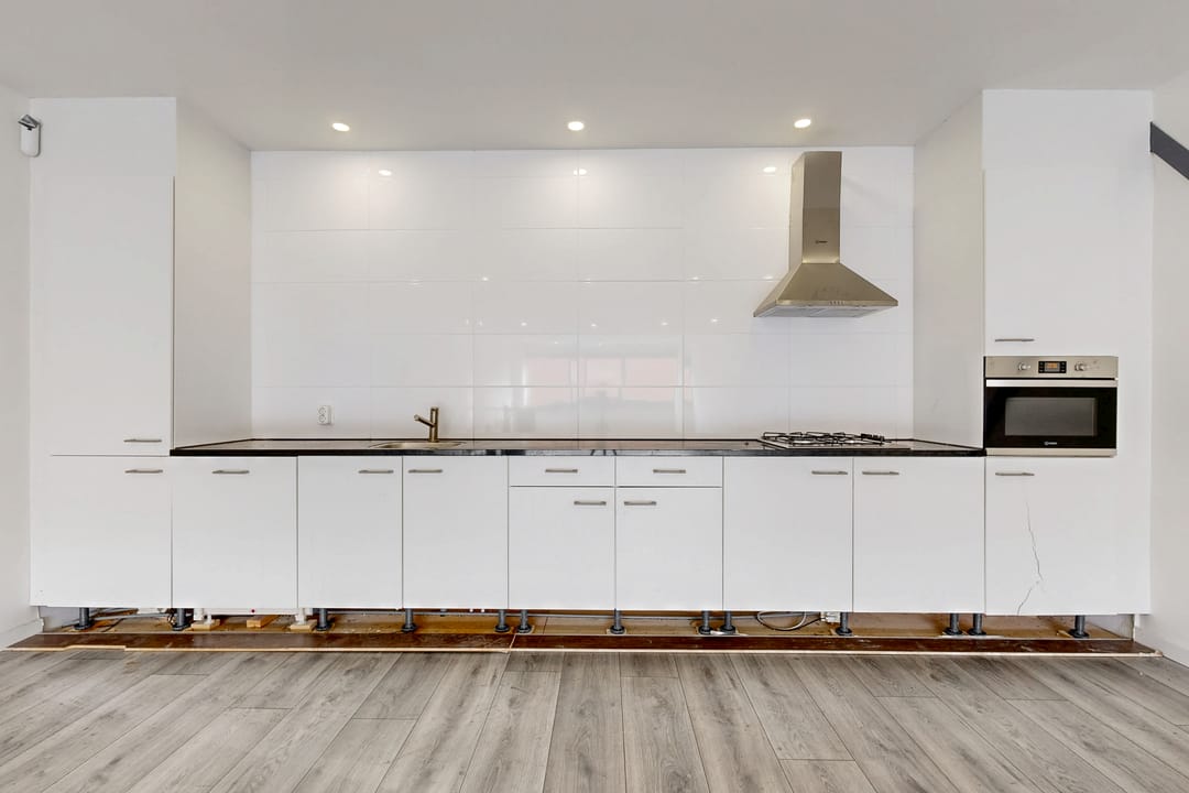 - keuken voorzien van composiet werkblad met gasfornuis, afzuigschouw, oven, vaatwasser en koel/vrieskast.