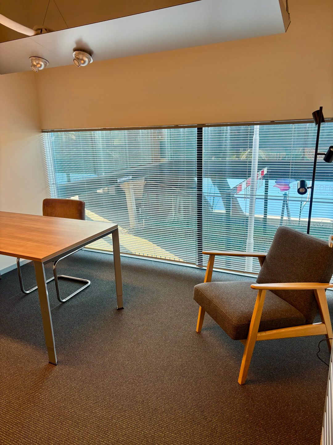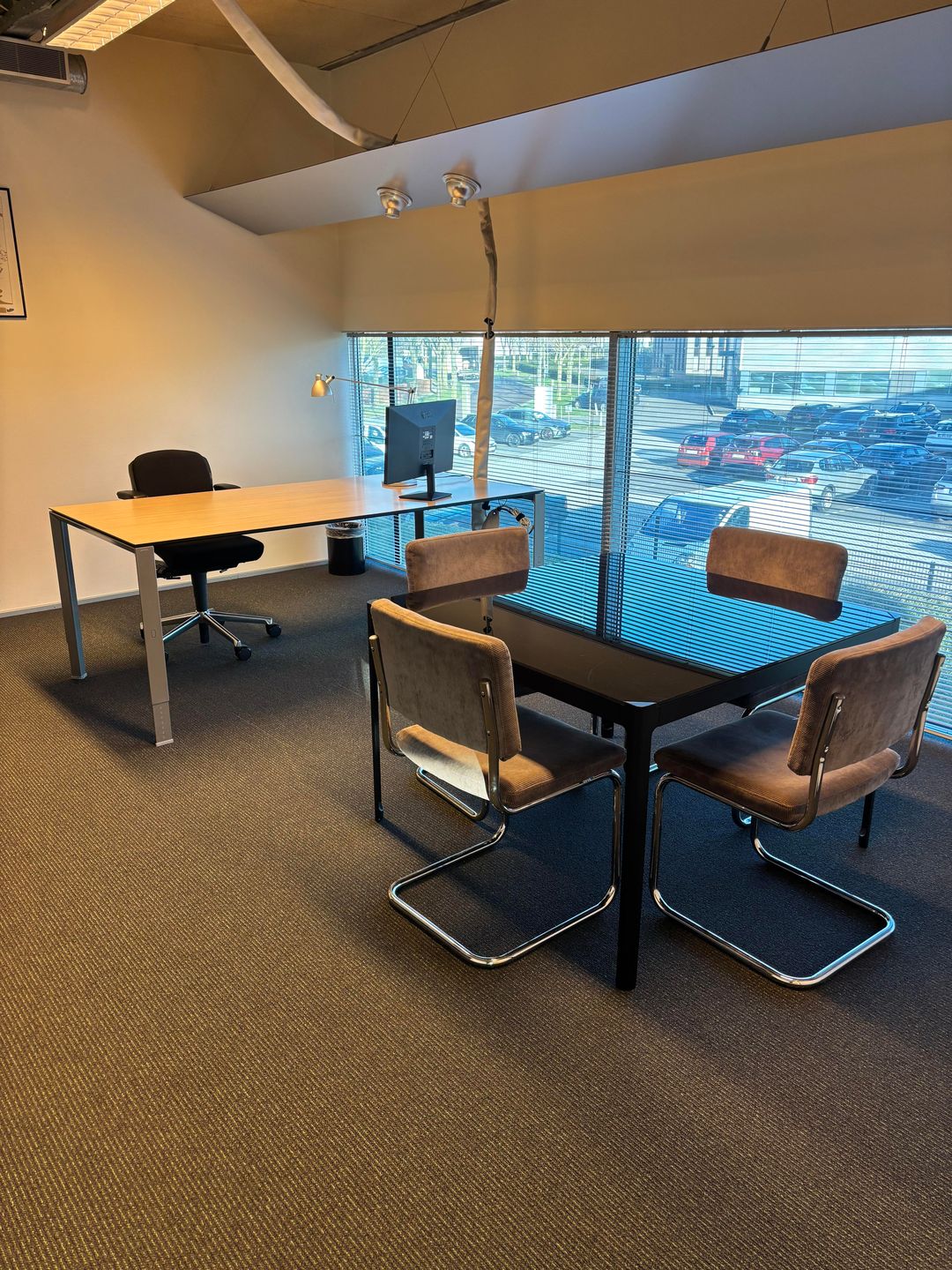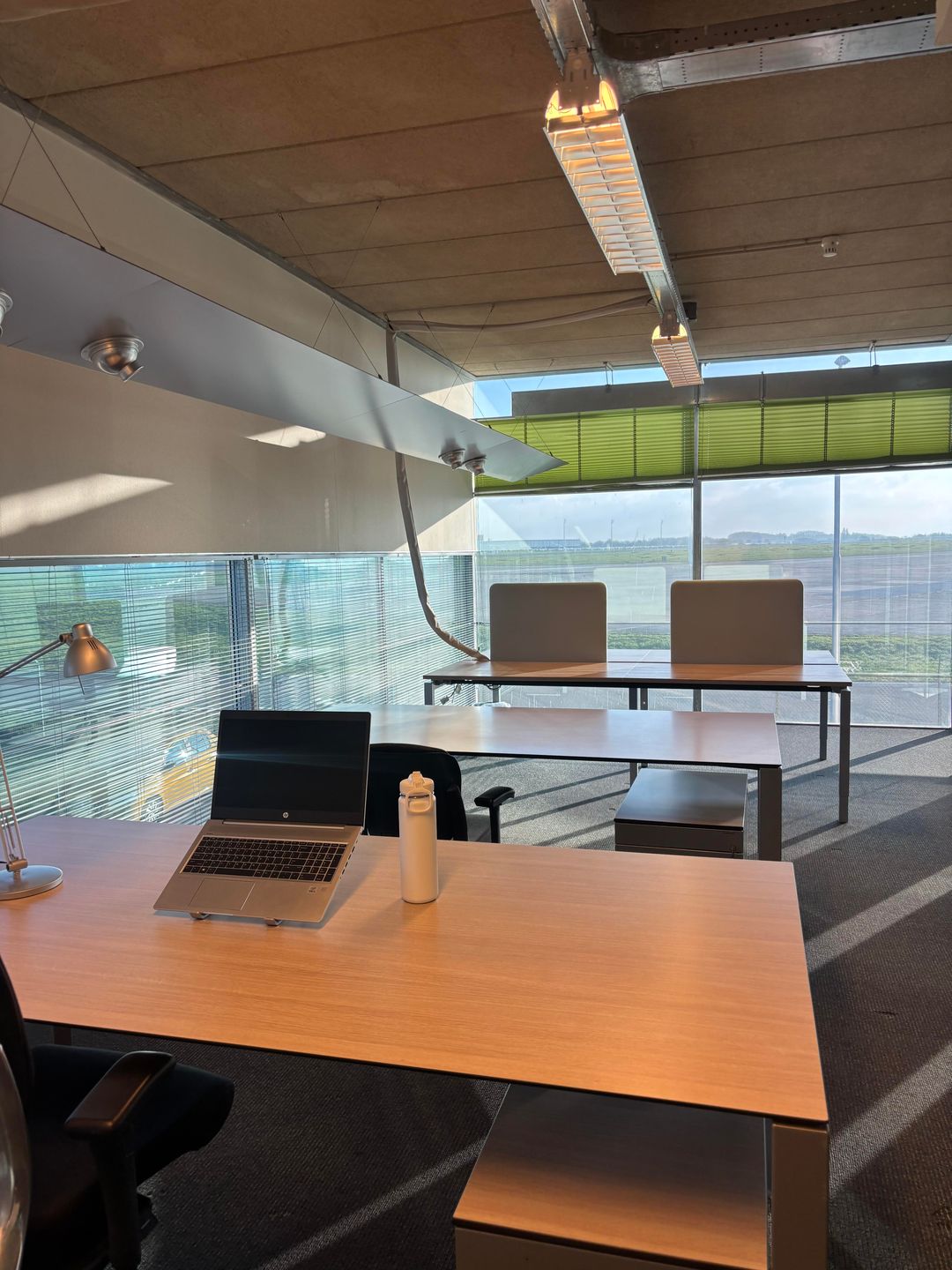 De kantoorruimte op de eerste verdieping heeft een oppervlakte van ca. 294 m2 BVO. Het is een grote open ruimte met een glaswand van vloer tot plafond die vrij uitzicht biedt op de dynamische start en landingsbaan van Maastricht Airport. Door de aangebrachte warmte werende folie is er geen sprake van warmteoverlast door de grote glazen gevel.