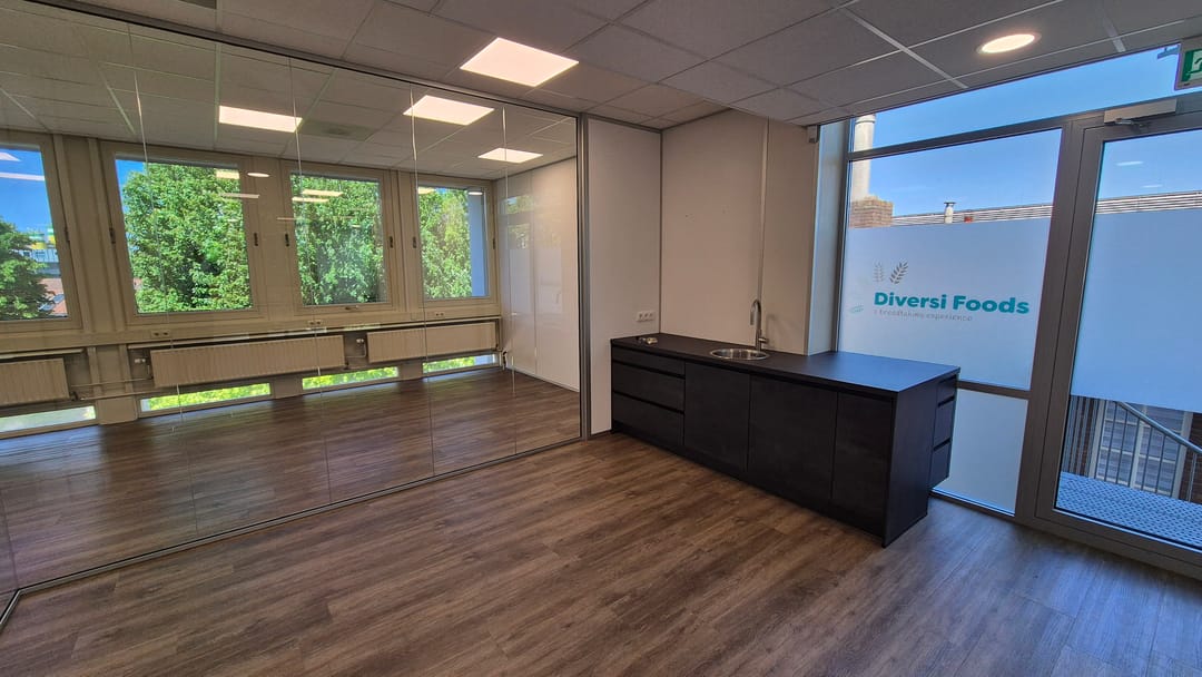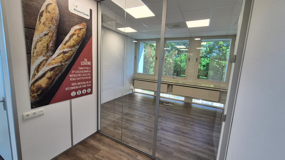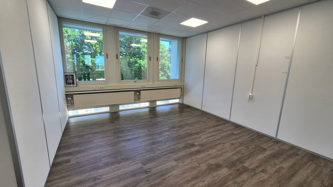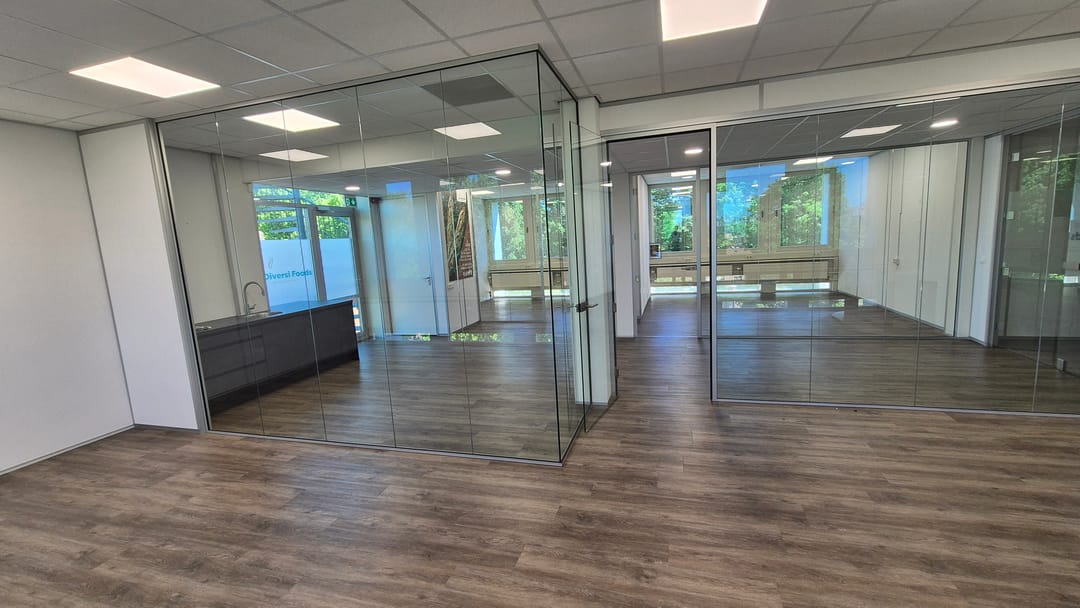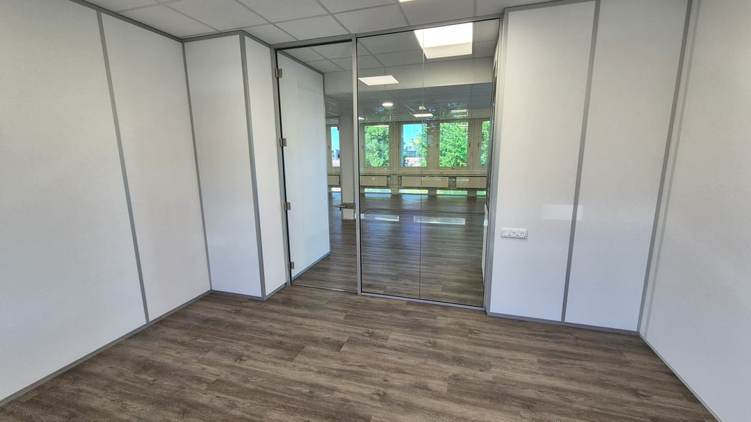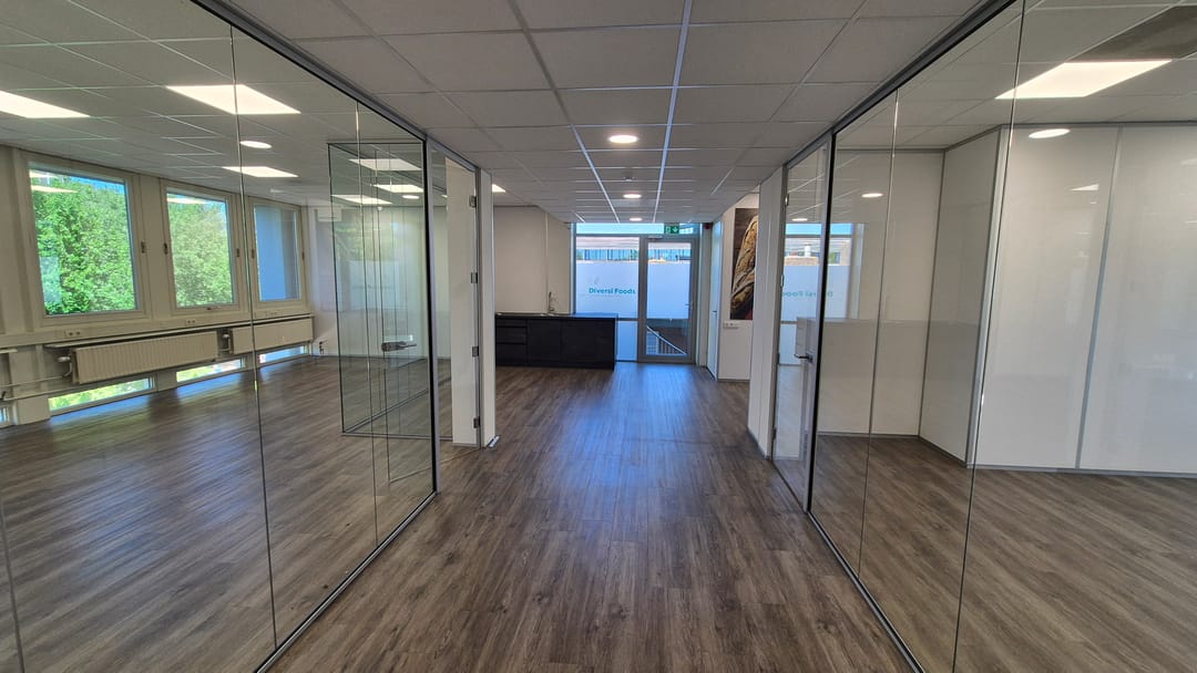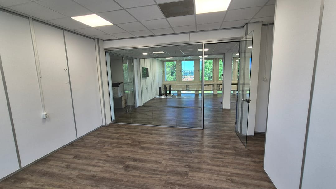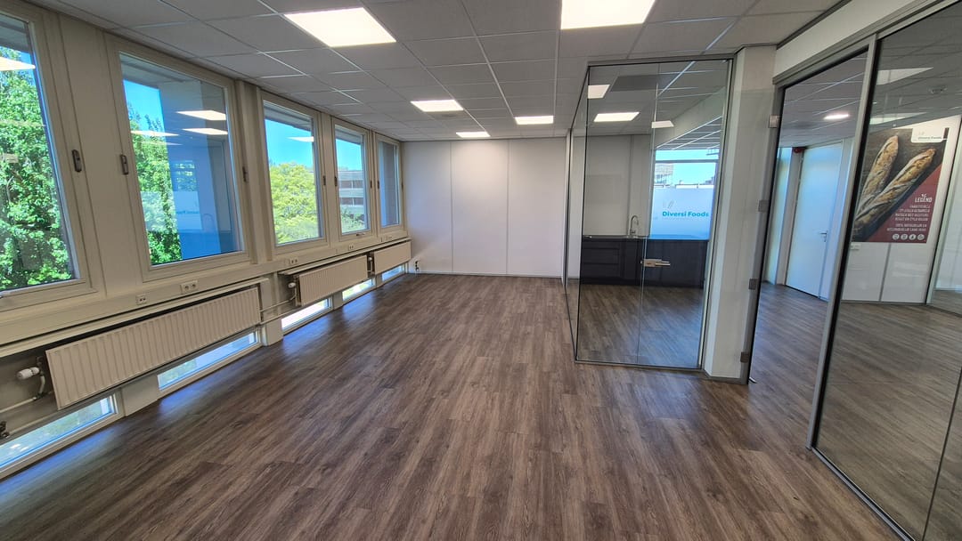 De kantoorruimte kan zo worden betrokken en is voorzien pvc vloeren, topkoeling, systeemplafonds met verlichting, glazen scheidingswanden, etc.