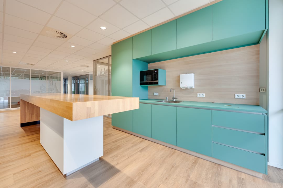 De eerste verdieping is voorzien van een recente, moderne afwerking, waaronder vloerafwerking, een baliefunctie en twee pantryvoorzieningen.