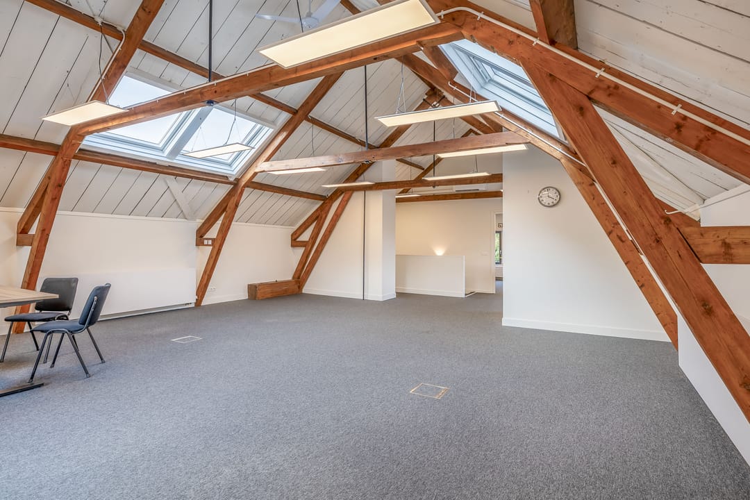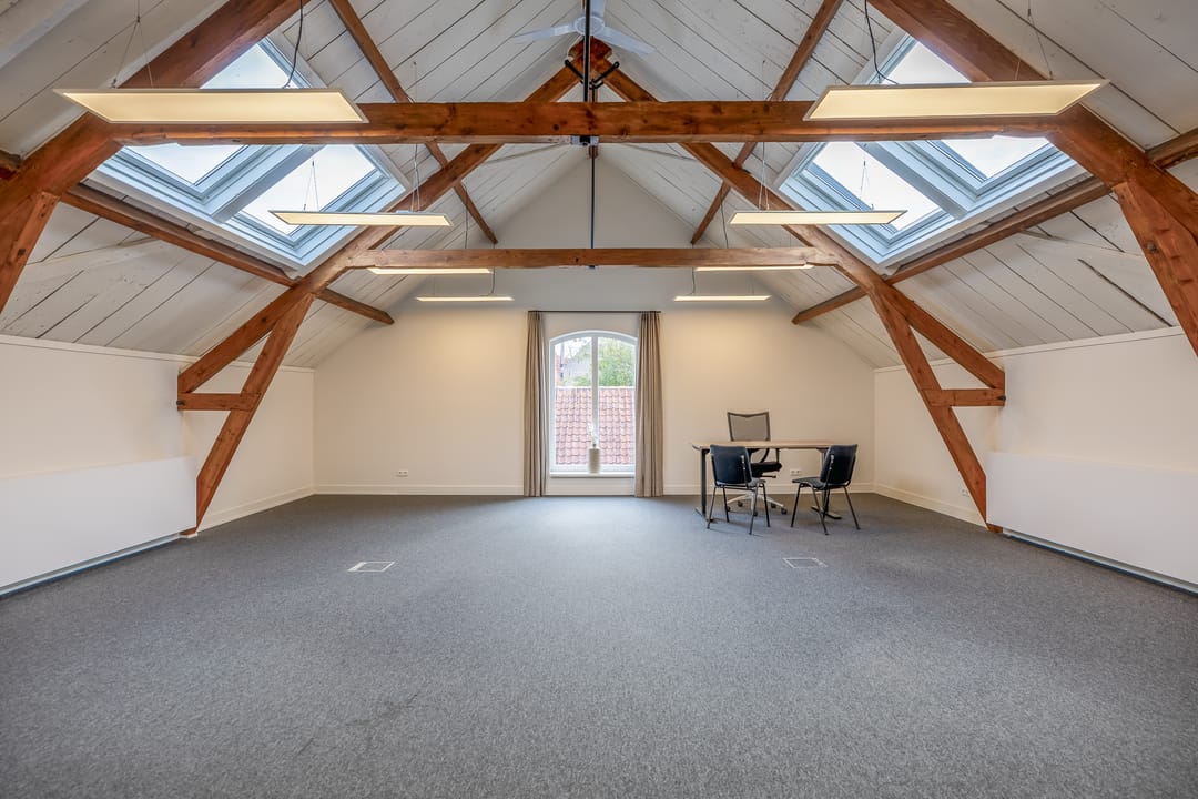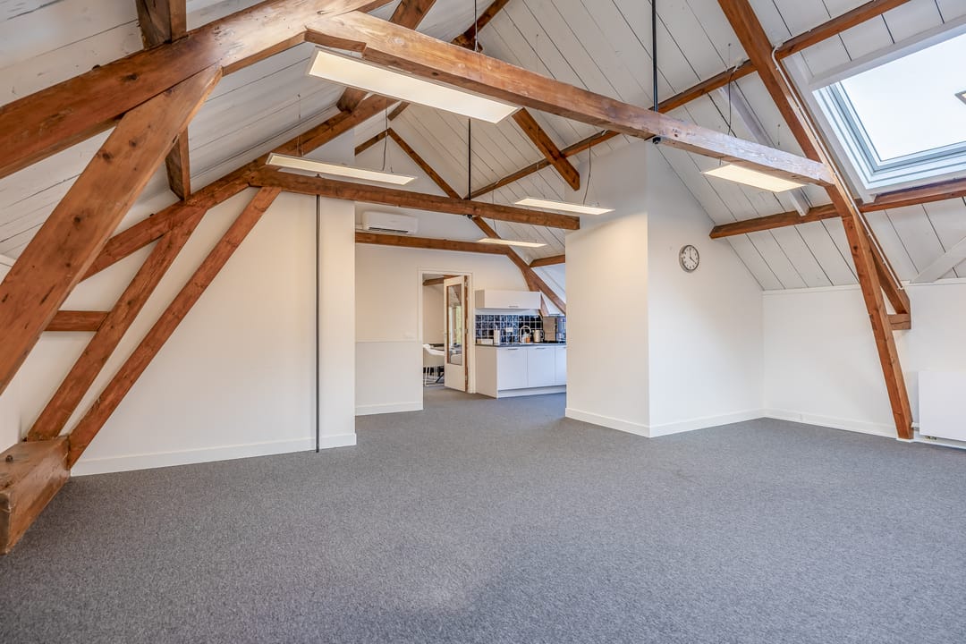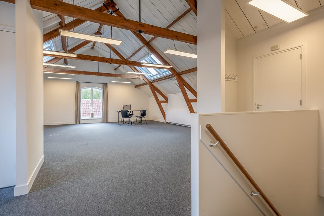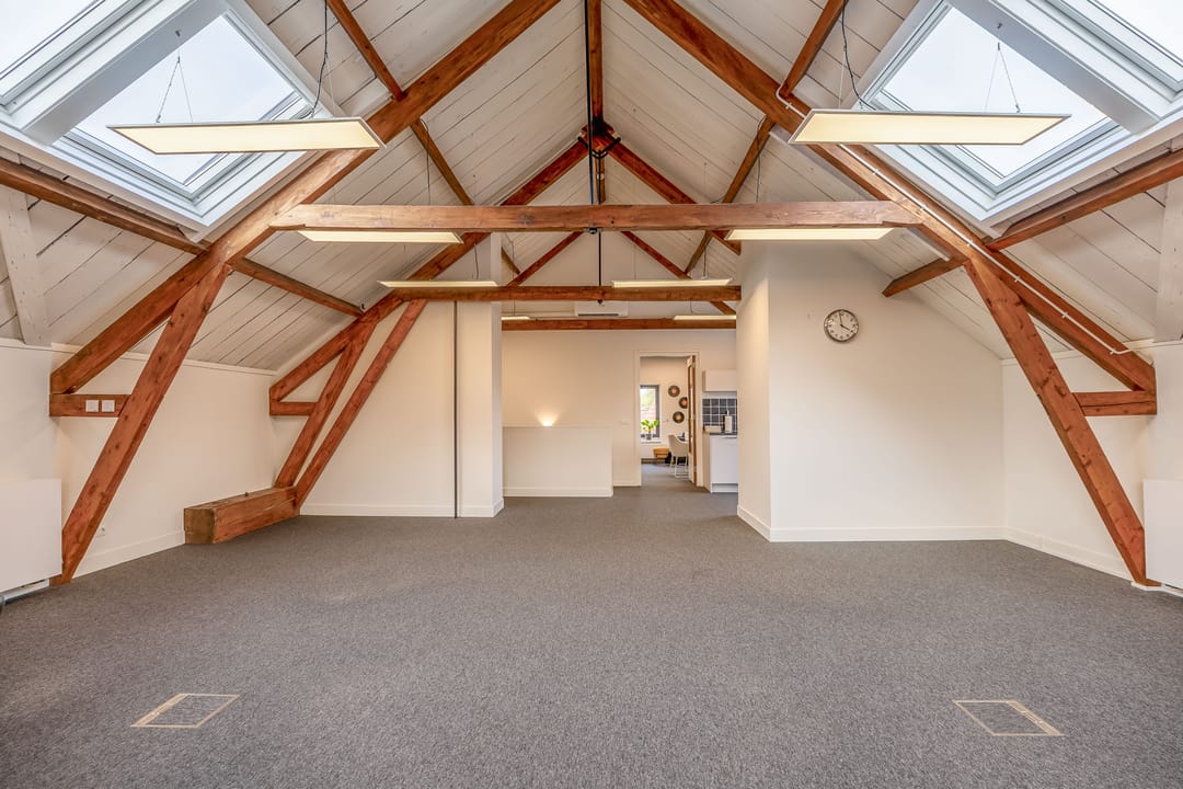 De open ruimtes onder de zichtbare houten balken zorgen voor een prettige sfeer en veel daglicht. Ideaal voor creatieve bureaus, advieskantoren of kleinschalige dienstverleners die waarde hechten aan uitstraling en comfort.