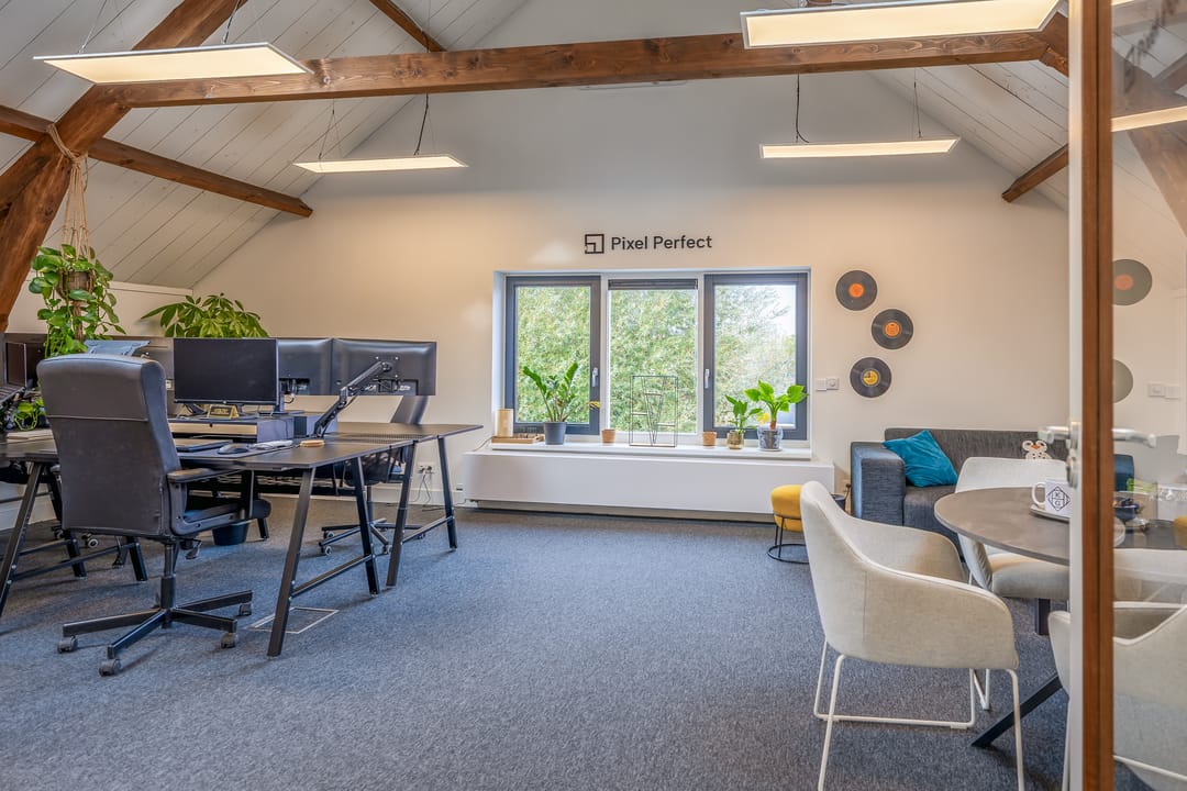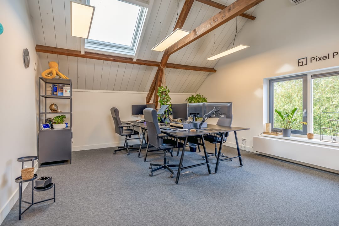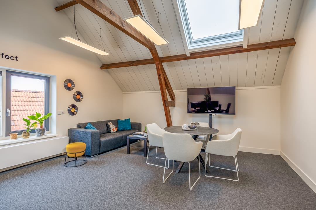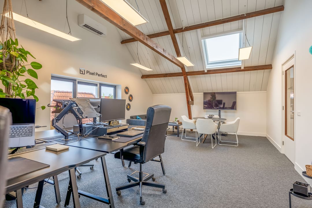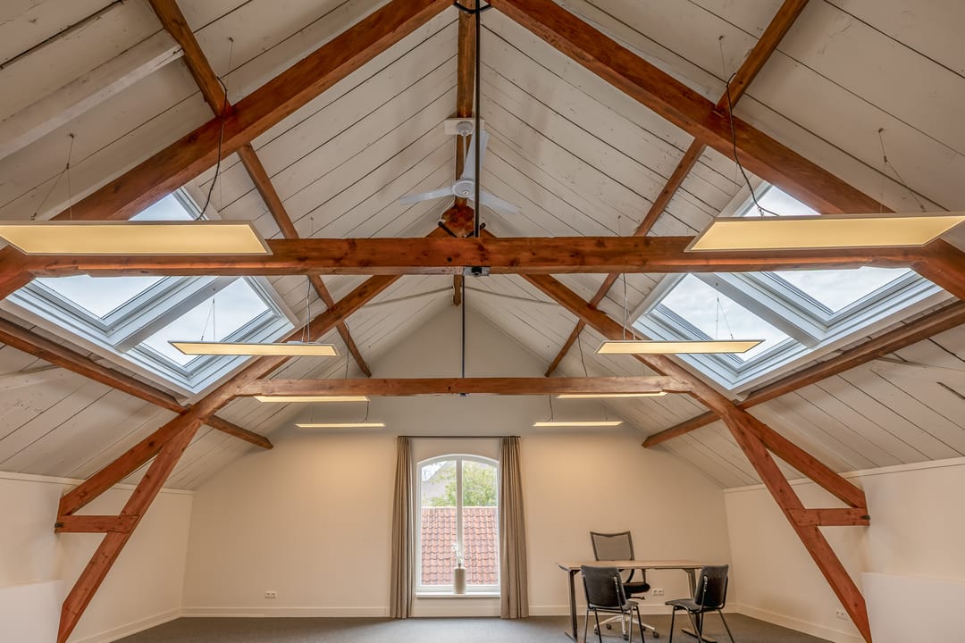 De open ruimtes onder de zichtbare houten balken zorgen voor een prettige sfeer en veel daglicht. Ideaal voor creatieve bureaus, advieskantoren of kleinschalige dienstverleners die waarde hechten aan uitstraling en comfort.
