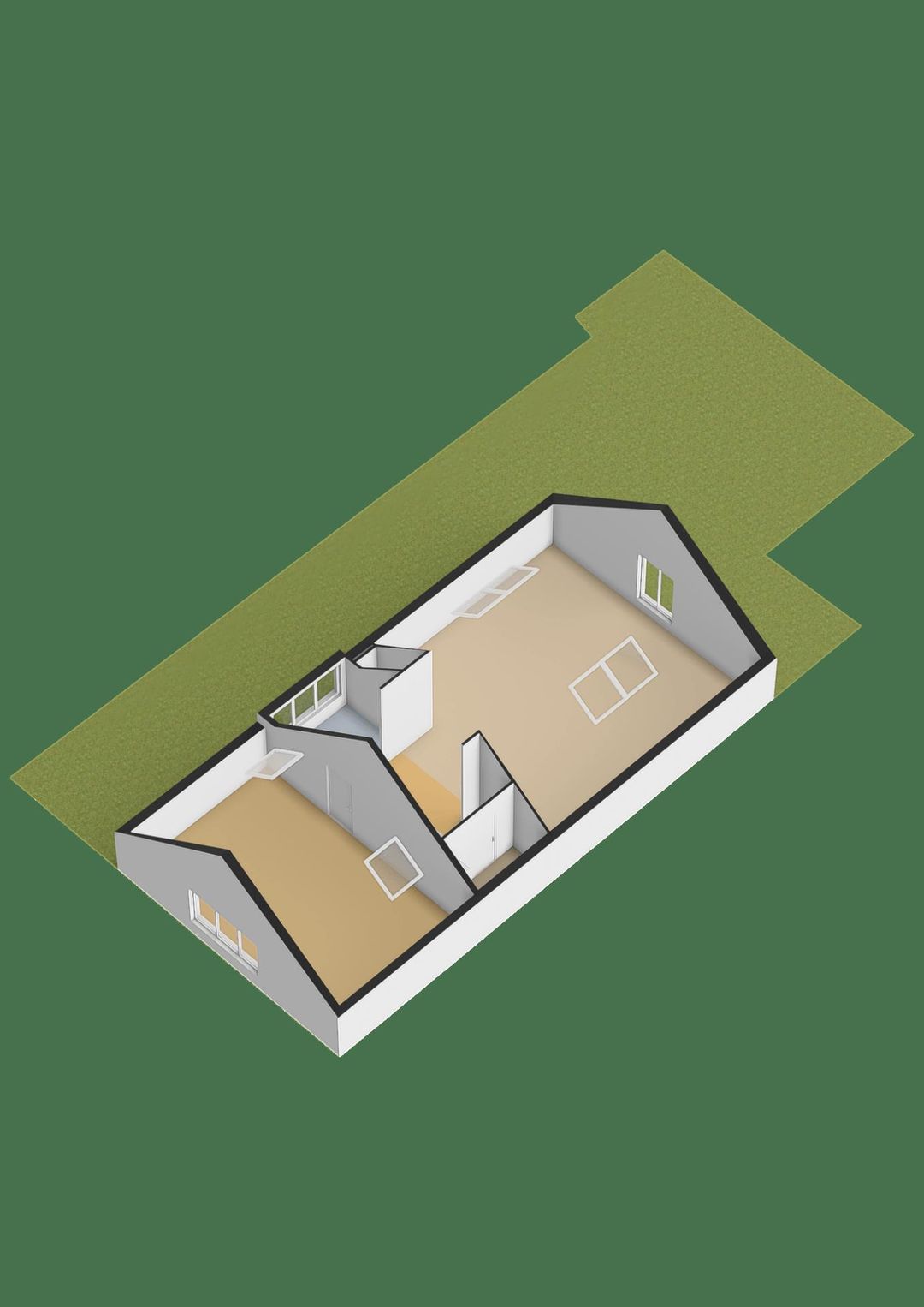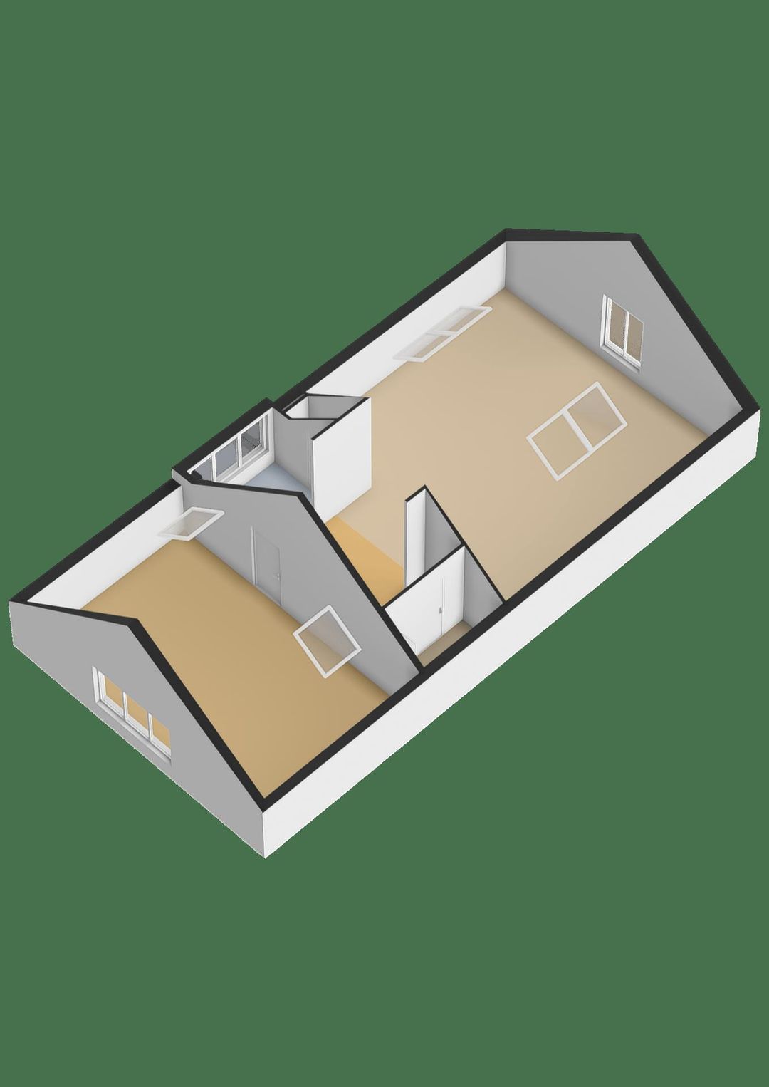 Vanuit de overloop loop je naar twee aparte kantoorruimtes: aan de linkerzijde bevindt zich een afsluitbare kamer van circa 37 m², ideaal als vergaderruimte of zelfstandig kantoor. Aan de rechterzijde ligt een royale open werkruimte van ongeveer 62 m², met een hoge nok, fraaie zichtbare balken en volop daglicht dankzij de dakramen en hoge raampartijen.