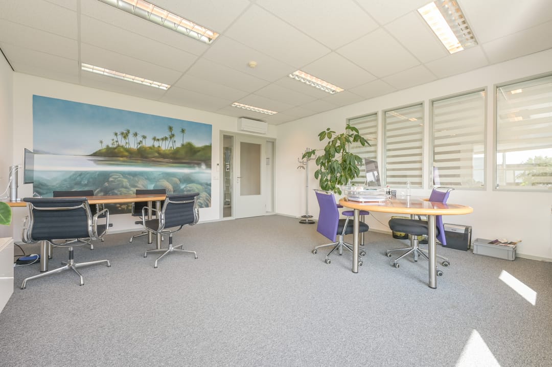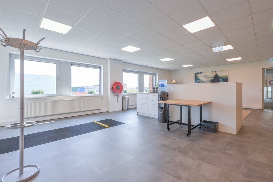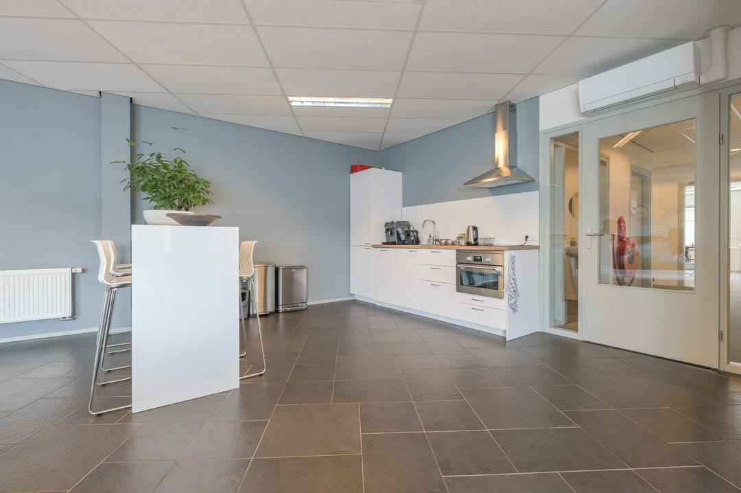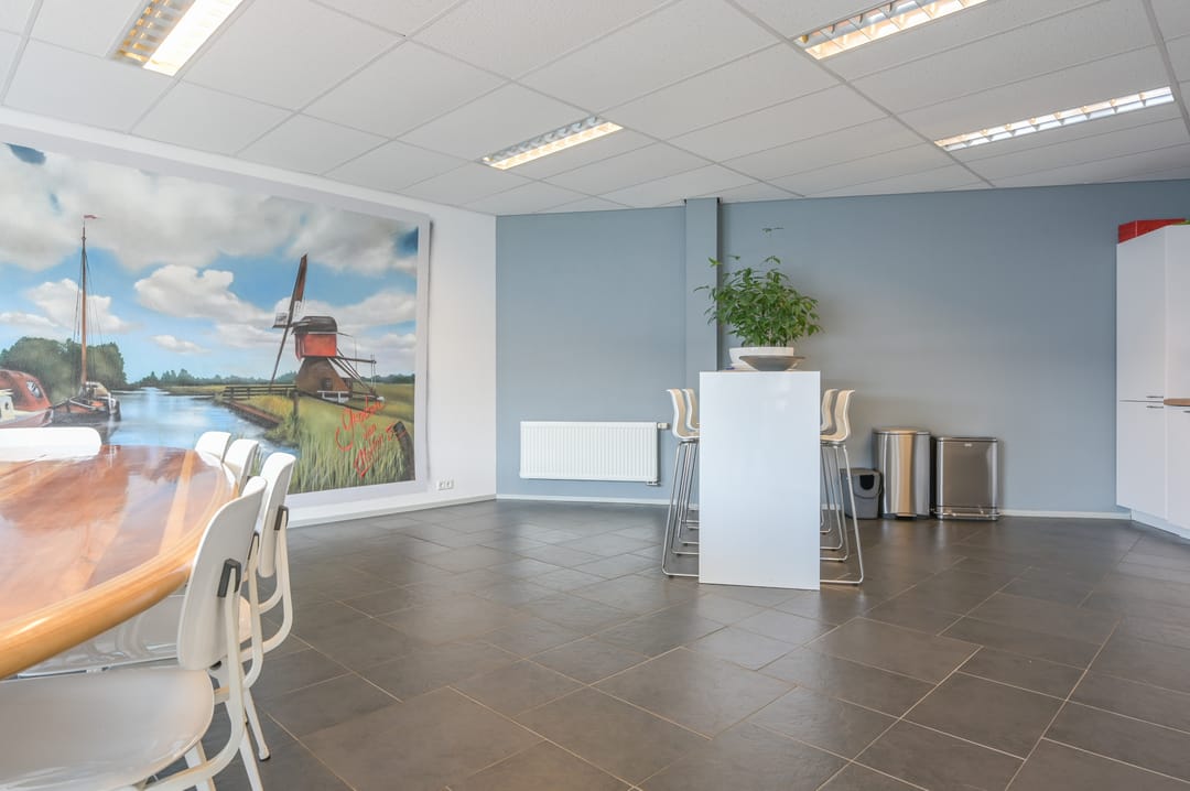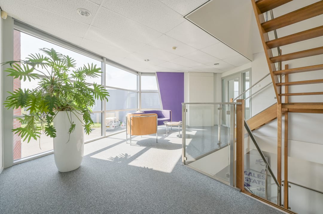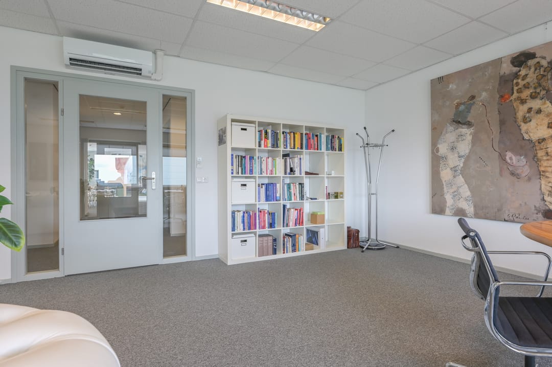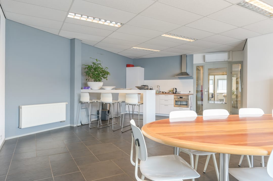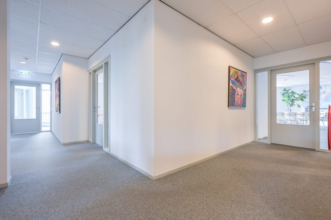 Via een trap in de centrale hal komt u uit op een overloop die toegang biedt tot de kantoorruimtes en de trapopgang naar de tweede verdieping. Deze verdieping beschikt over drie ruime kantoorruimtes, een vergaderzaal en een kantine met een volledig ingerichte keuken (2024). In het halletje naast de keuken bevindt zich een toiletgroep. Dankzij de grote raampartijen genieten alle kantoren van veel daglicht en zijn deze voorzien van rubberen vloertegels en airco-units die zowel kunnen koelen als verwarmen.