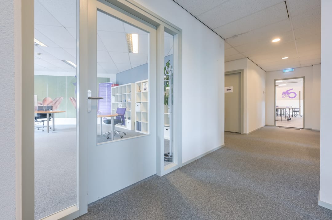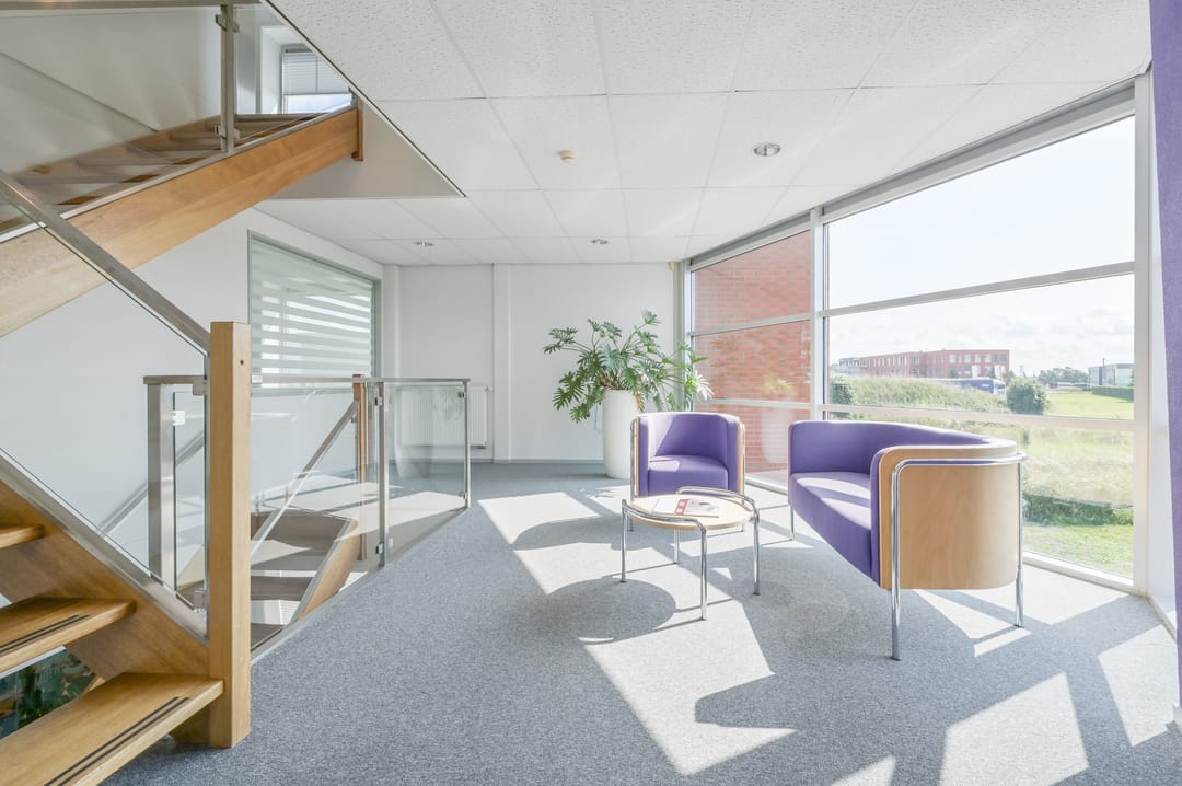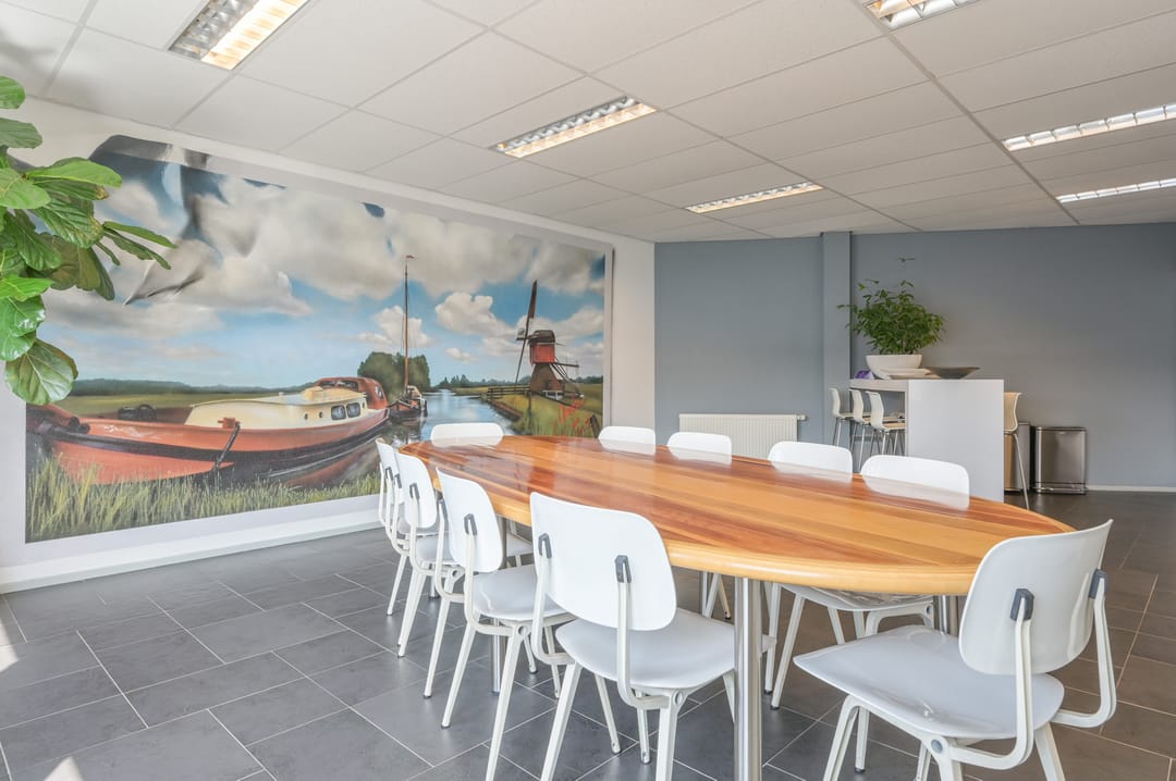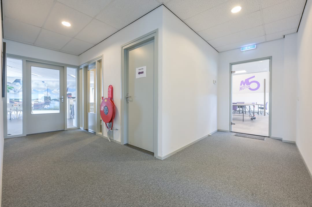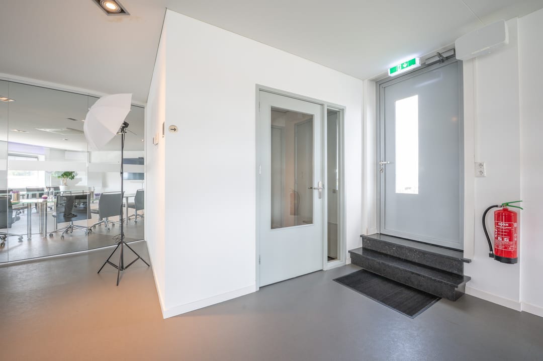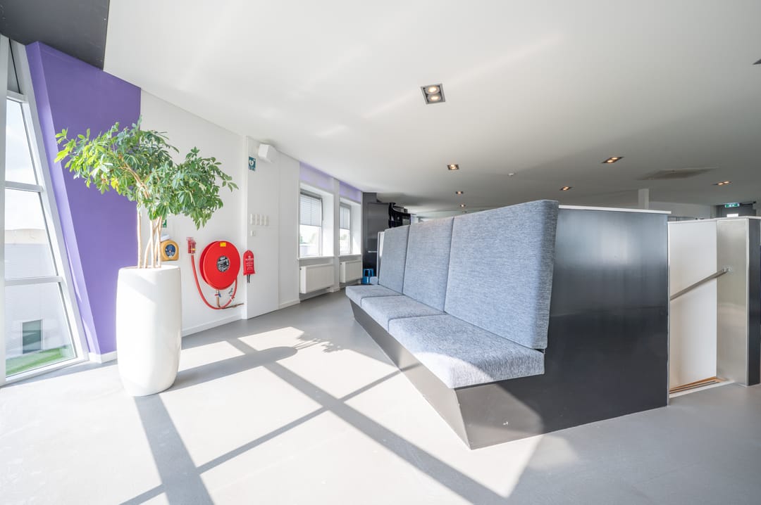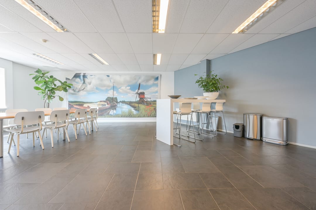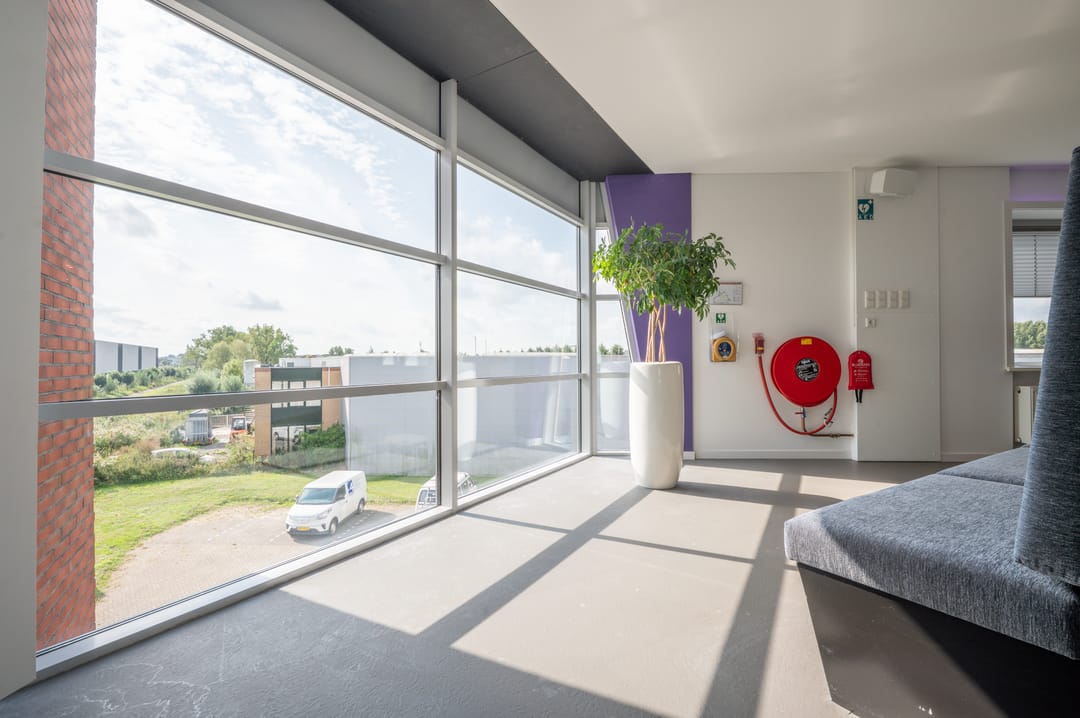 Via een trap in de centrale hal komt u uit op een overloop die toegang biedt tot de kantoorruimtes en de trapopgang naar de tweede verdieping. Deze verdieping beschikt over drie ruime kantoorruimtes, een vergaderzaal en een kantine met een volledig ingerichte keuken (2024). In het halletje naast de keuken bevindt zich een toiletgroep. Dankzij de grote raampartijen genieten alle kantoren van veel daglicht en zijn deze voorzien van rubberen vloertegels en airco-units die zowel kunnen koelen als verwarmen.