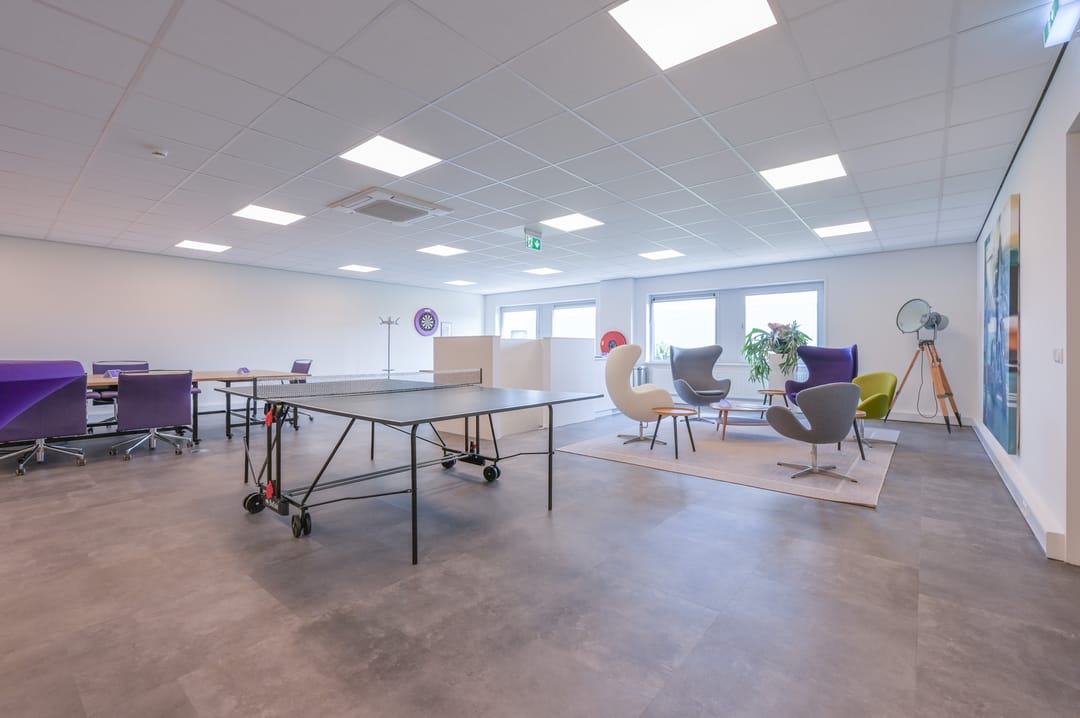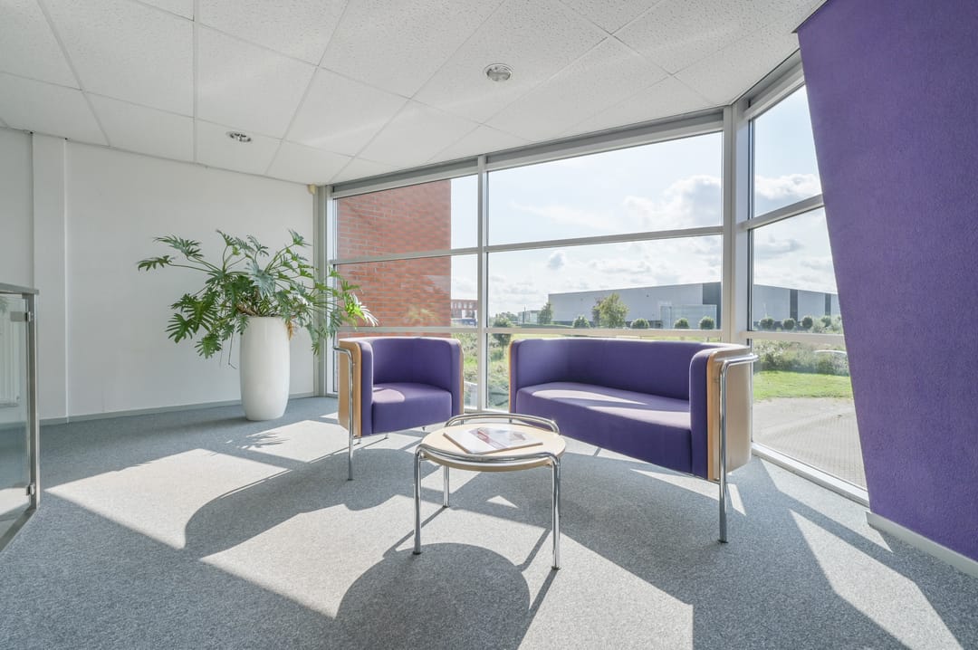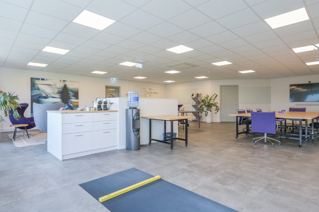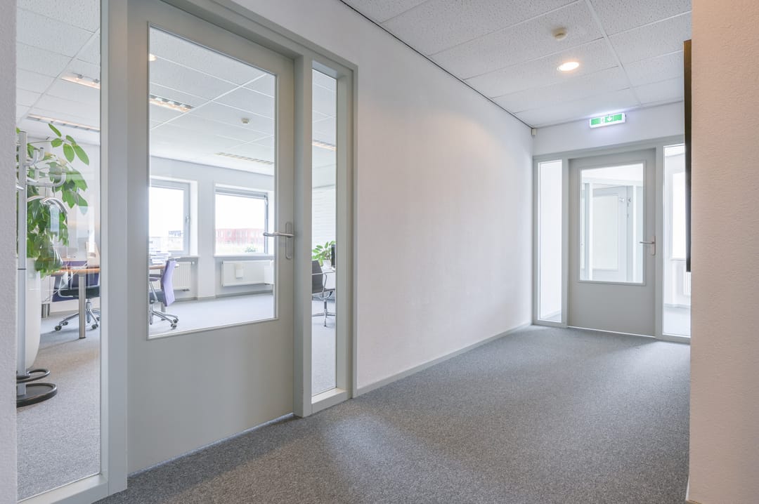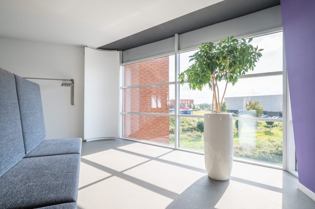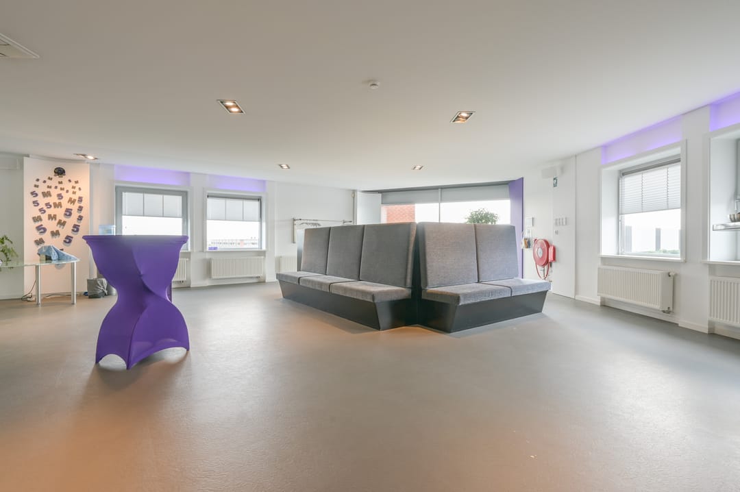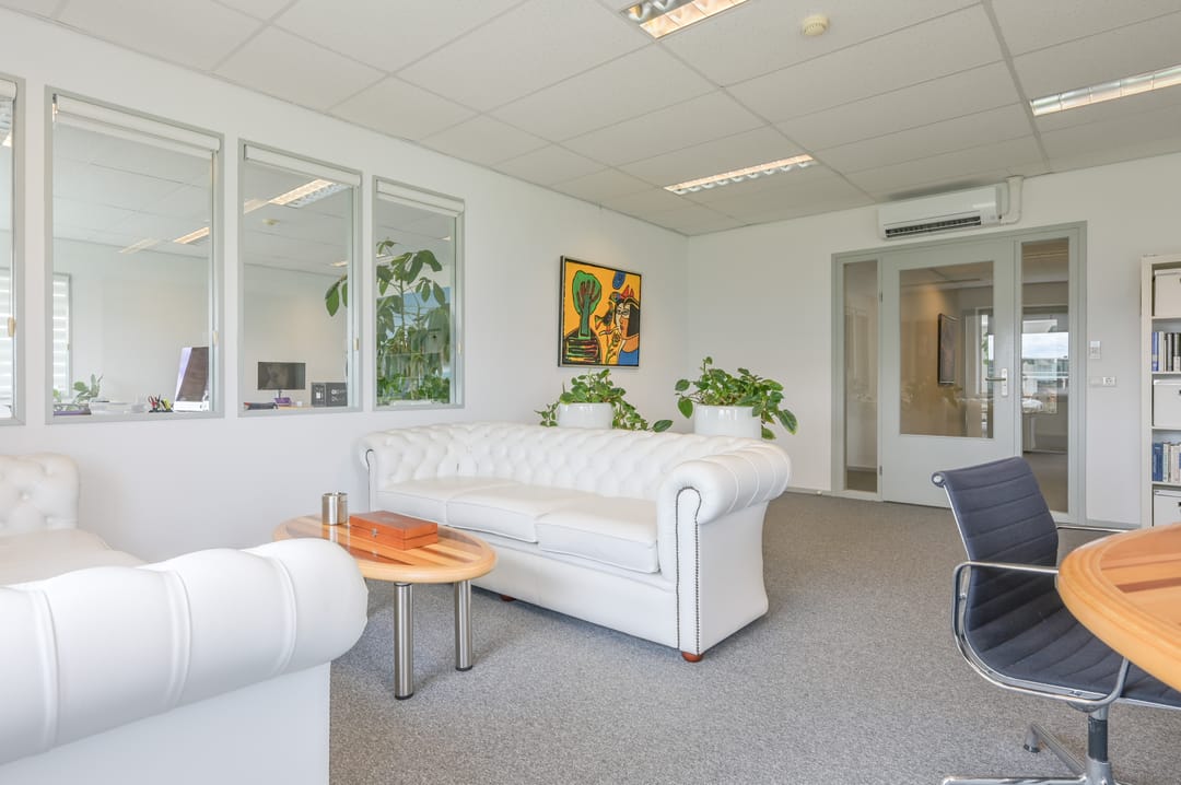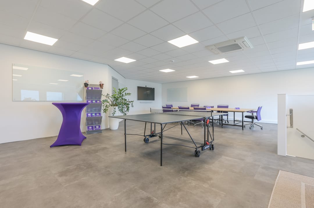 Via een trap in de centrale hal komt u uit op een overloop die toegang biedt tot de kantoorruimtes en de trapopgang naar de tweede verdieping. Deze verdieping beschikt over drie ruime kantoorruimtes, een vergaderzaal en een kantine met een volledig ingerichte keuken (2024). In het halletje naast de keuken bevindt zich een toiletgroep. Dankzij de grote raampartijen genieten alle kantoren van veel daglicht en zijn deze voorzien van rubberen vloertegels en airco-units die zowel kunnen koelen als verwarmen.