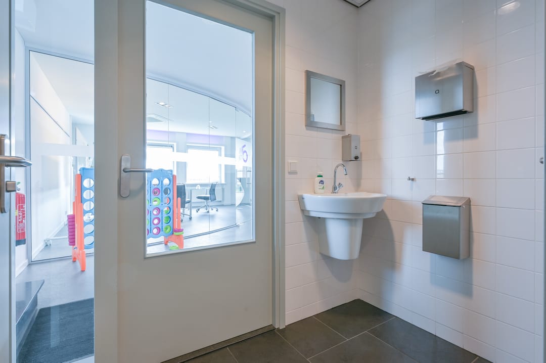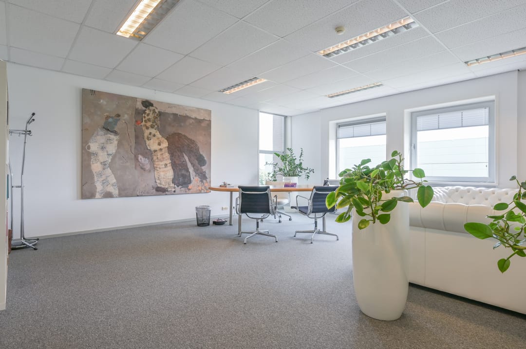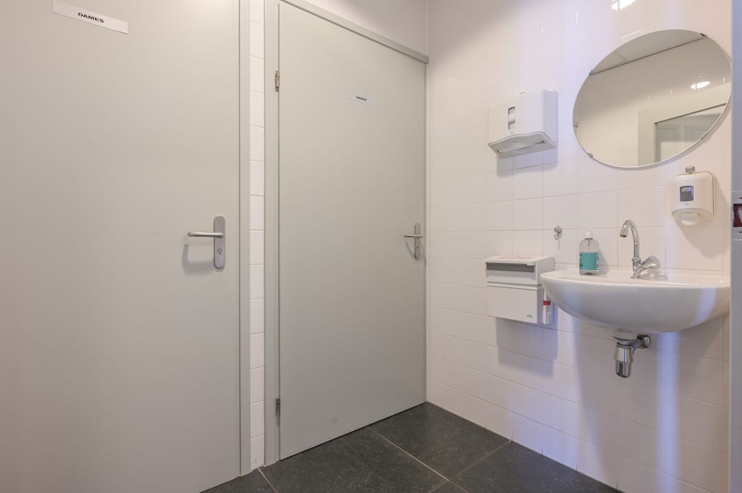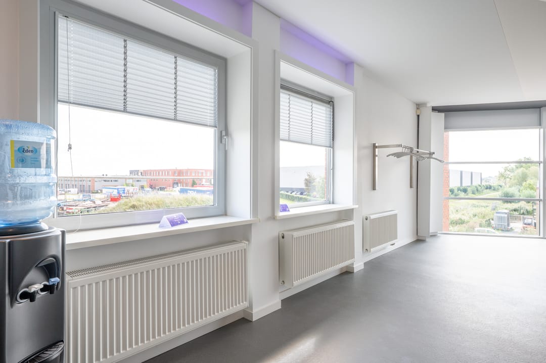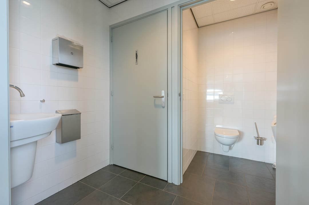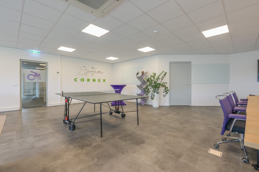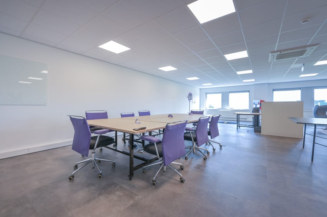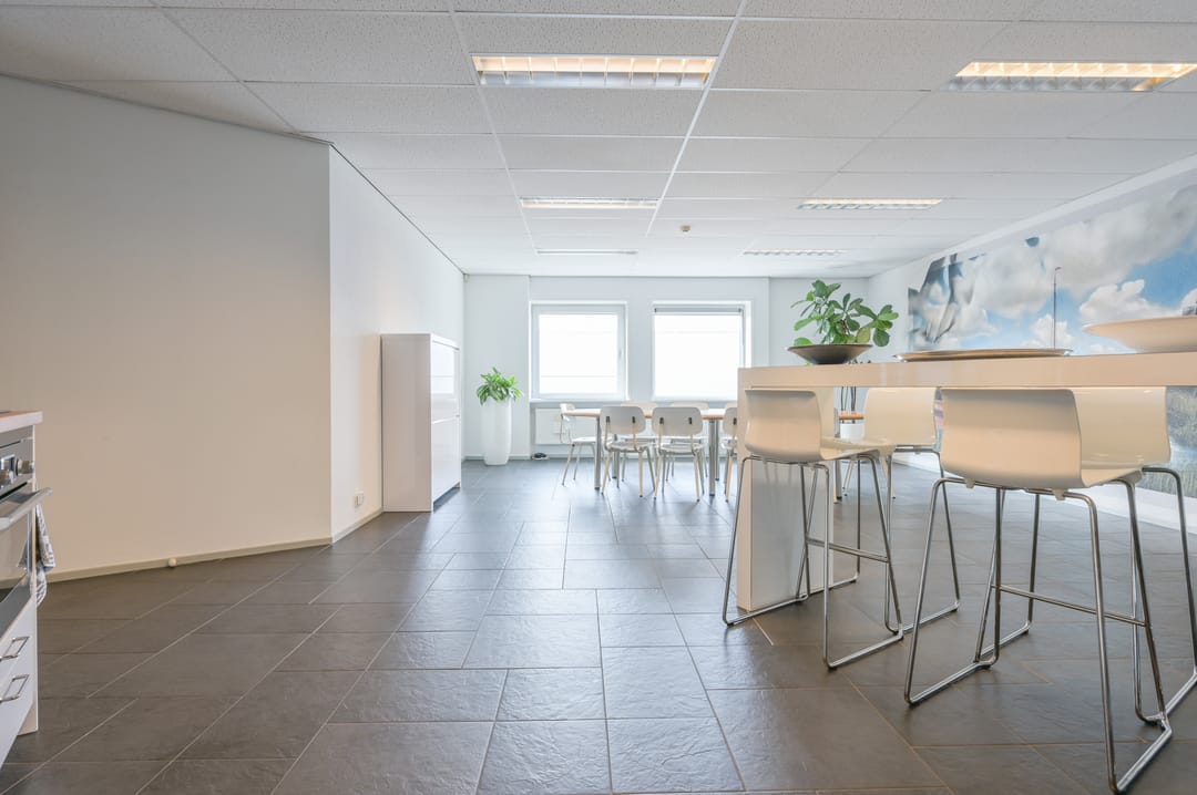 Via een trap in de centrale hal komt u uit op een overloop die toegang biedt tot de kantoorruimtes en de trapopgang naar de tweede verdieping. Deze verdieping beschikt over drie ruime kantoorruimtes, een vergaderzaal en een kantine met een volledig ingerichte keuken (2024). In het halletje naast de keuken bevindt zich een toiletgroep. Dankzij de grote raampartijen genieten alle kantoren van veel daglicht en zijn deze voorzien van rubberen vloertegels en airco-units die zowel kunnen koelen als verwarmen.