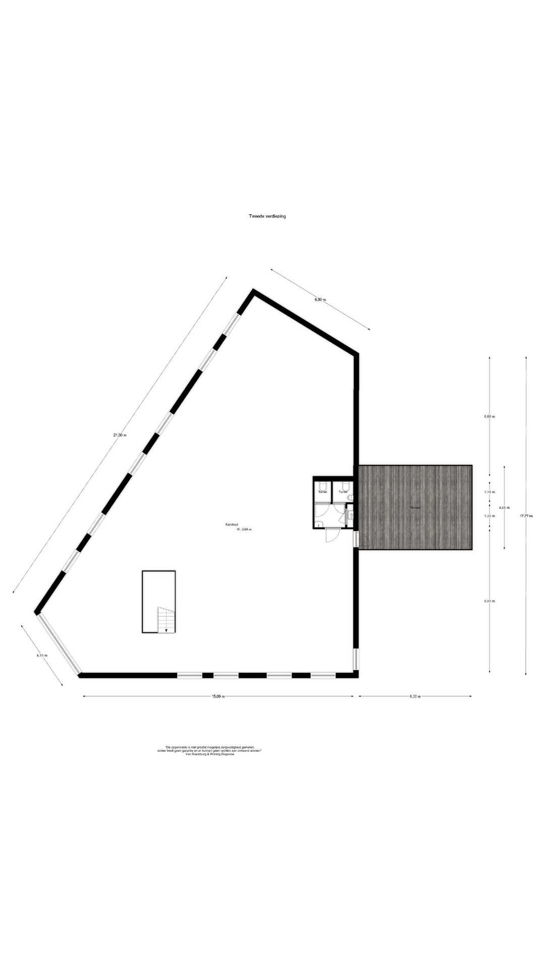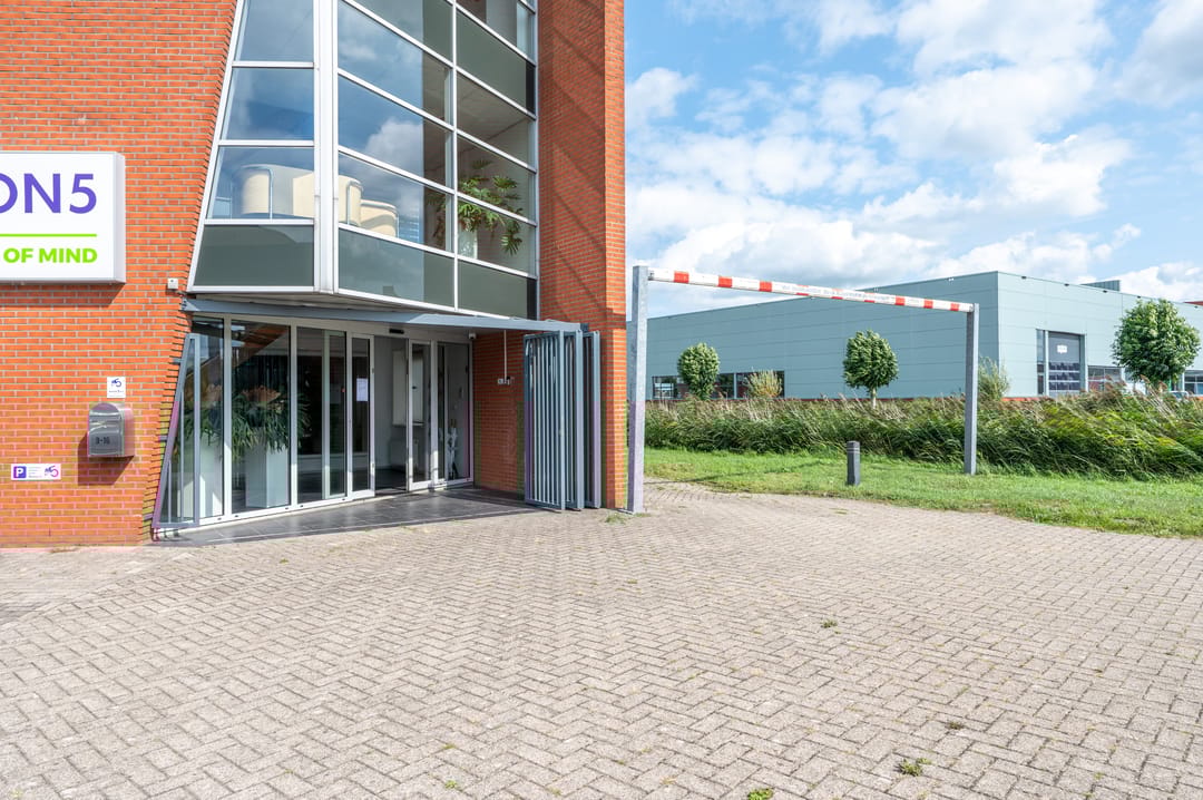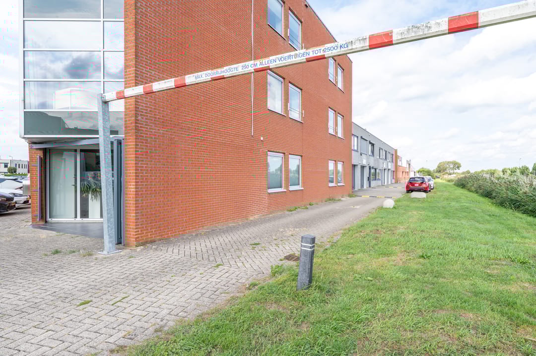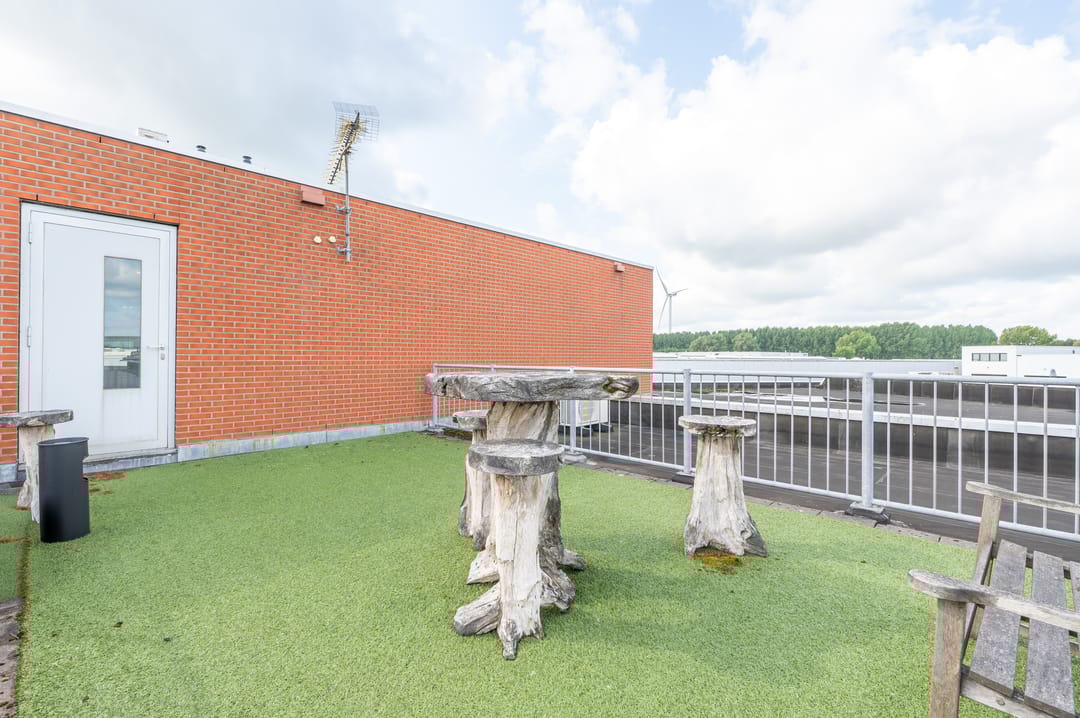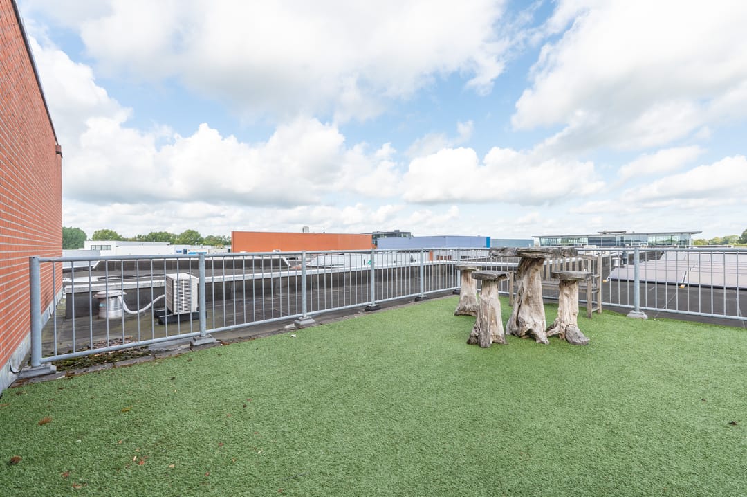Via een deur is het dakterras bereikbaar, vanwaar een mooi uitzicht over het bedrijventerrein en de uitgestrekte polder te bewonderen is.