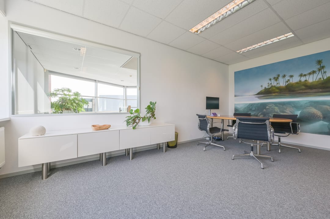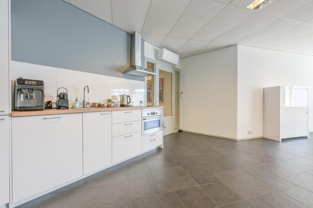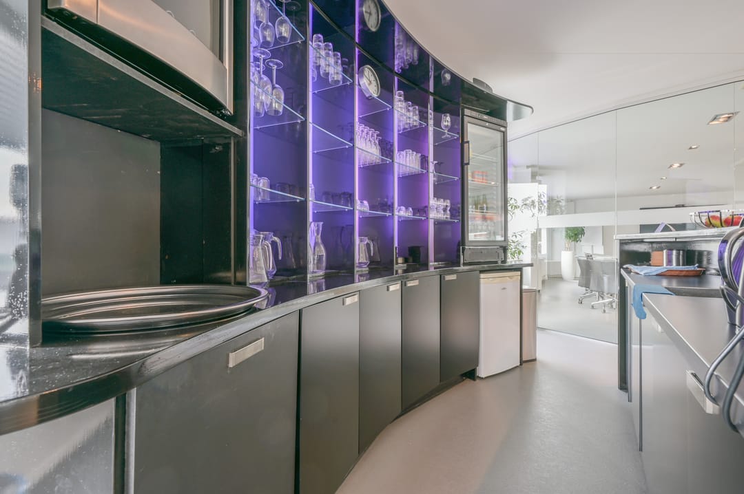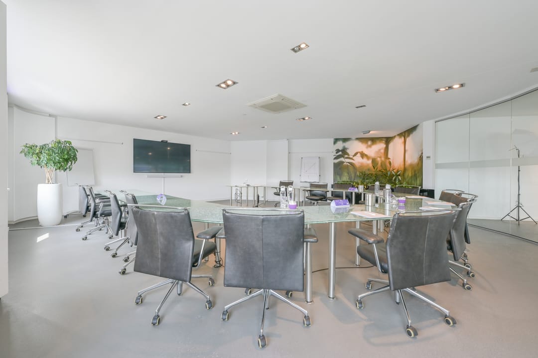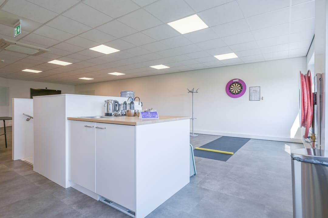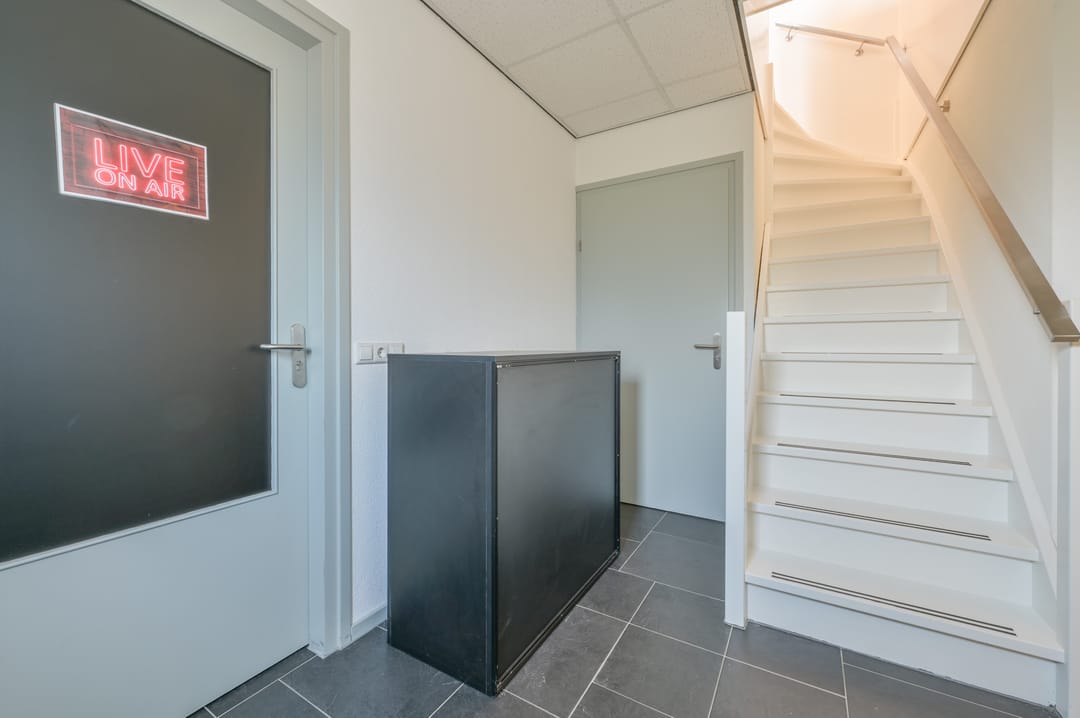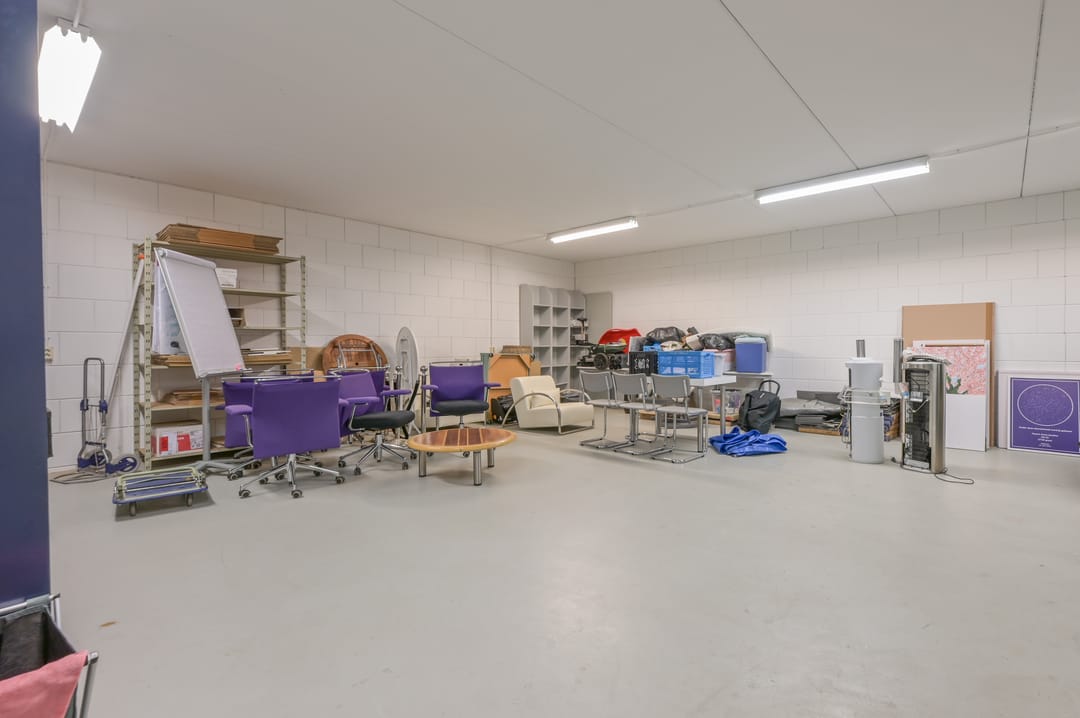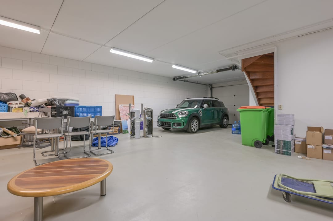 Deze vergaderzaal combineert praktische voorzieningen zoals een complete kitchenette en technische ruimte, met een flexibele inrichting waar werken, vergaderen en ontspannen samenkomen. Vanuit deze vergaderkamer geeft een trap toegang tot de garage en de studio op de begane grond. De garage kan deels door de nieuwe huurder worden gebruikt; een ander deel is in gebruik bij de huurders van de begane grond.