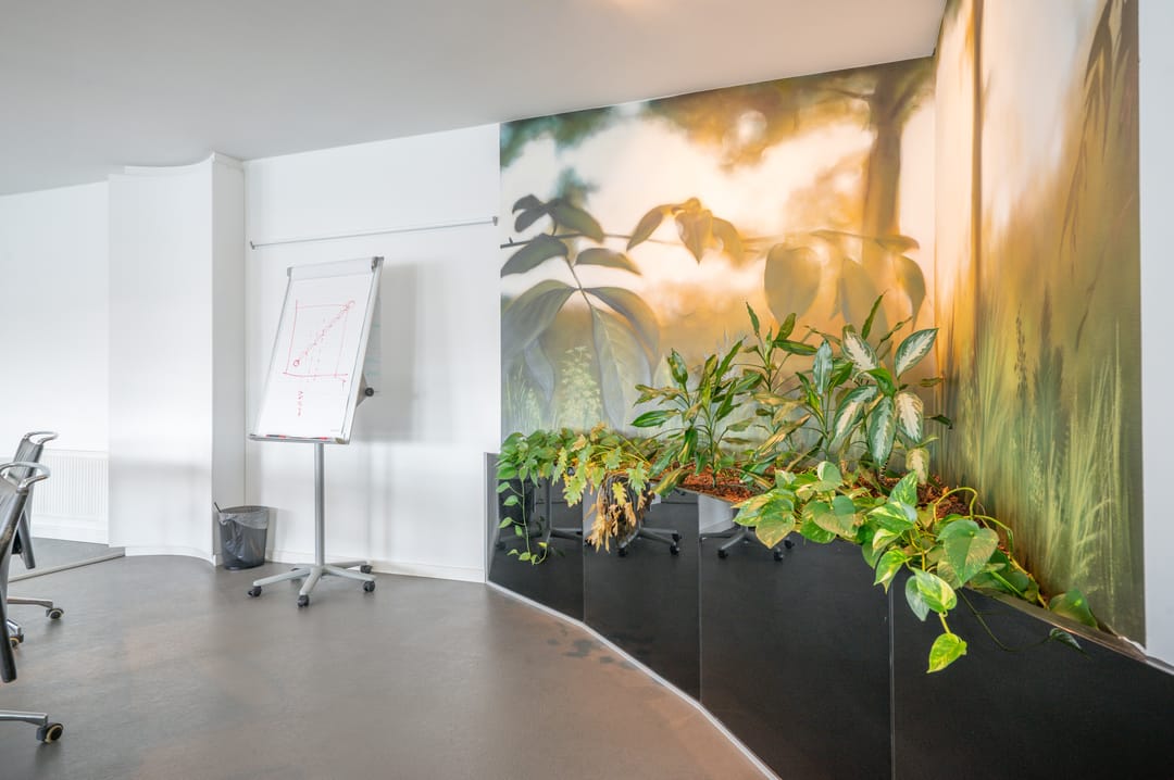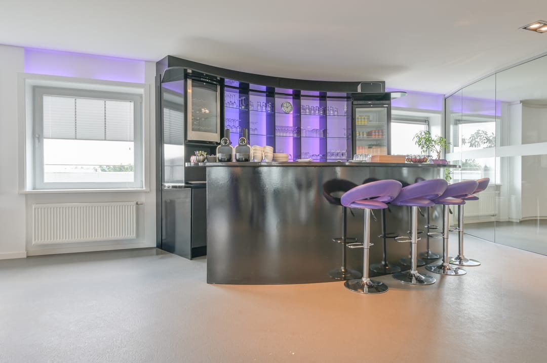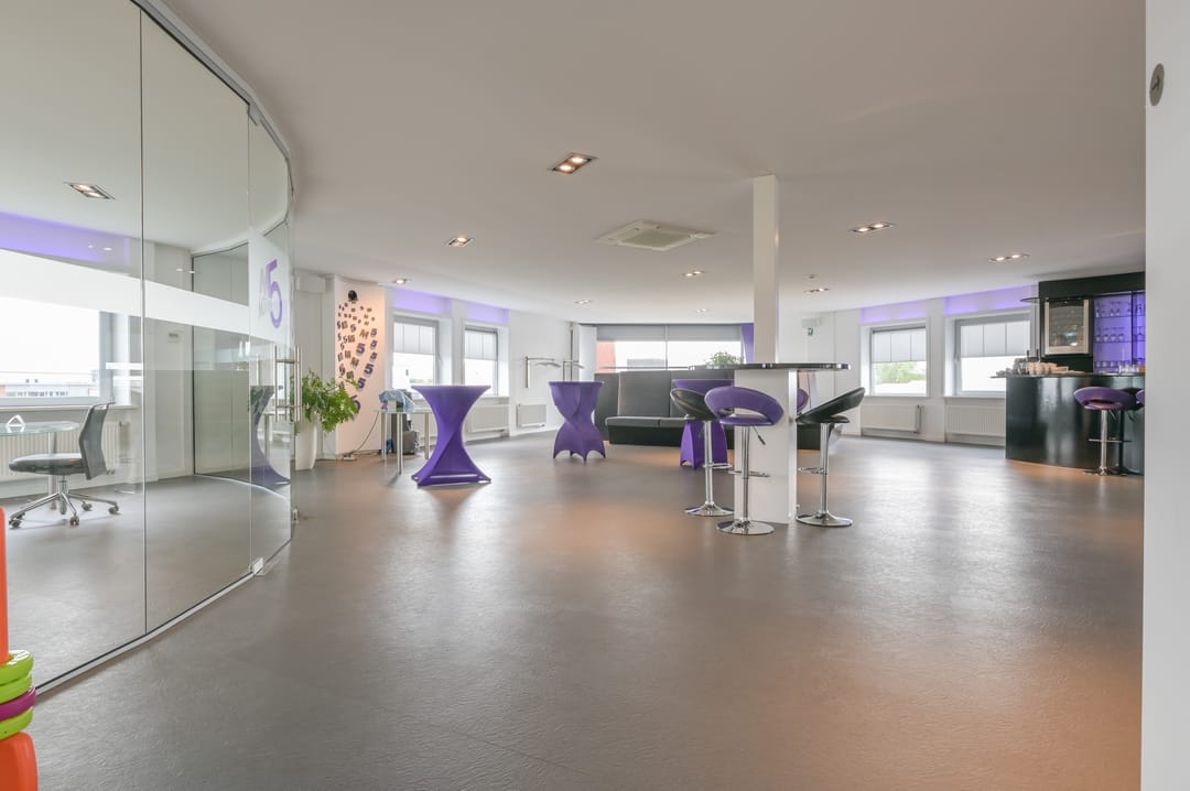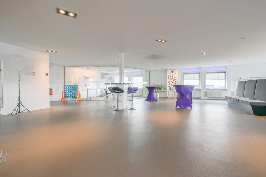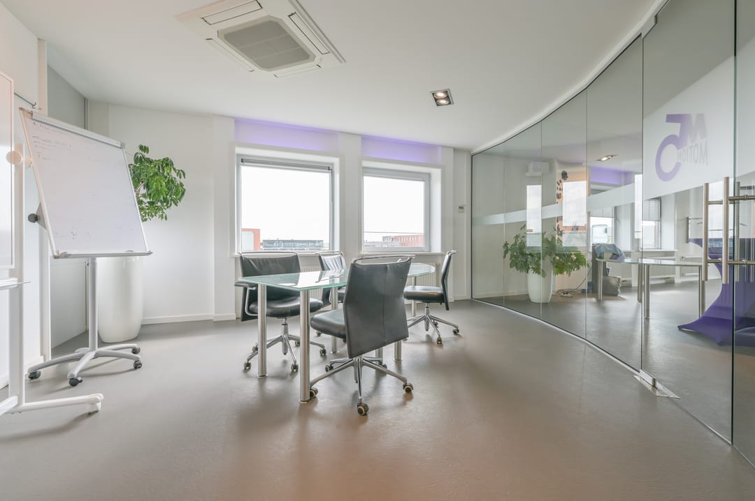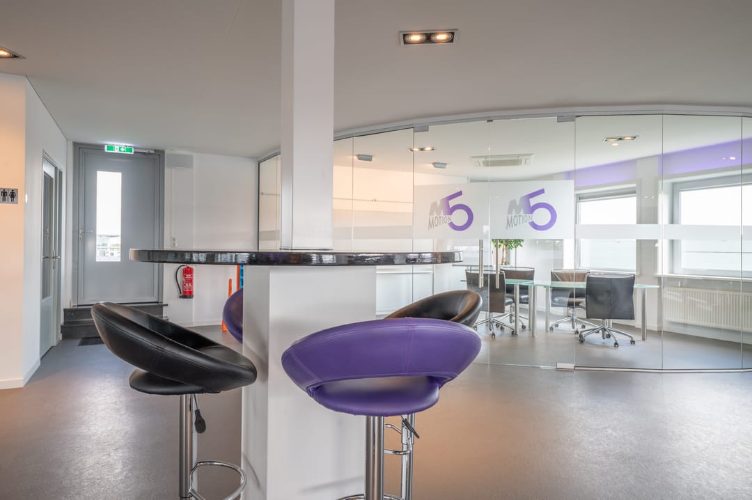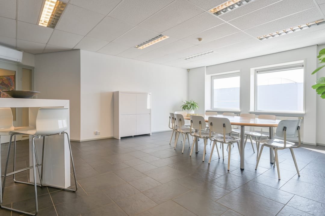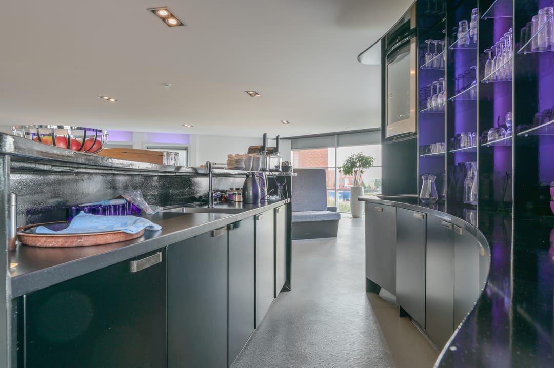 Deze vergaderzaal combineert praktische voorzieningen zoals een complete kitchenette en technische ruimte, met een flexibele inrichting waar werken, vergaderen en ontspannen samenkomen. Vanuit deze vergaderkamer geeft een trap toegang tot de garage en de studio op de begane grond. De garage kan deels door de nieuwe huurder worden gebruikt; een ander deel is in gebruik bij de huurders van de begane grond.