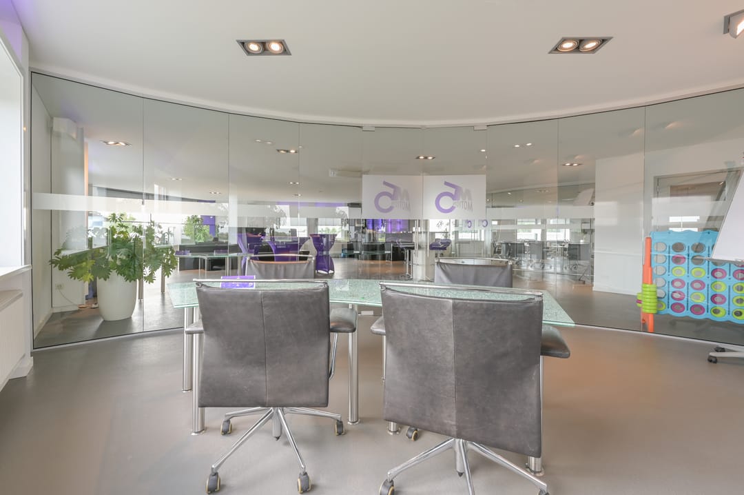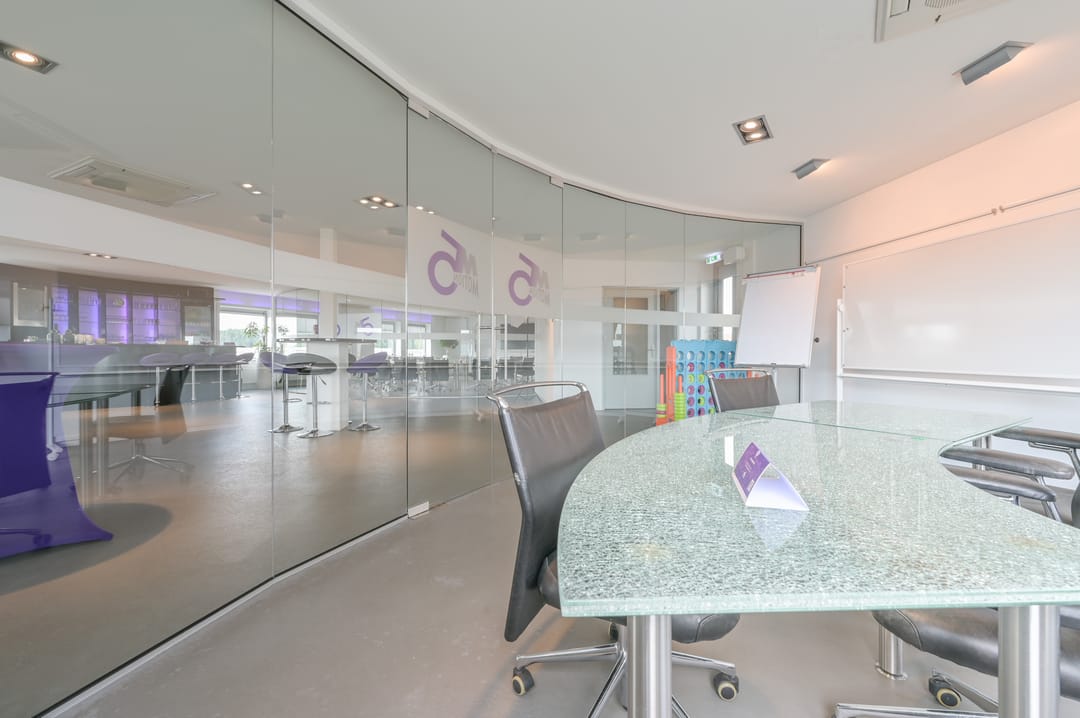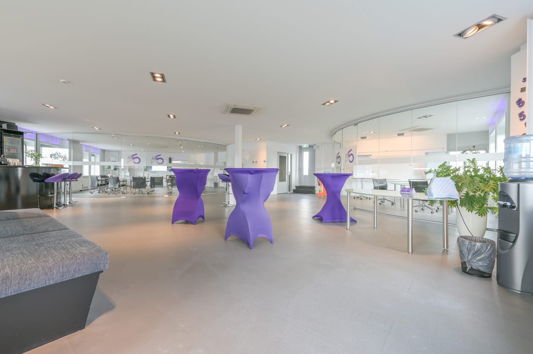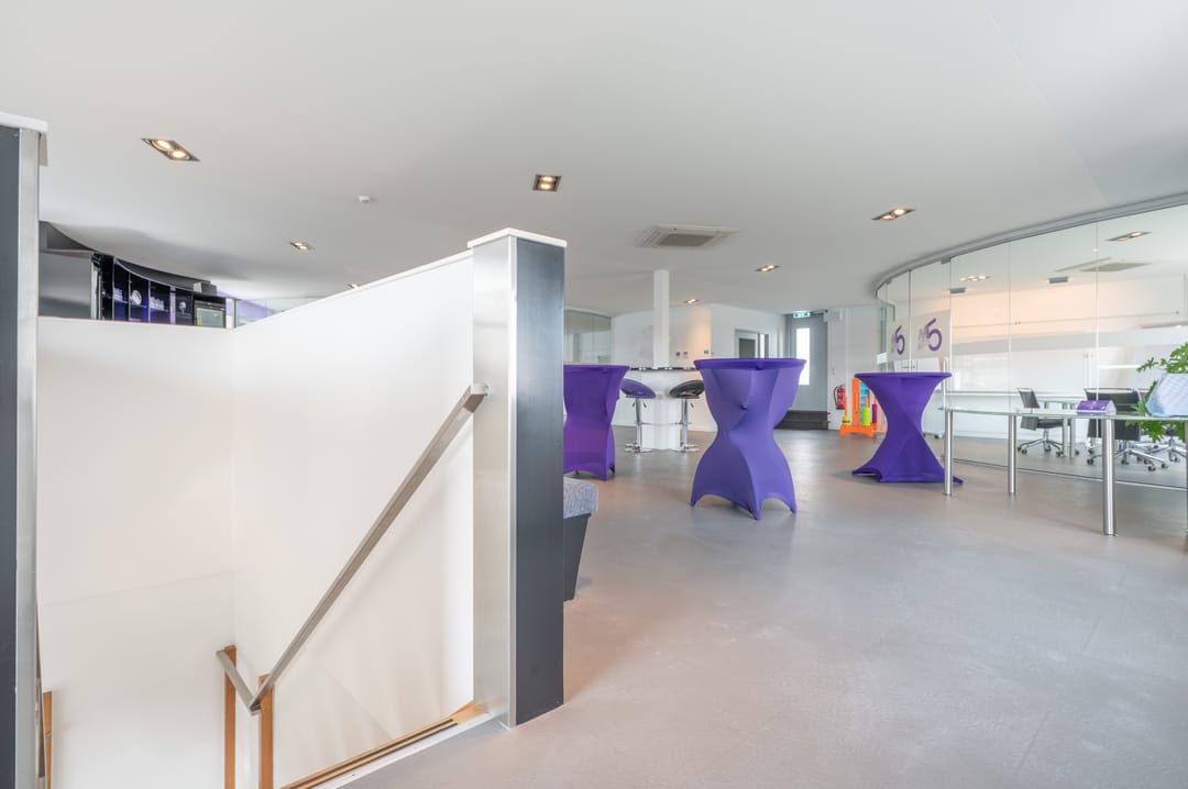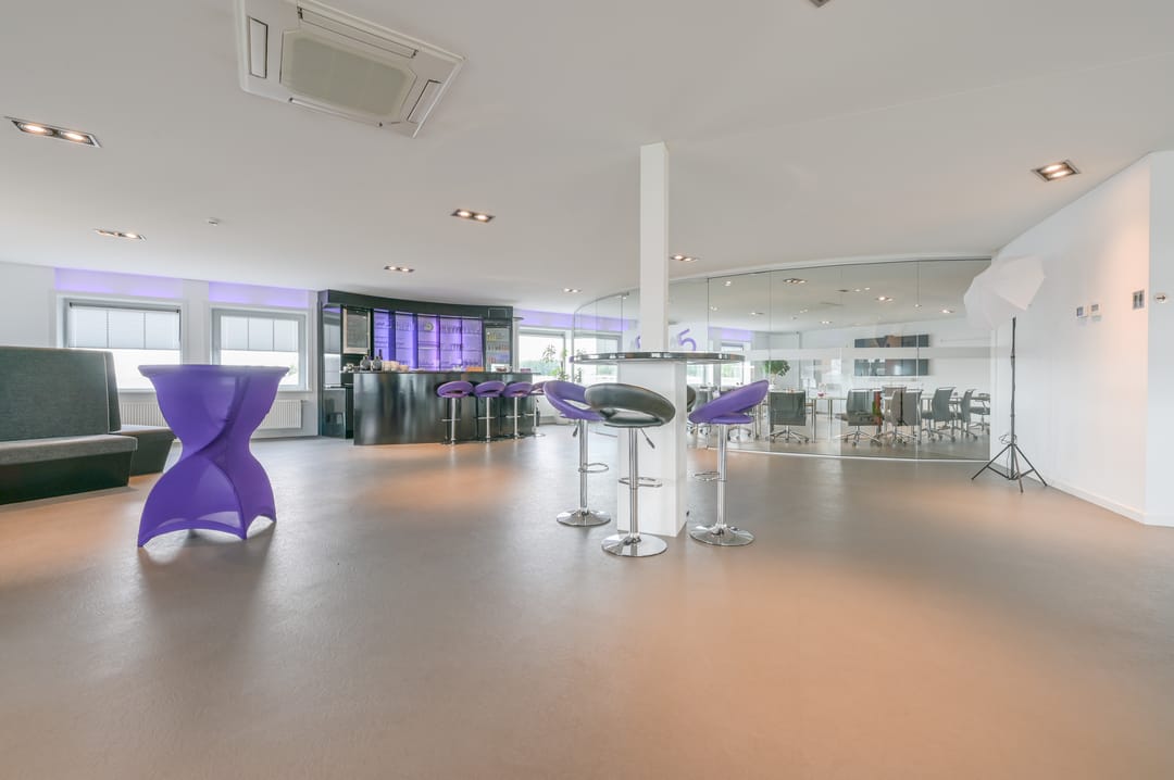 Op de tweede verdieping is een indrukwekkende, ruime vergader-/presentatieruimte die direct opvalt door de halfronde vorm en de volledige glazen wanden, waardoor het een lichte en aangename ruimte is. Deze ruimte, geschikt voor ca. 15 personen, is voorzien van een audiosysteem waardoor het direct klaar is voor presentaties en bijeenkomsten. Naast de presentatieruimte is er een tweede ruimte aanwezig die flexibel gebruikt kan worden als break-out room of als kantoor. In het midden van de ruimte is een bar geplaatst, ideaal voor ontspanning of netwerkgelegenheden. De vloer op deze verdieping is voorzien van pvc-tegels en de ruimte is uitgerust met inbouwspots en garderobe. Daarnaast beschikt deze verdieping over een eigen toiletruimte.