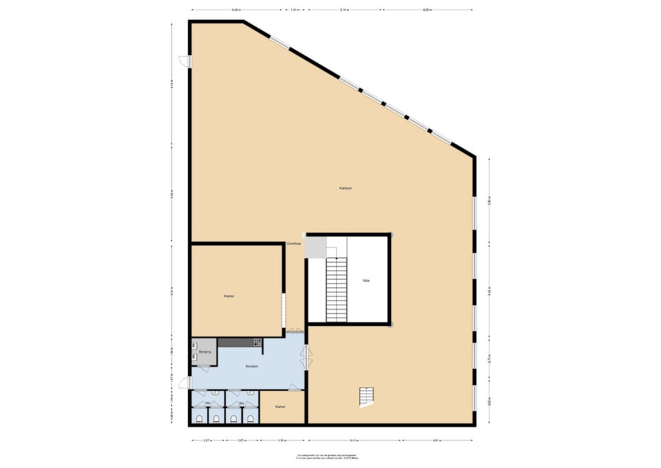 Begane grond: entree, opslagruimte (ruimte beneden ca. 50 m²), grote open (kantoor)ruimte-/showroom met twee aparte kamers met glazenwanden van ca. 540 m² met een prachtig uitzicht over de weilanden en dakterras.