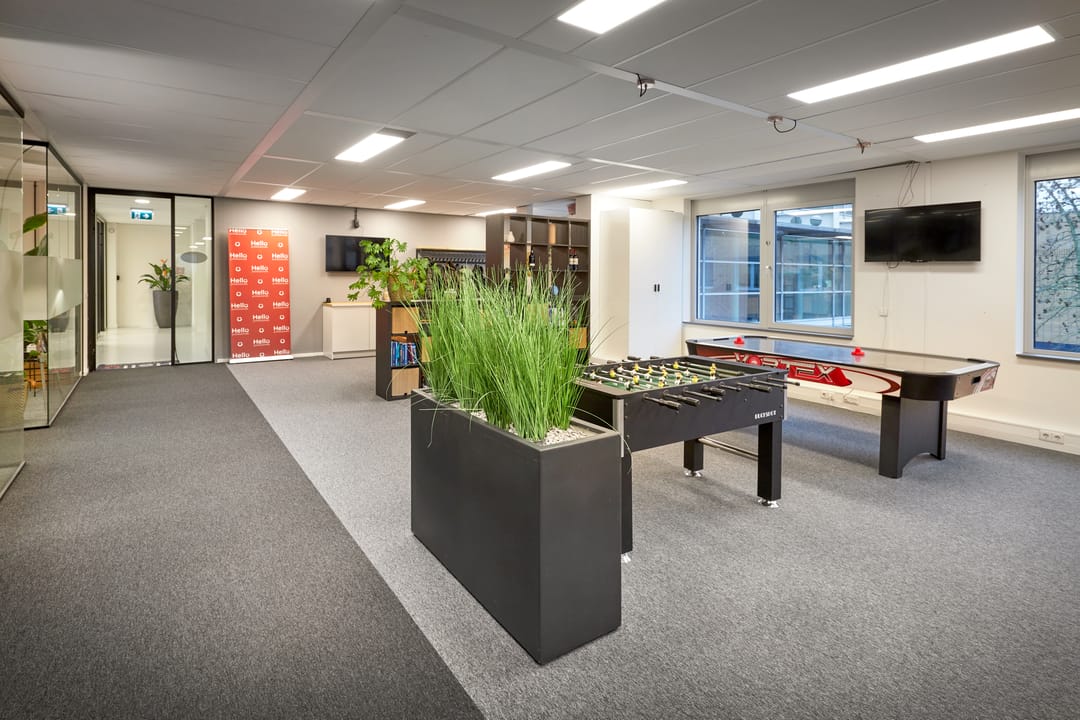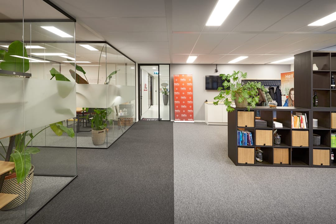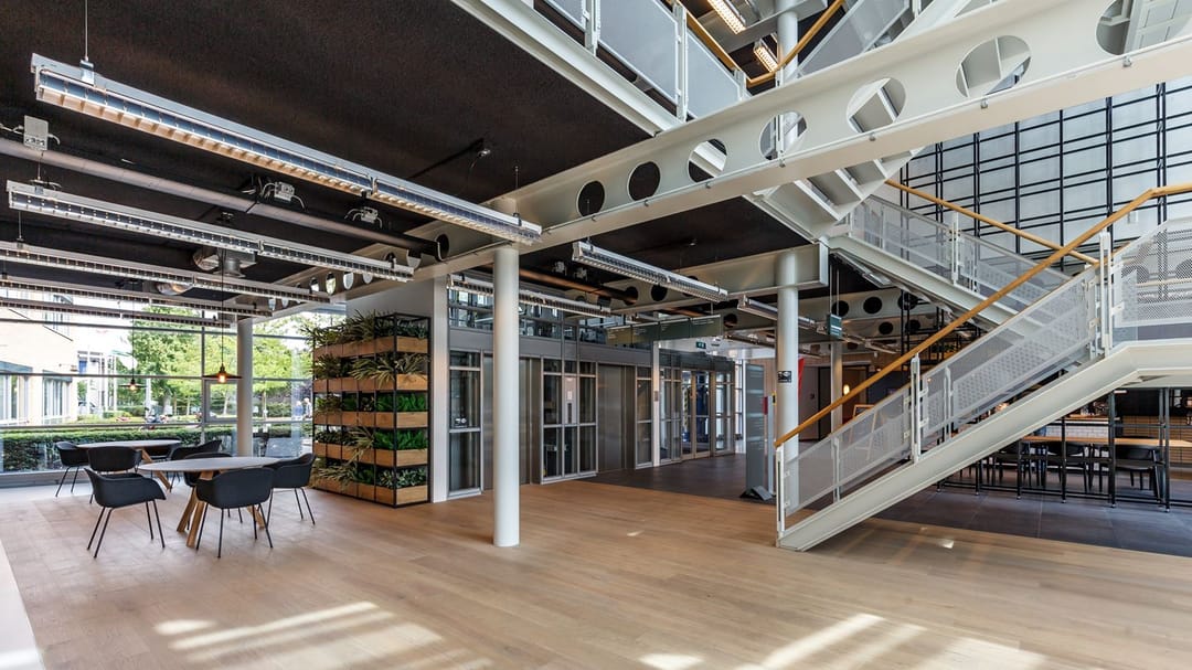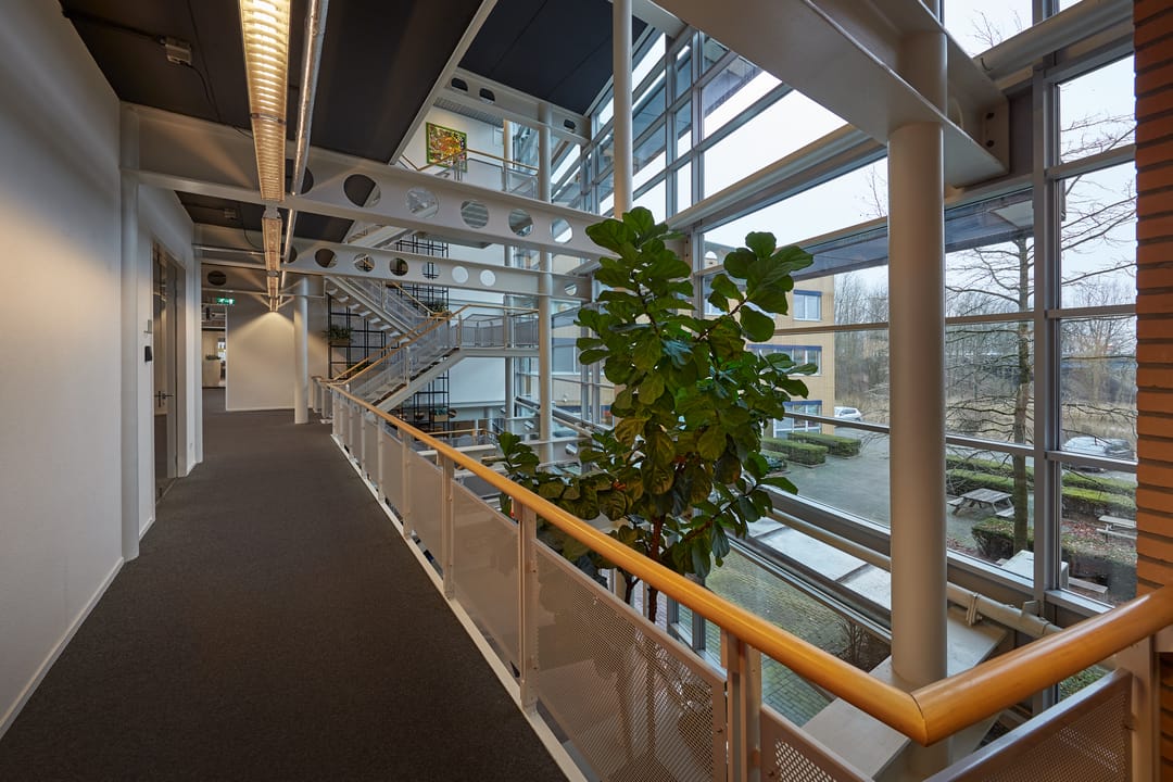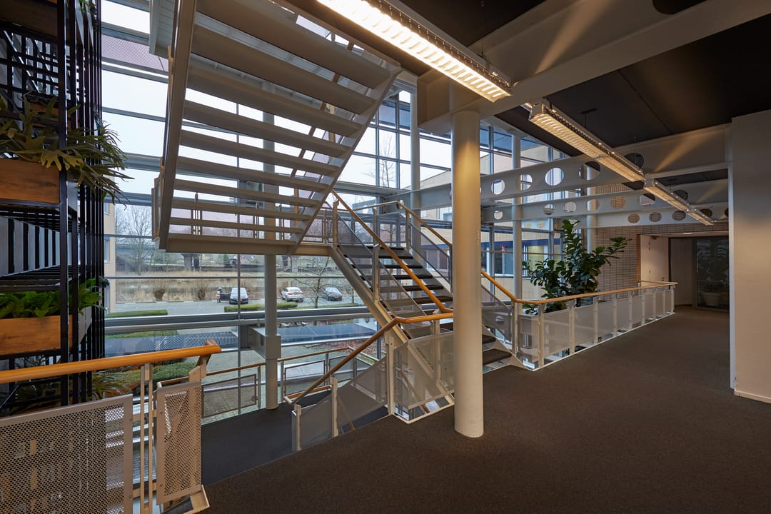 Doordat de pui ter hoogte van de entree volledig in glas is uitgevoerd, is de ontvangstruimte en het trappenhuis, eveneens voorzien van een dubbele liftinstallatie, zeer licht. In combinatie met de horecafaciliteiten die worden aangeboden in de centrale entree op de begane grond maakt dat deze, representatieve, ontvangstruimte eveneens kan worden gebruikt voor een informeel kopje koffie of een lunch met uw relaties en/of medewerkers.