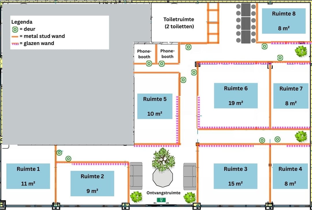 - Gedeelde voorzieningen: ontvangstruimte, keuken, eethoek, phonebooths en toiletten