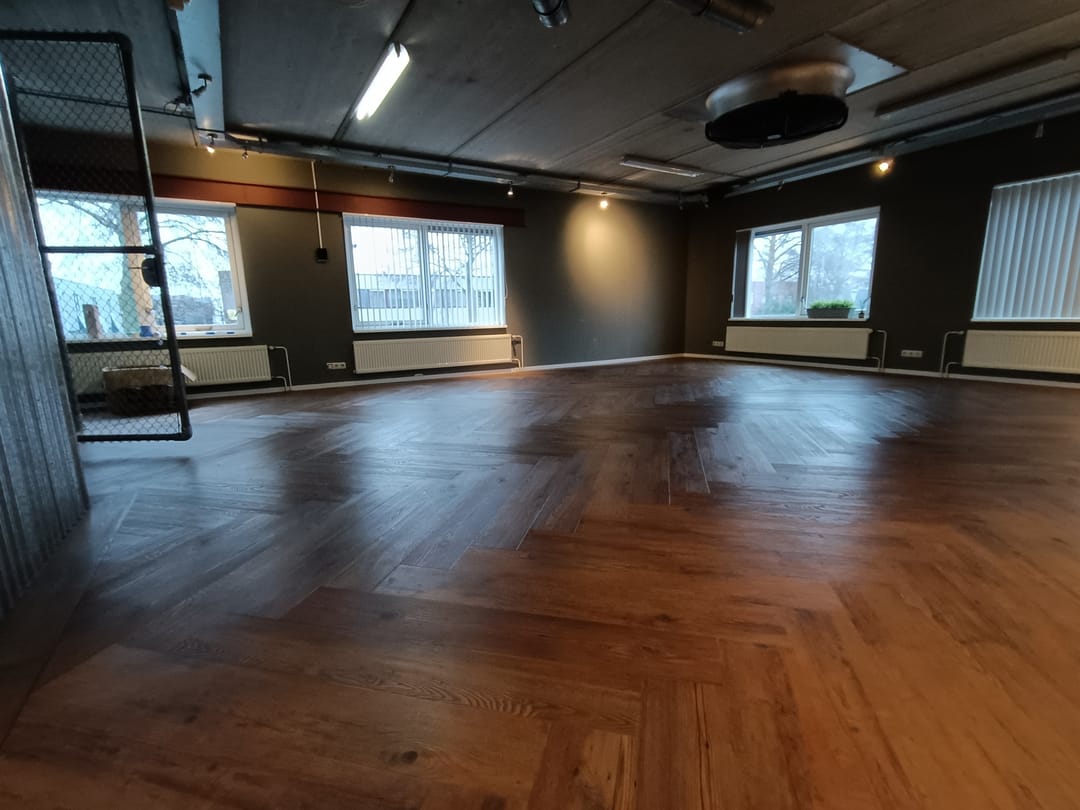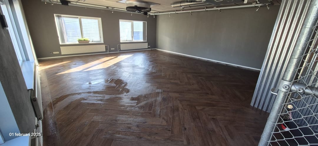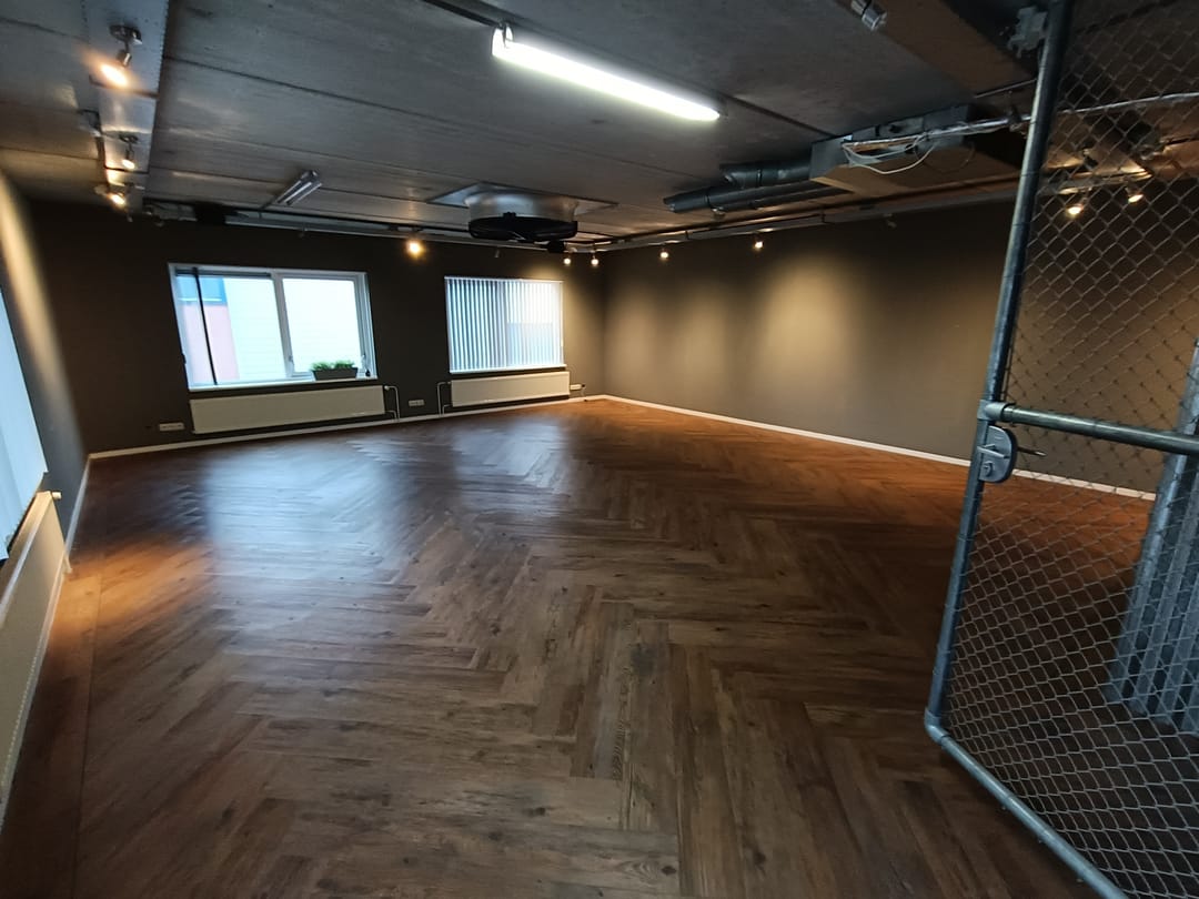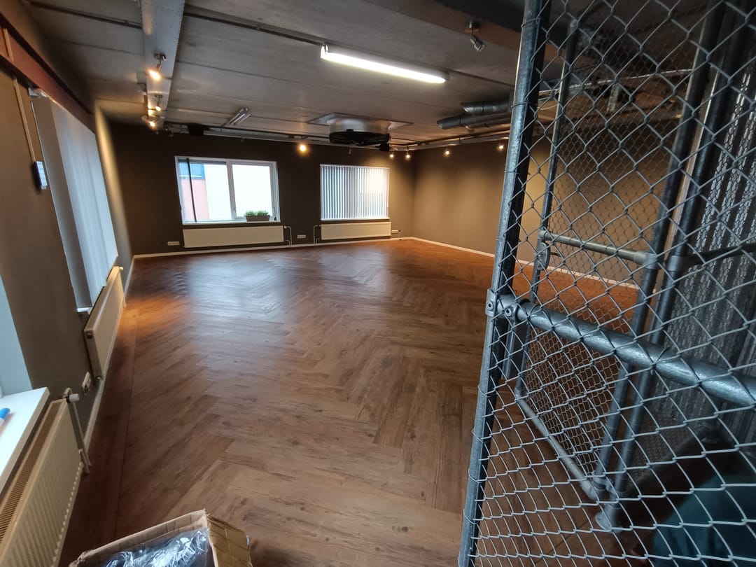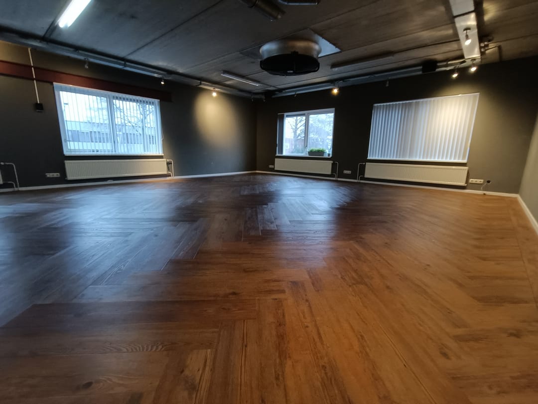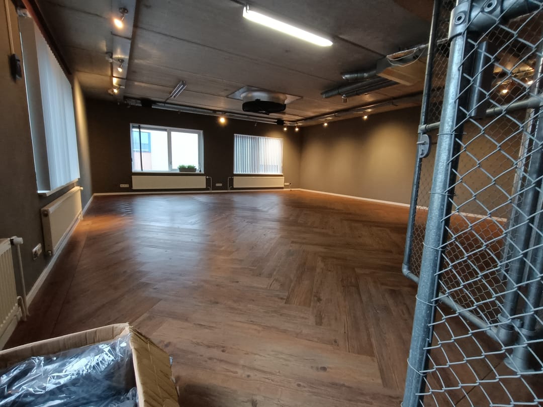de vloer is voorzien van prachtig vissengraat laminaat wat zorgt voor een nette en moderne uitstraling. verder zijn er grote raampartijen aanwezig welke zorgen voor voldoende daglicht.