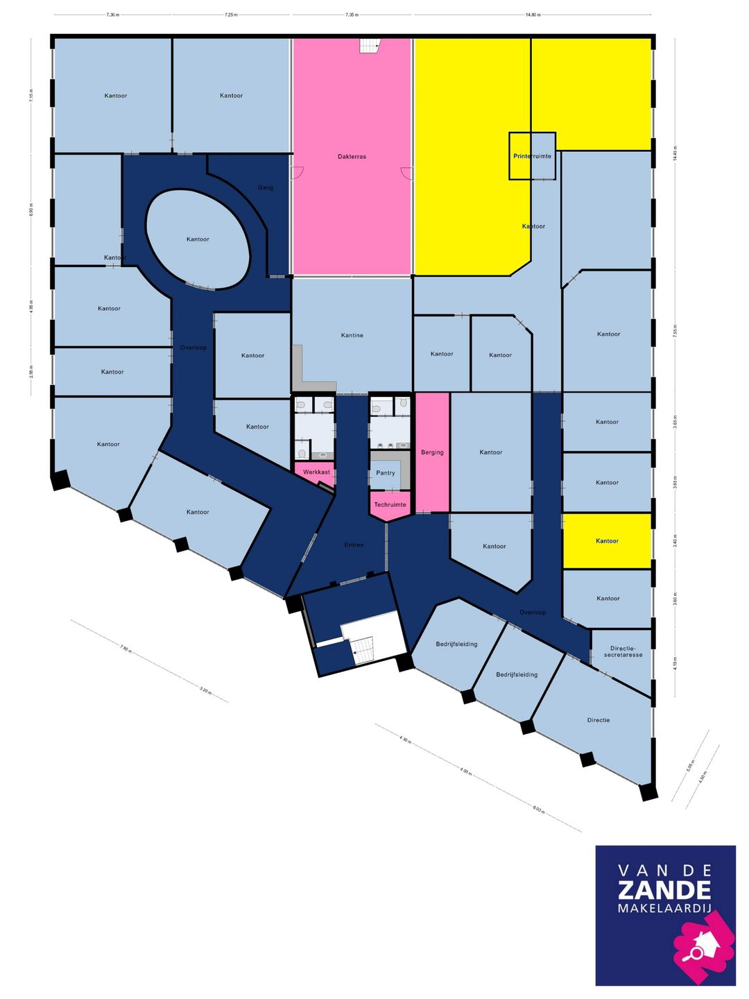 Entree, trapopgang naar verdieping, verschillende kantoorvertrekken, toiletten, kantine, toegang naar dakterras.