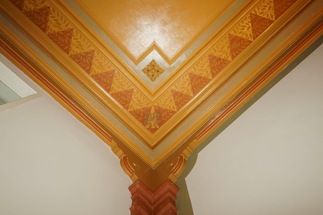 Na de vondsten van de originele muur- en plafondschilderingen is ervoor gekozen om alles naar het originele ontwerp te restaureren. Dit heeft geresulteerd in prachtige ornamenten, muur- en plafondschilderingen in het pand.