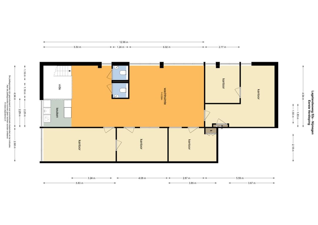 De kantoorruimte is gelegen op de eerste verdieping, beschikt over een eigen entree op de begane grond en is onder andere voorzien van een pantry, dames- en herentoilet en een alarminstallatie.