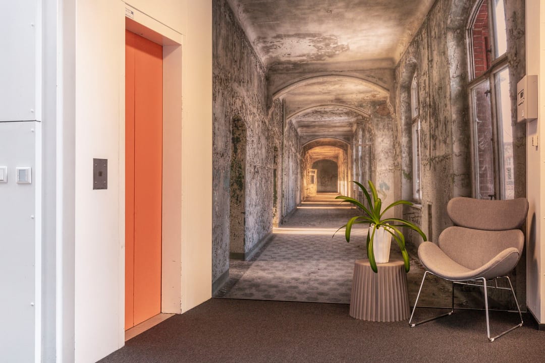 - Mechanical ventilation, built-in fittings, elevators, windows can be opened, cable ducts, modular ceiling, toilet, pantry, heating and room layout