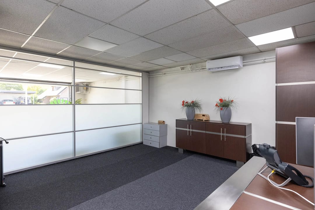 Ruimte is nu ingericht met glazen systeemwanden die ook te demonteren zijn zodat er een grote ruimte beschikbaar komt. Terrein achter is d.m.v. een hek af te sluiten.