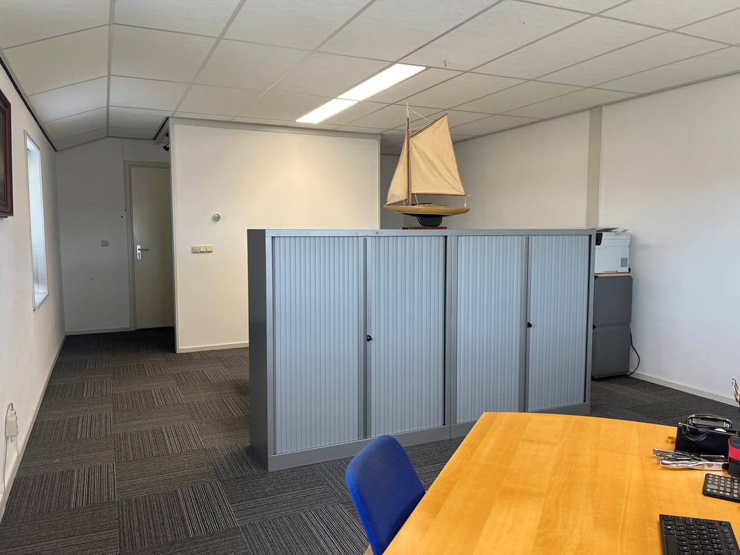 Tevens is er een kantoorruimte op de verdieping beschikbaar van ca. 45m2, deze heeft een huurpijs van € 425,-- per maand, alsmede servicekosten van € 30,-- per maand.