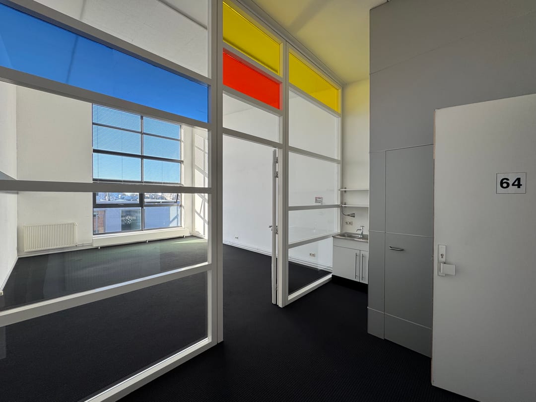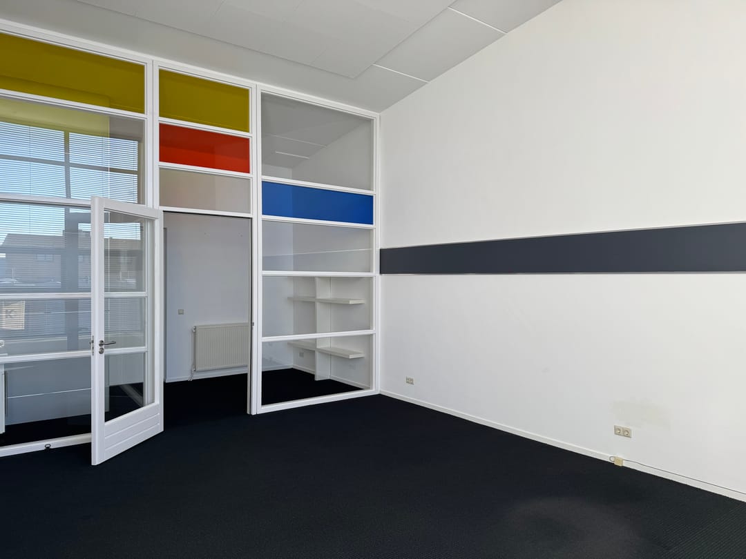 Deze kantoorruimte is ideaal voor professionals die op zoek zijn naar een inspirerende, goed verlichte en praktische werkplek in Noordwijk. Het kunstwerk van Piet Mondriaan in het raamkozijn voegt een uniek en creatief element toe aan de ruimte, waardoor het zich onderscheidt van traditionele kantoorruimtes.