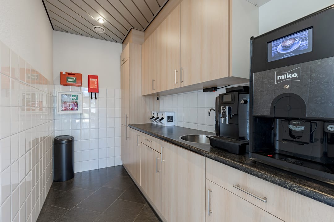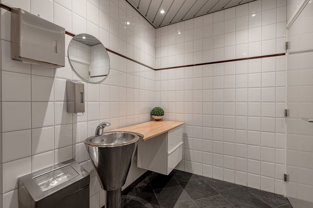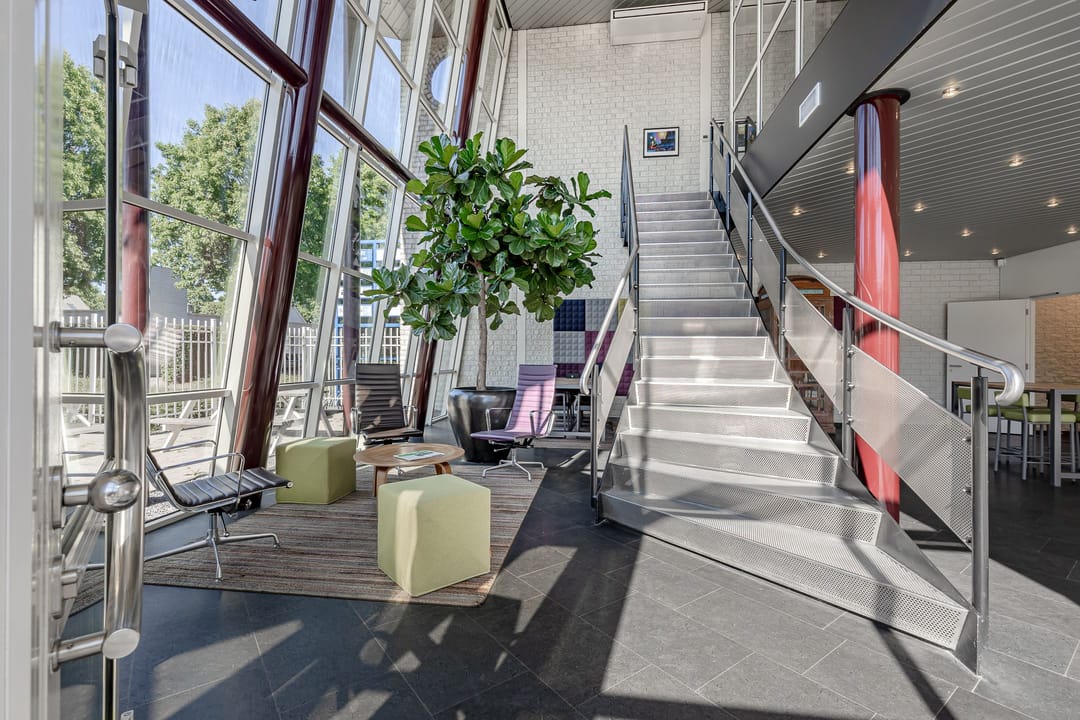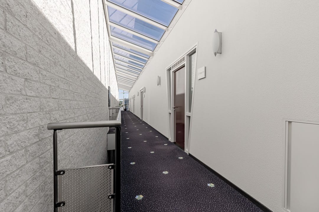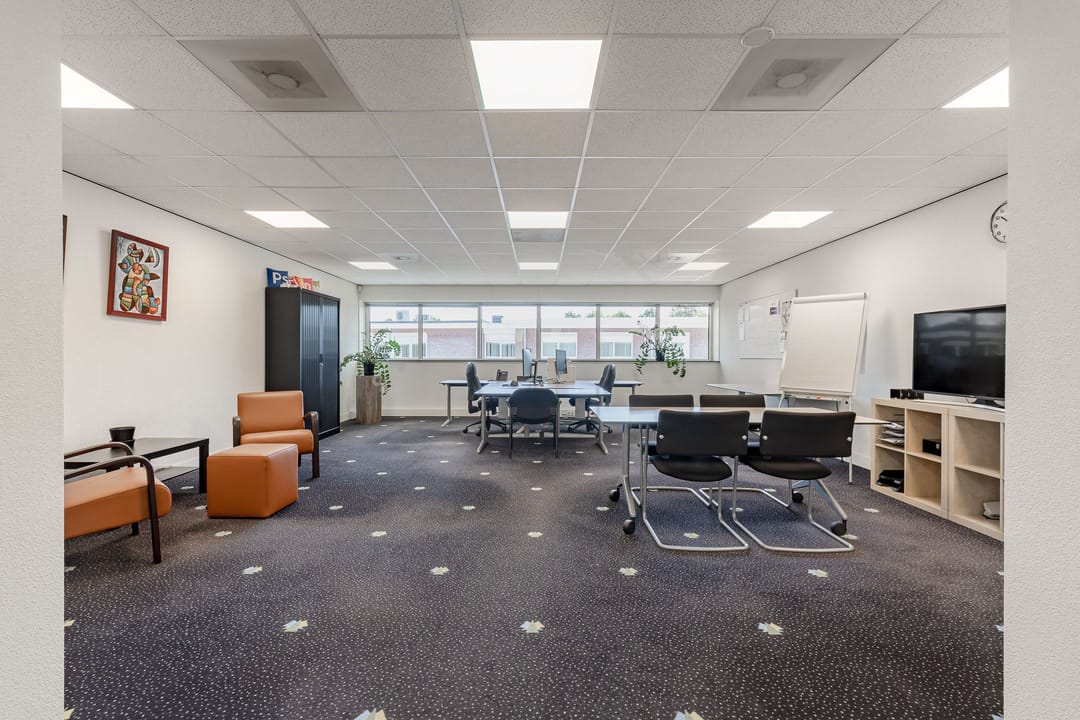 De kantoorruimte bevindt zich op de eerste verdieping. De ruimte is voorzien van systeemplafond met led inbouwarmaturen en een airco-unit om te verwarmen en te koelen.