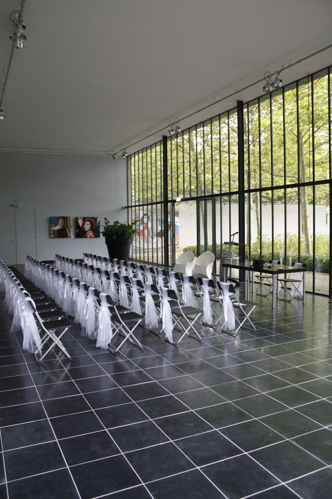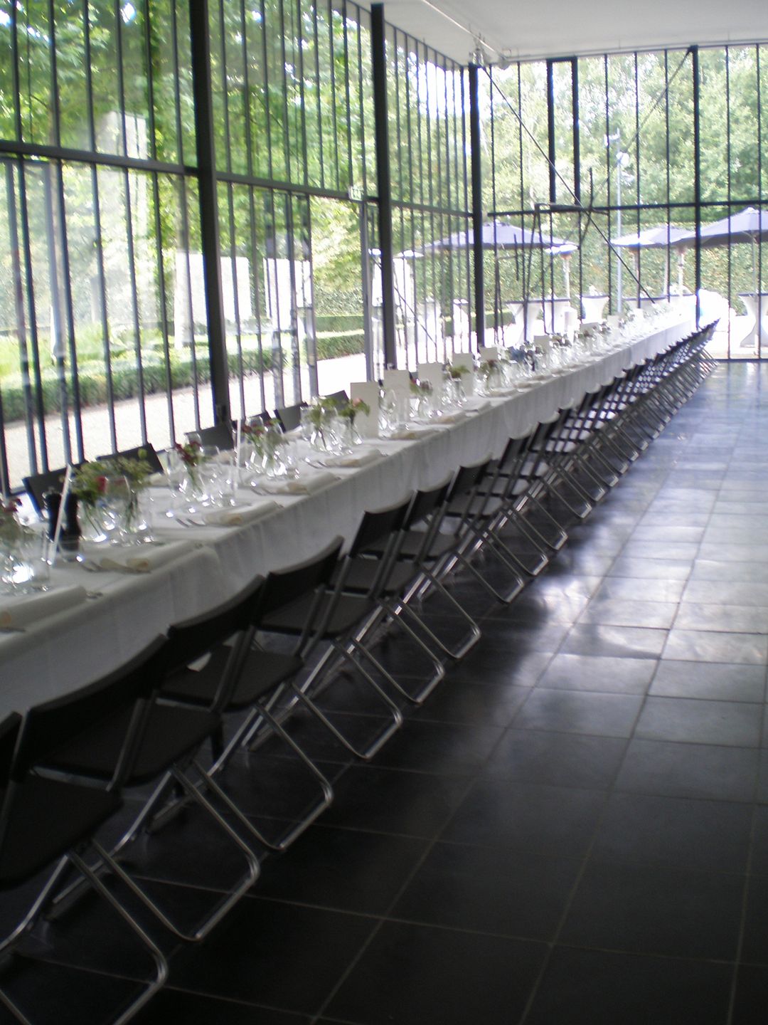 - harmonische overgang tussen binnen en buiten o.a. door hoge glazen puien;