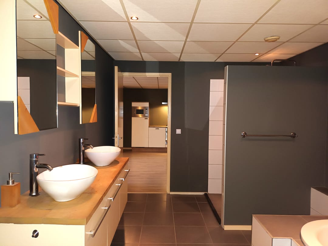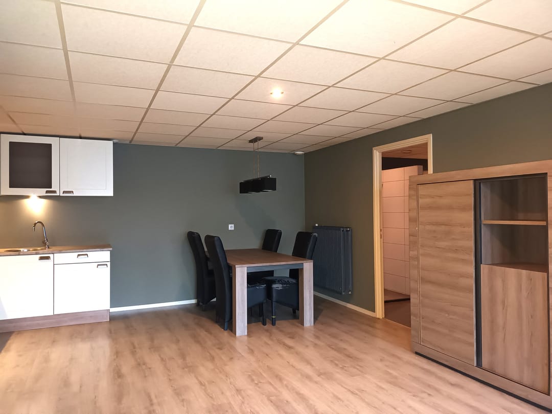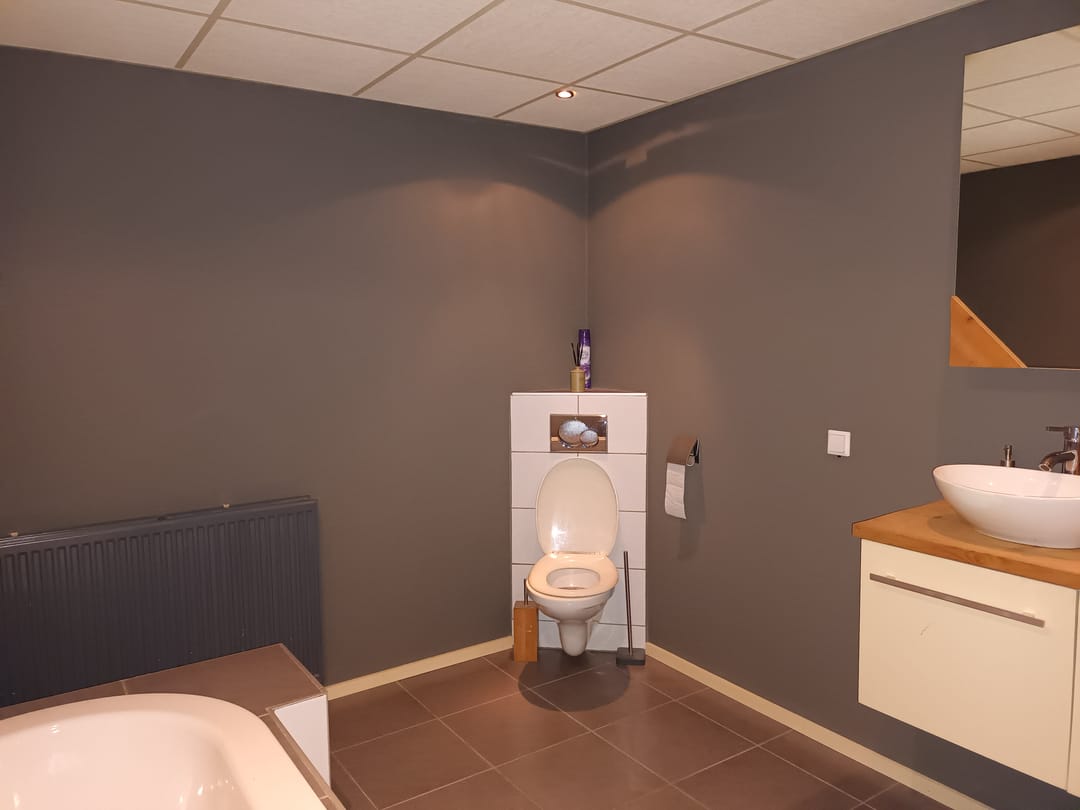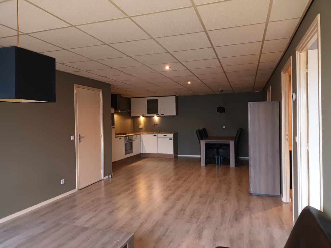 - Systeemplafond met inbouwspots, doorgelegde laminaatvloer.