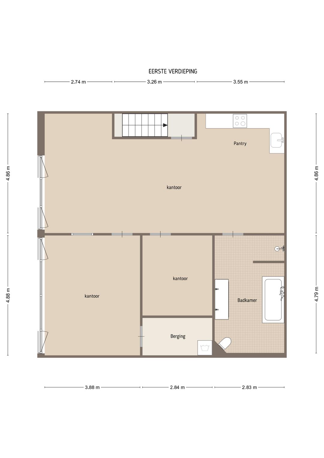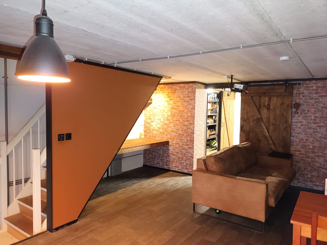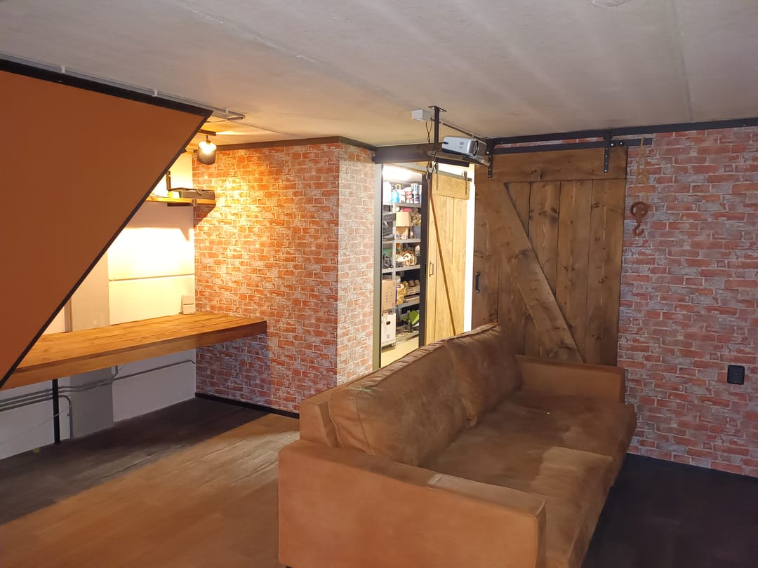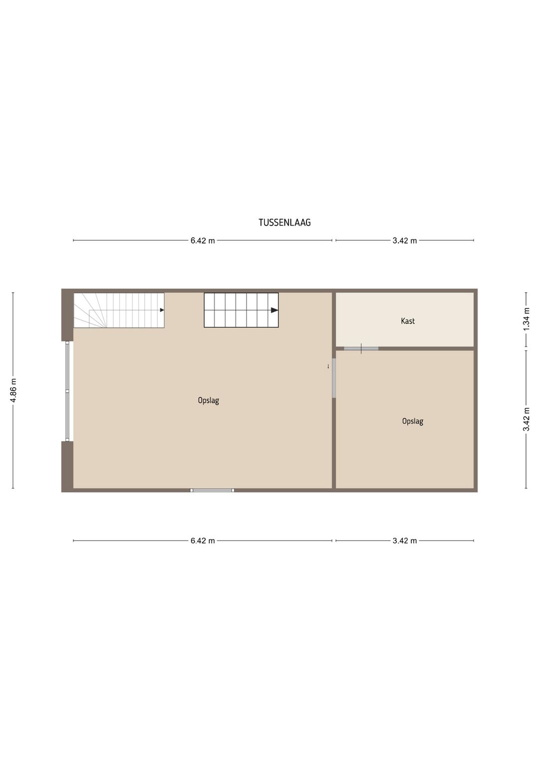 - Halverwege de trap naar de eerste verdieping is een tussenlaag (ca. 48 m²) gerealiseerd. Deze is eventueel optioneel tegen meerprijs erbij te huren en mogelijk geschikt als opslagruimte / archief etc.