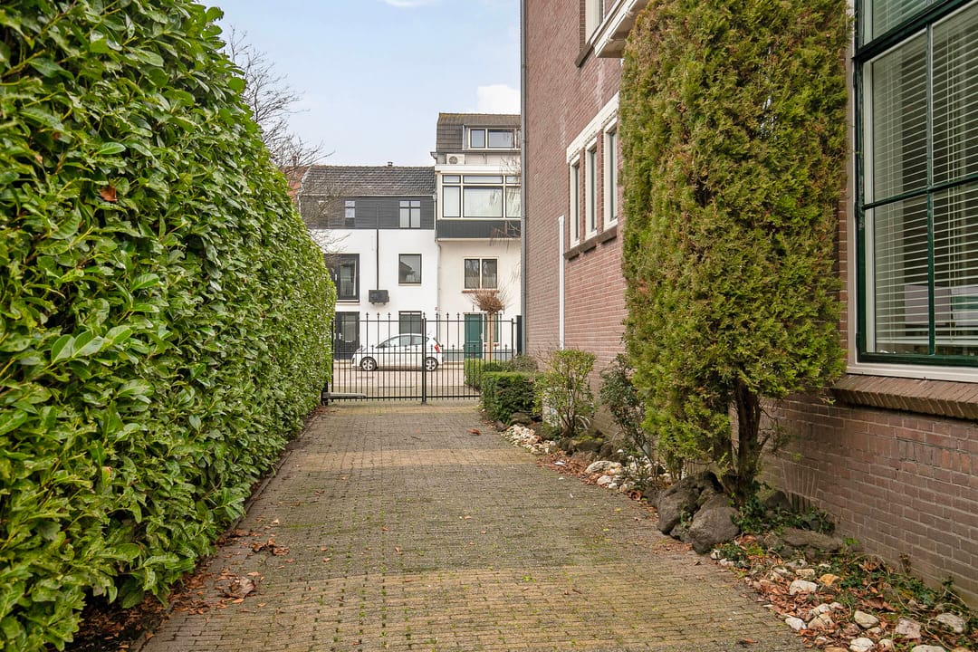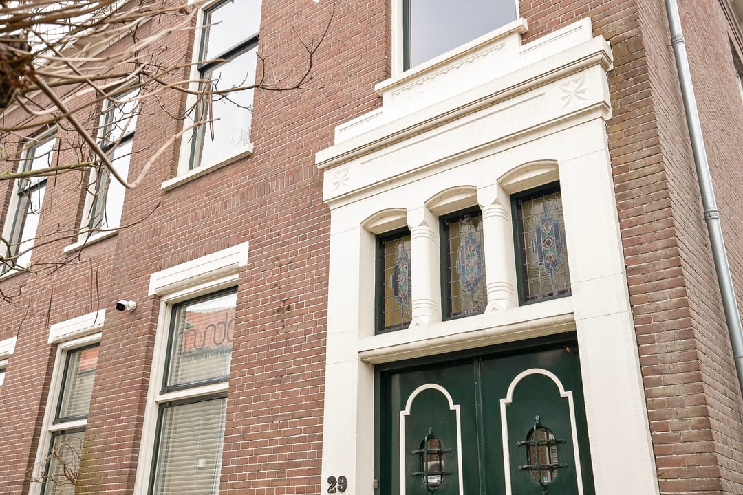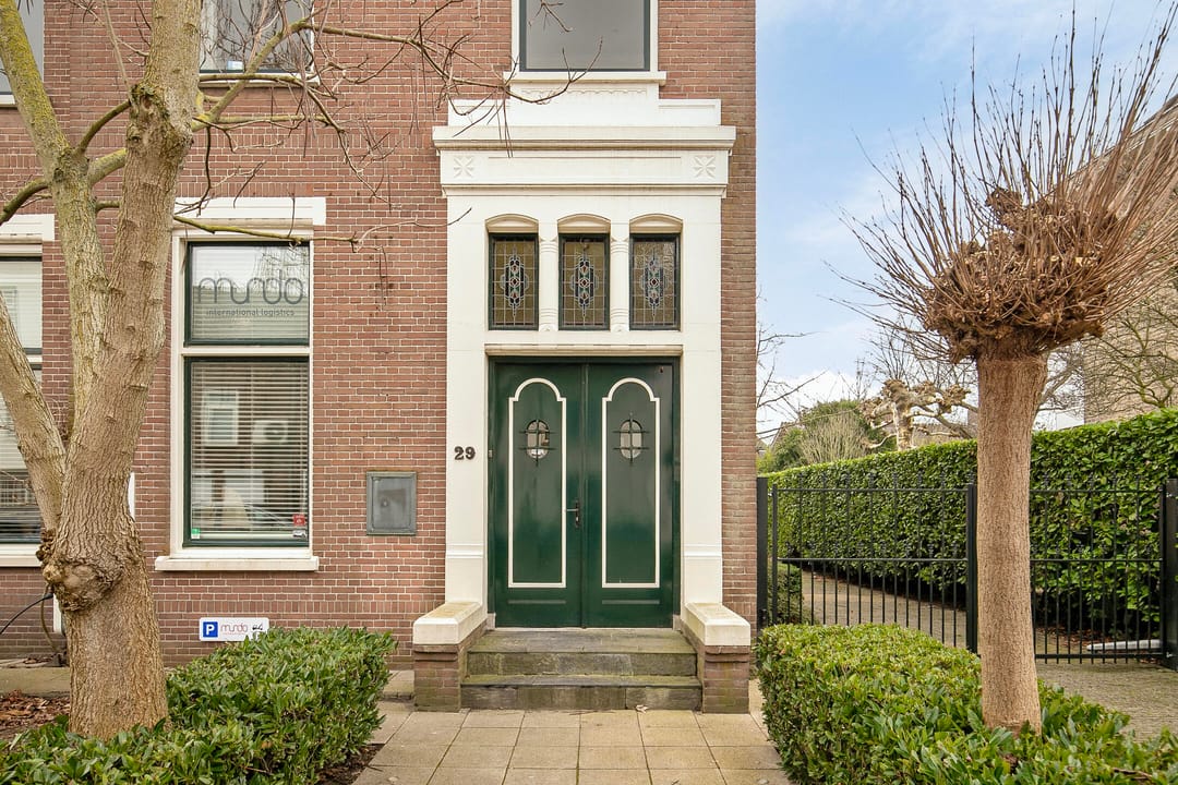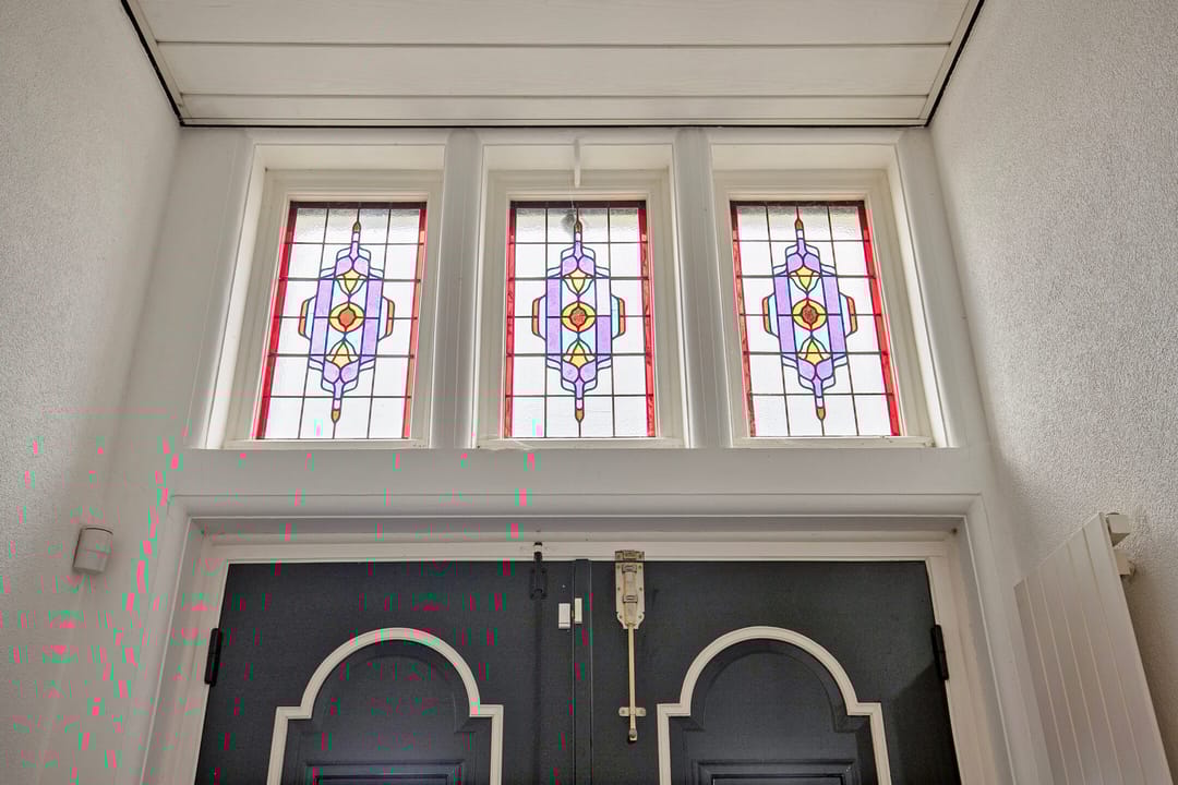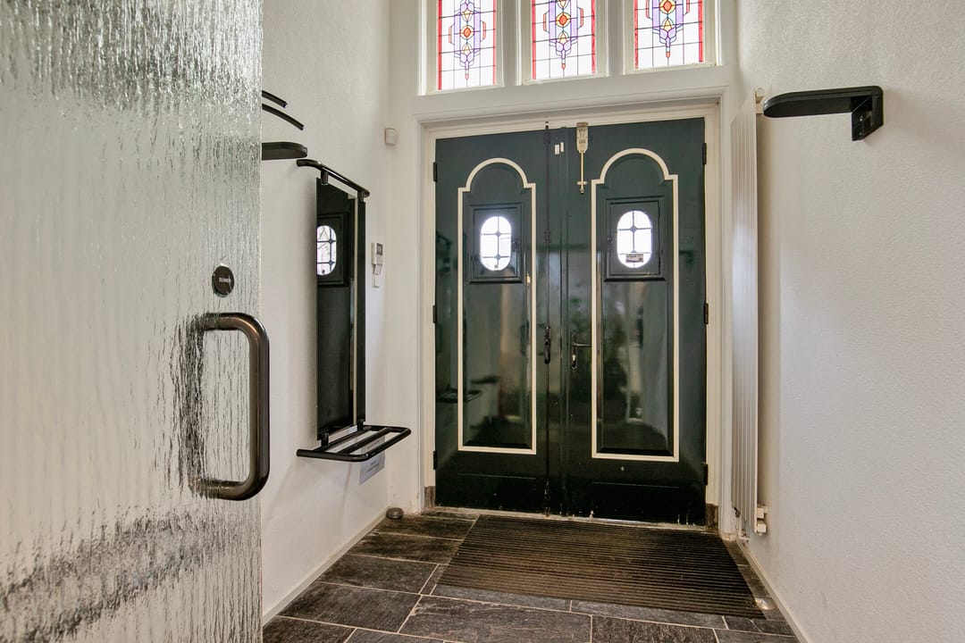 Statige entree met bordes en dubbele toegangsdeur aan de rechterzijde van de klassieke voorgevel. Ontvangsthal met fraaie glas-in-lood ramen en via glazen deuren toegang tot een centrale hal met receptiemogelijkheid en toegang tot twee aparte spreek-/werkkamers. Ook is de centraal gelegen kantoortuin vanuit deze ruimte bereikbaar.