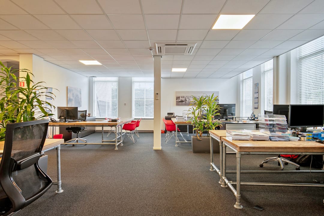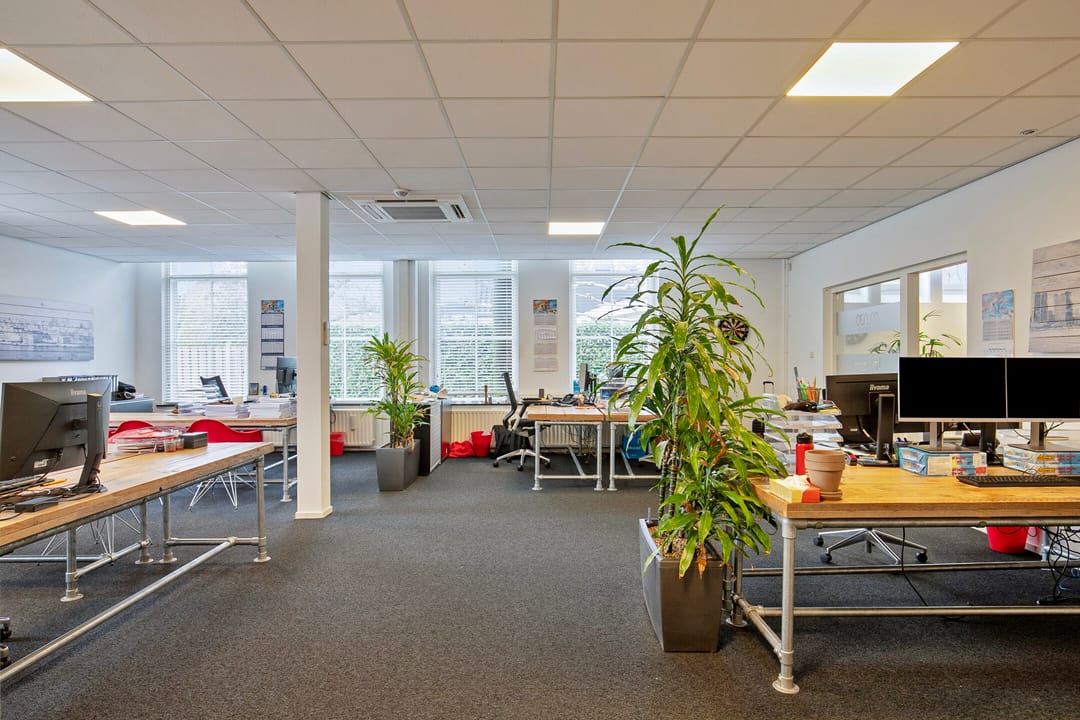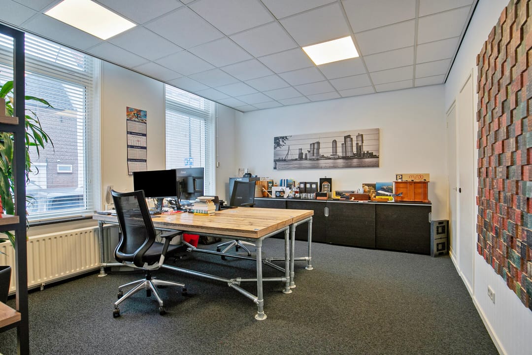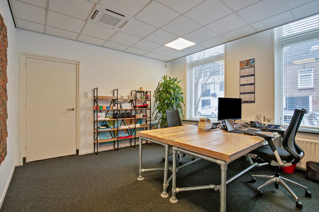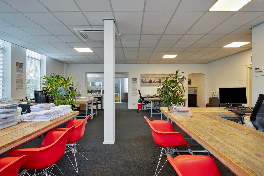 De centrale kantoorruimte heeft ook veel lichtinval vanwege de hoge ramen, zowel in de achter- als zijgevel en biedt ruimte aan minimaal 6 tot 8 werkplekken. Indien wenselijk is op eenvoudige wijze deze grote centrale kantoorruimte ook op te splitsen in meerdere ruimten.