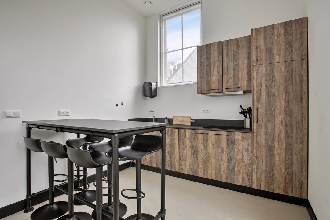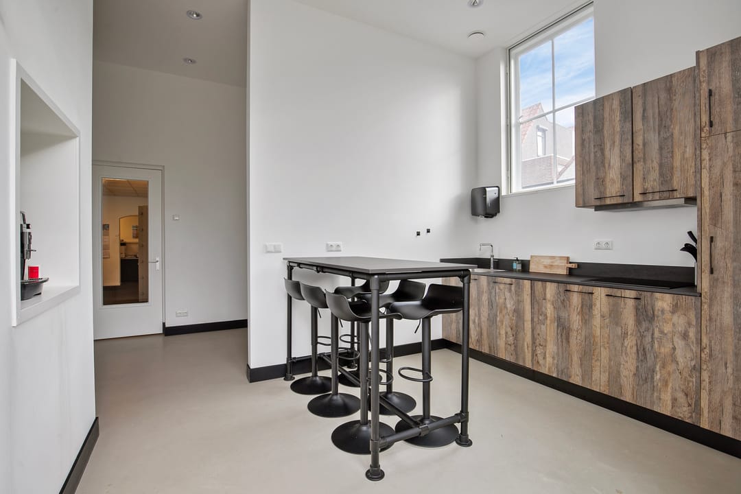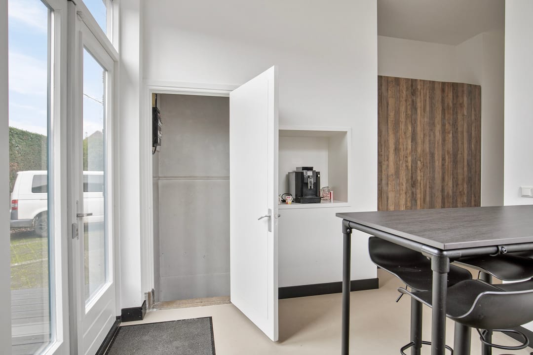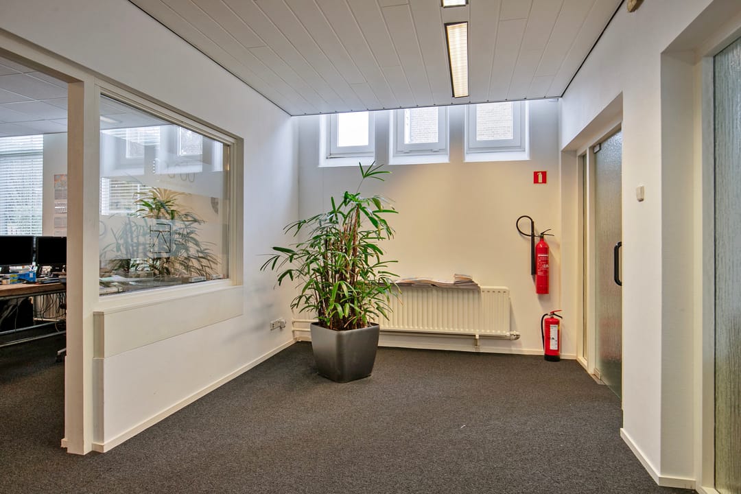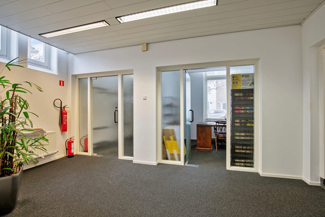 De centrale kantoorruimte heeft ook veel lichtinval vanwege de hoge ramen, zowel in de achter- als zijgevel en biedt ruimte aan minimaal 6 tot 8 werkplekken. Indien wenselijk is op eenvoudige wijze deze grote centrale kantoorruimte ook op te splitsen in meerdere ruimten.