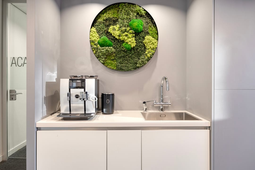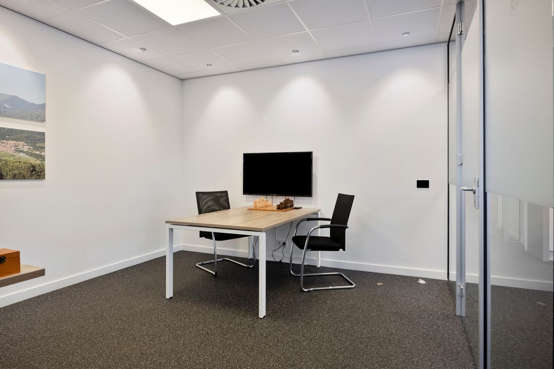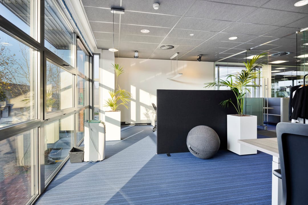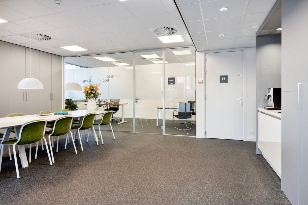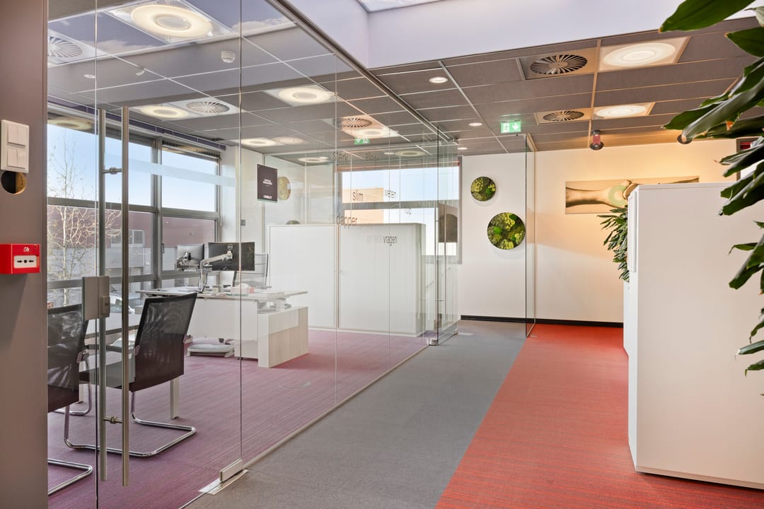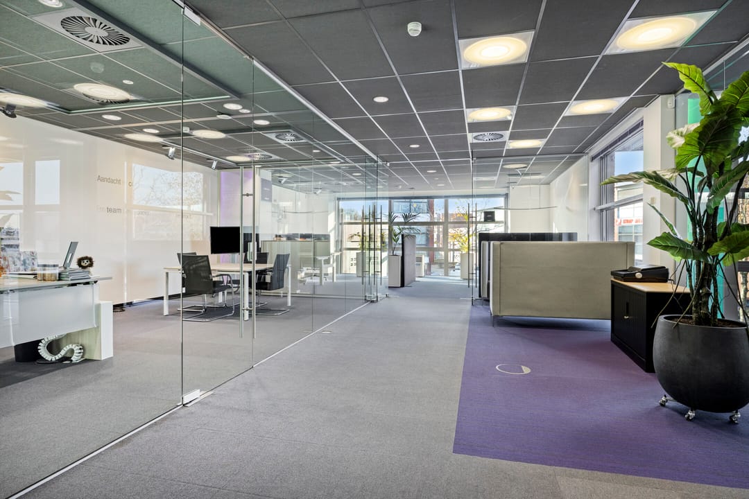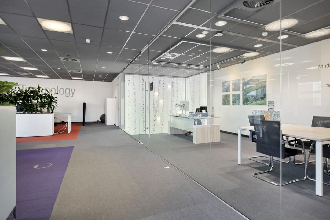- Ruimte ingedeeld in diverse vertrekken door middel van glazen wanden;
