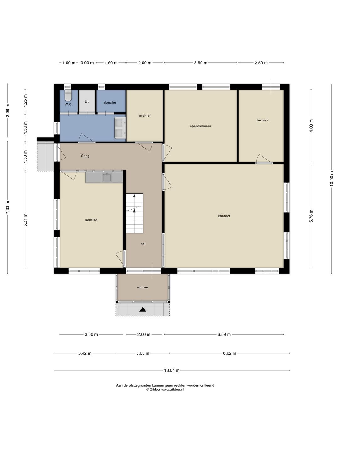 Hal/entree, kantoor, spreekkamer, techniekruimte, kantine/kantoor, toilet/douche/wasruimte. Totaal ca. 135 m2