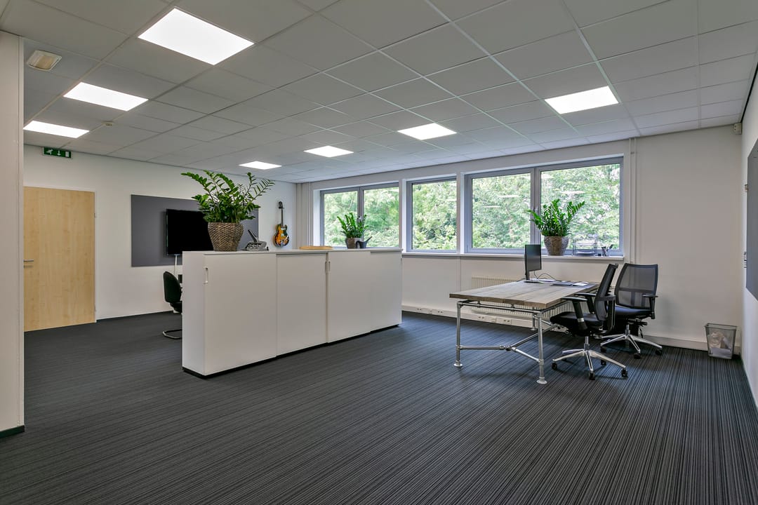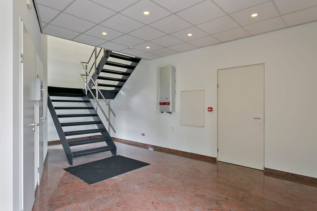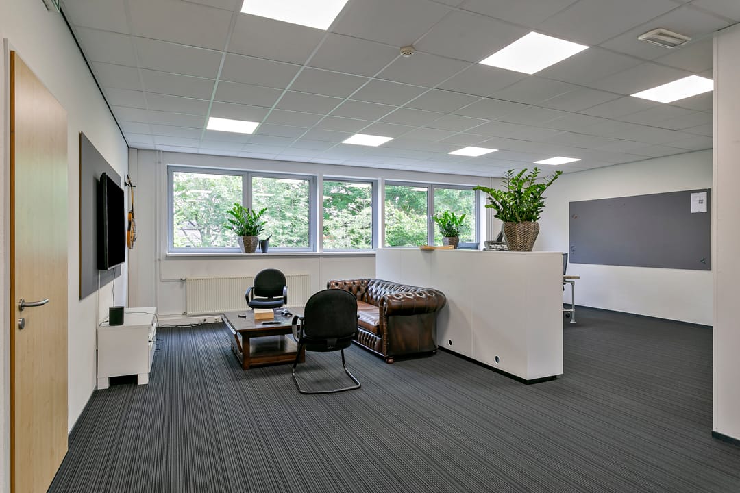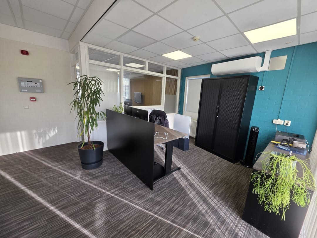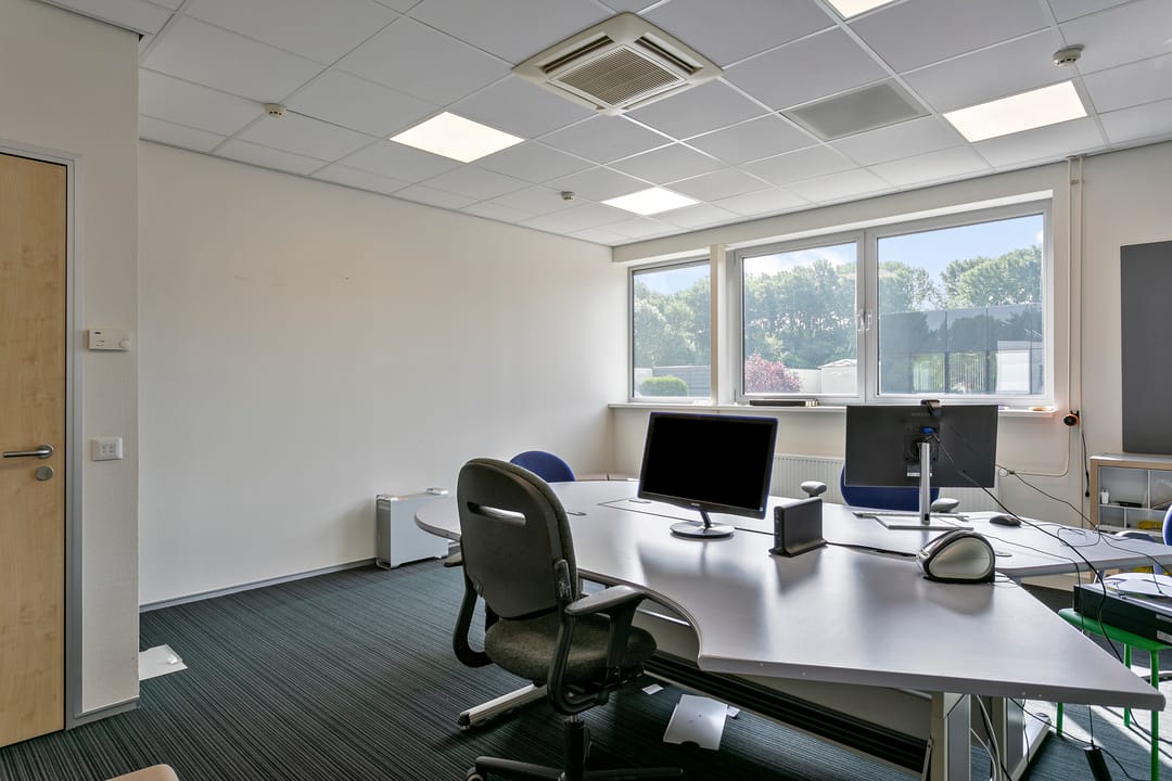 - Kantoorruimten zijn voorzien van vloerbedekking en lamellen;