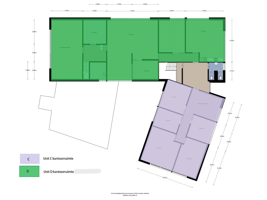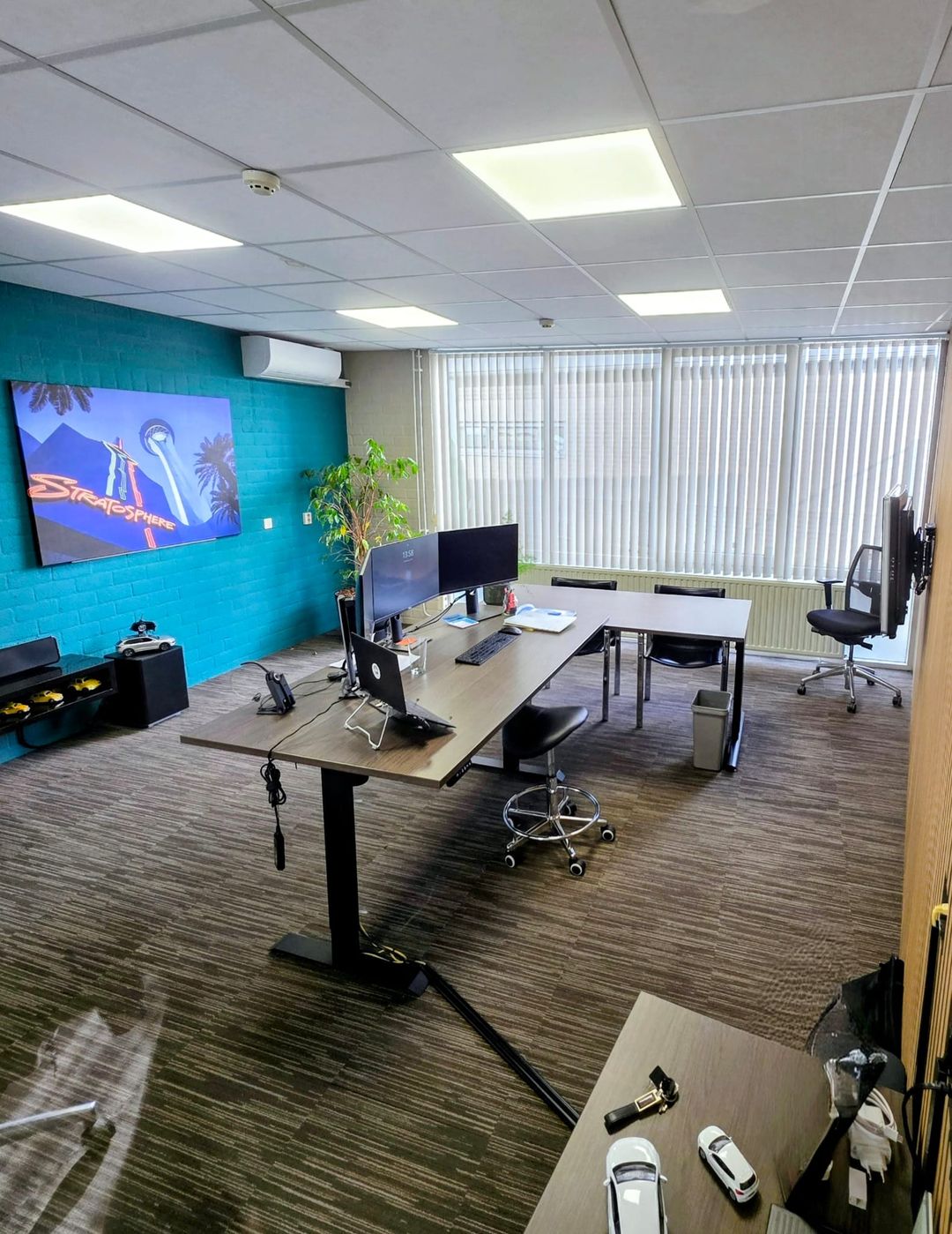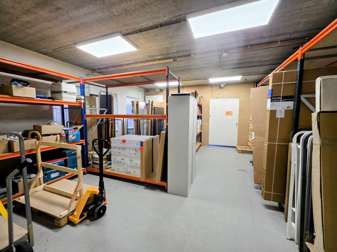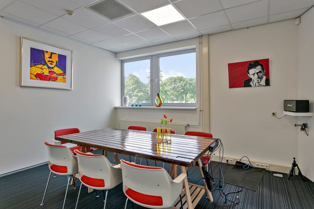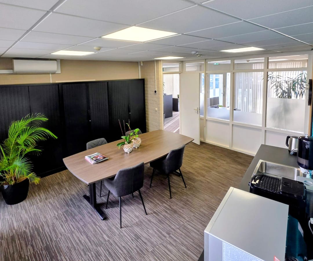 - Kantoorruimten zijn voorzien van vloerbedekking en lamellen;