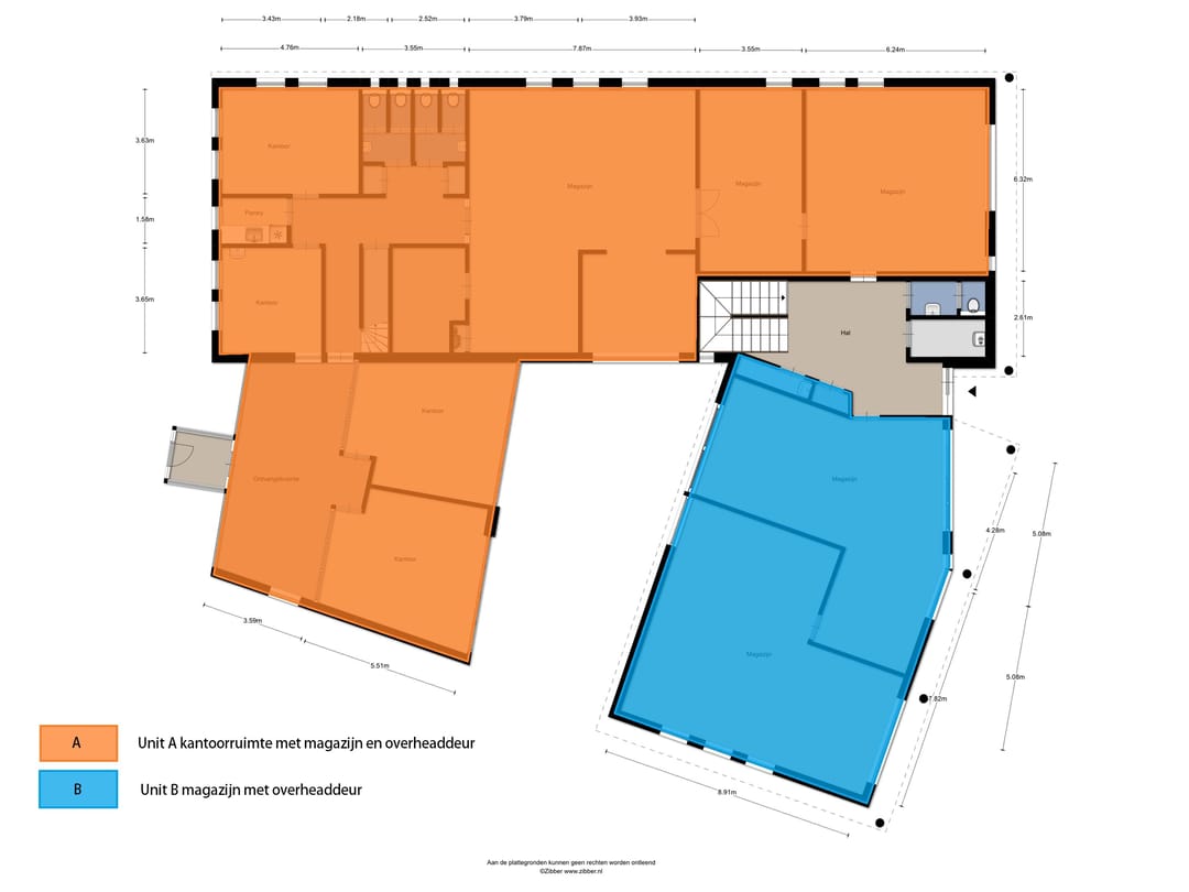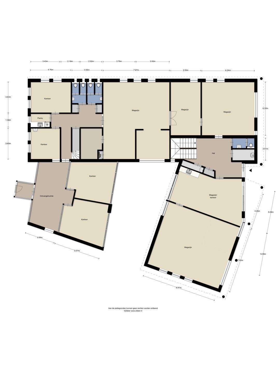 Entree, ontvangstruimte, 4-tal kantoorruimten, pantry, opslag, toiletgroepen, 5-tal magazijnruimten, hal met